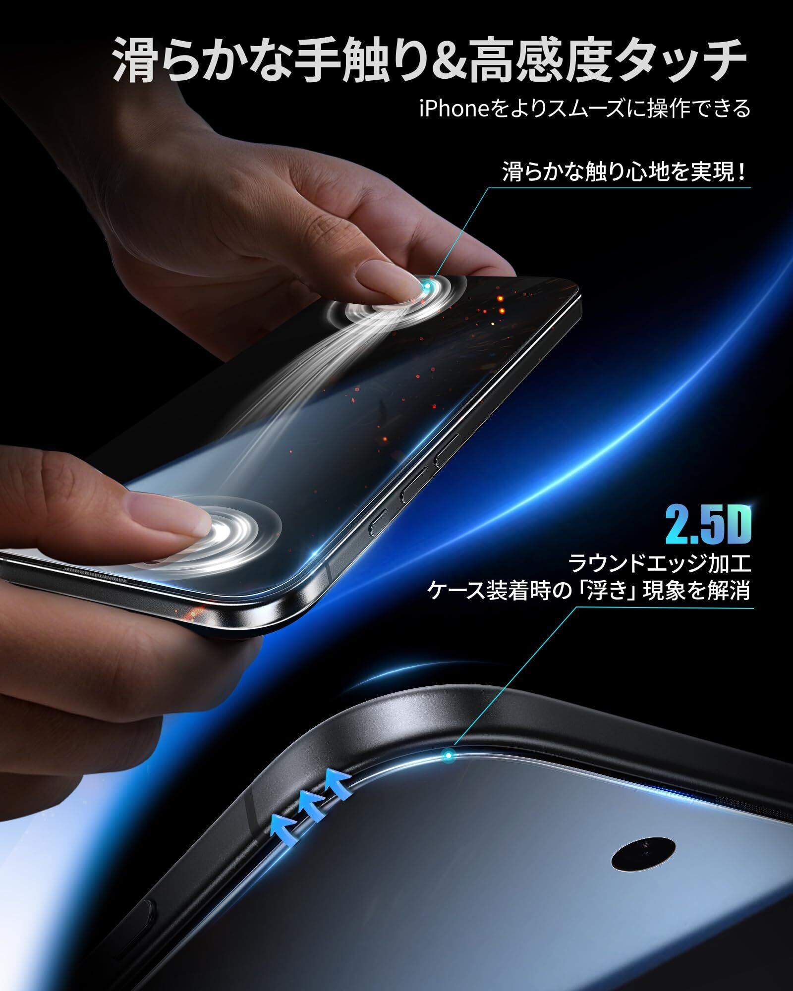 「2.5Dラウンドエッジ加工・ケースとの相性抜群」2.5Dラウンドエッジ加工が施されており、手に引っかかる感じがありません。本体の縁まで適度なスペースを残しており、装着後もスマホのデザインを損なわず、ケースとの相性も抜群です。