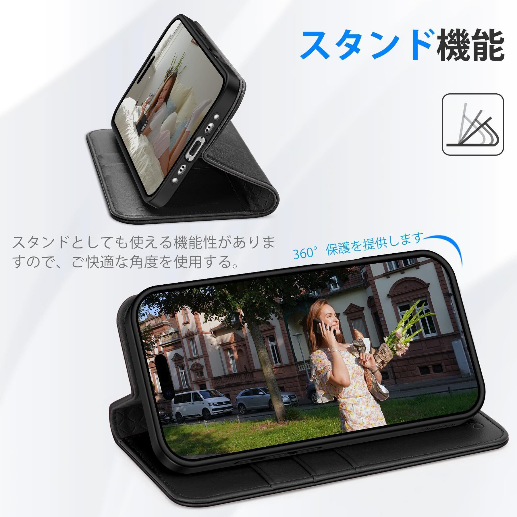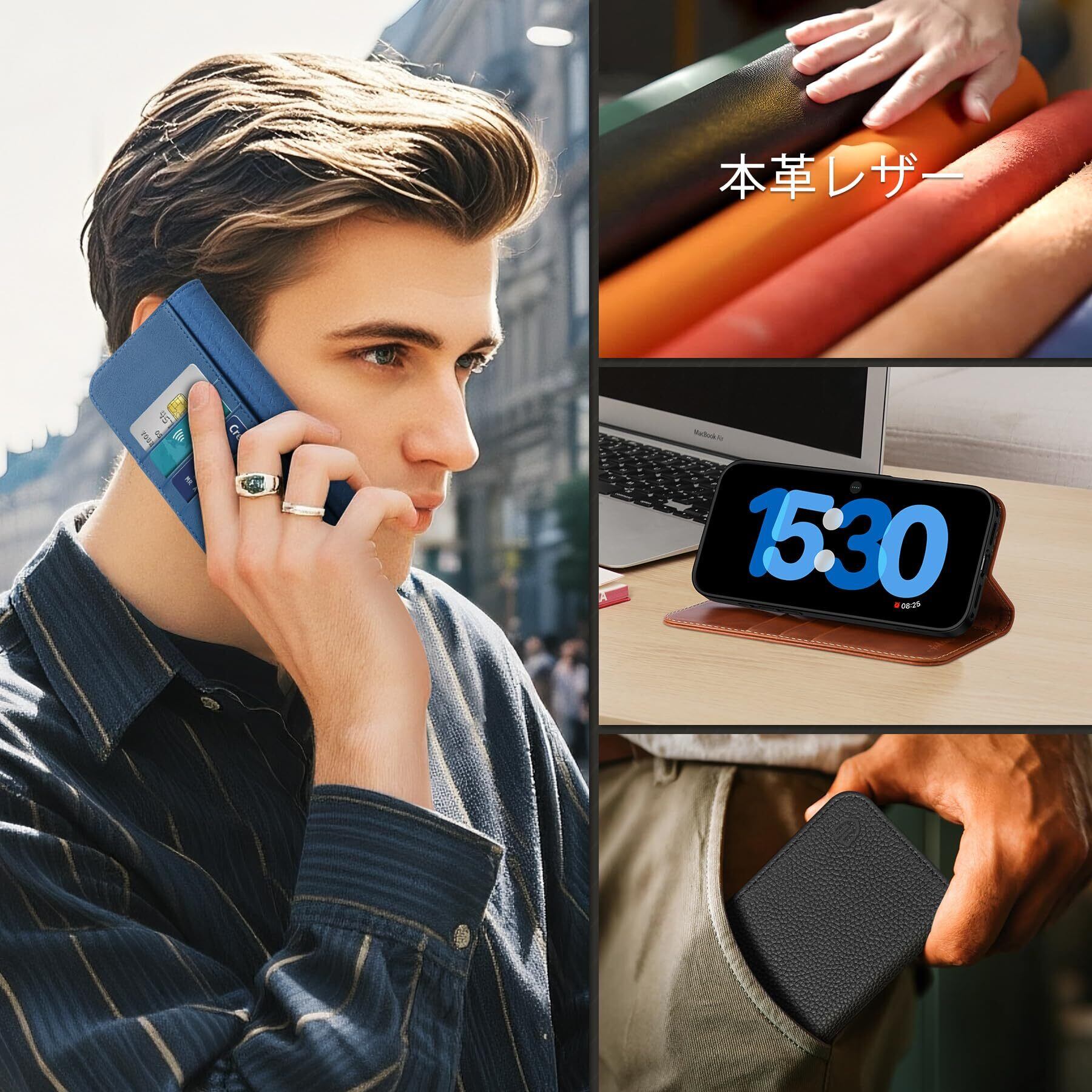【本革レザー】本商品はレザーとTPU素材の組み合わせを採用しているため、着脱が簡単で、スマホ本体をしっかり保護します。肌触りの本革レザーを使用しており、滑りにくく、指紋や油分なども付着しにくい特徴があります。時間の経過とともに、革はより滑らかで柔らかな質感へと変化していきます。画面よりもわずかに高く設計された縁により、デスクなどに置いた際にスクリーンが直接接触するのを防止。画面からレンズまで、全面を確実に保護します。ケース底面のストラップ穴により携帯性も高くします。