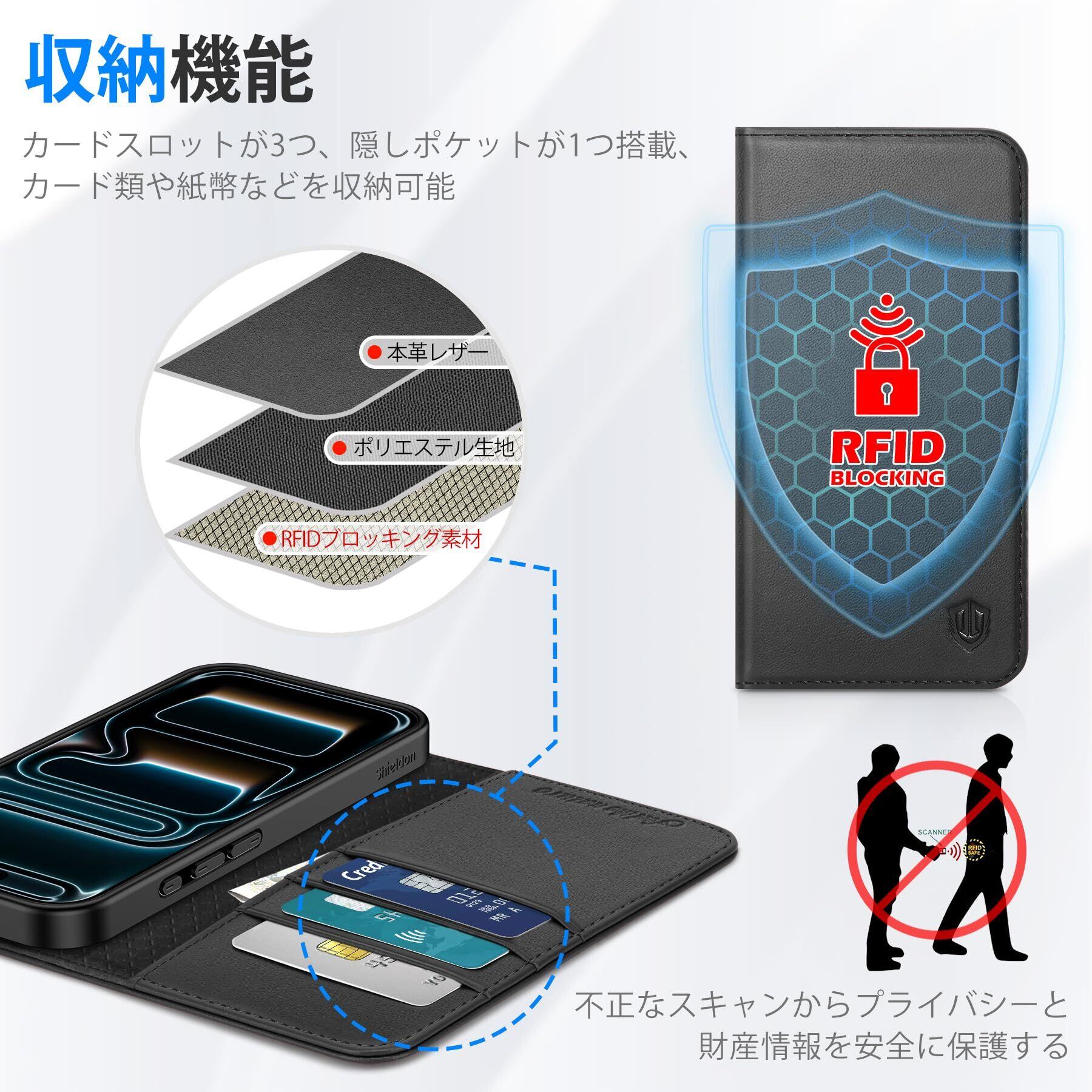 【RFIDブロッキング技術採用】本iPhone Airケースのカードスロット&ポケットの裏地には、RFIDブロッキングライニングを採用しています。先進的なRFIDブロッキング技術により、信号をブロックし、ICカードの情報や個人情報などを安全に守ります。信号がブロックされるため、カードをケースに入れたまま反応しない場合は、カードを取り出してお使いください。