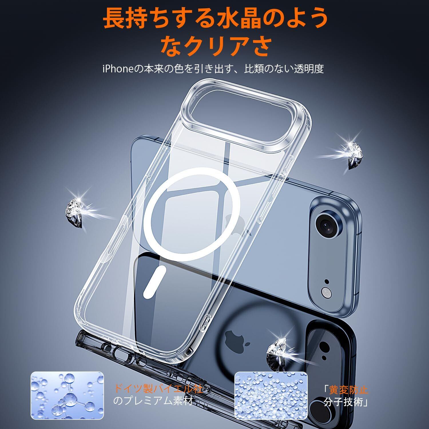 【水晶クリア&黄変防止】バイエル社製の高品質TPU・PC・アクリル背面素材を採用。ナノ酸化防止コーティングにより指紋・皮脂・汚れを防ぎ、長期間使用しても黄ばみやベタつきがありません。iPhone 17 Air 本来の美しさをクリアに保ちます。