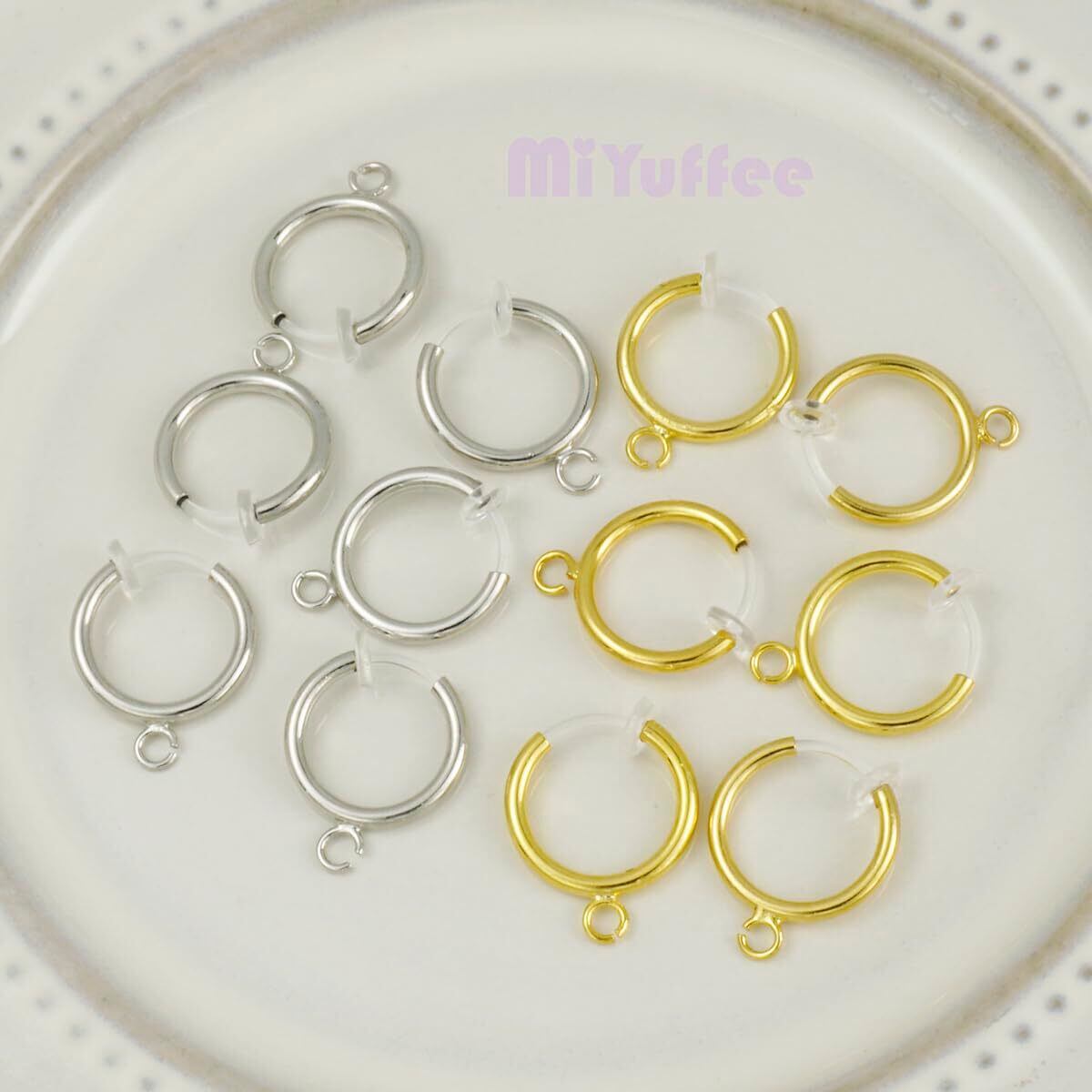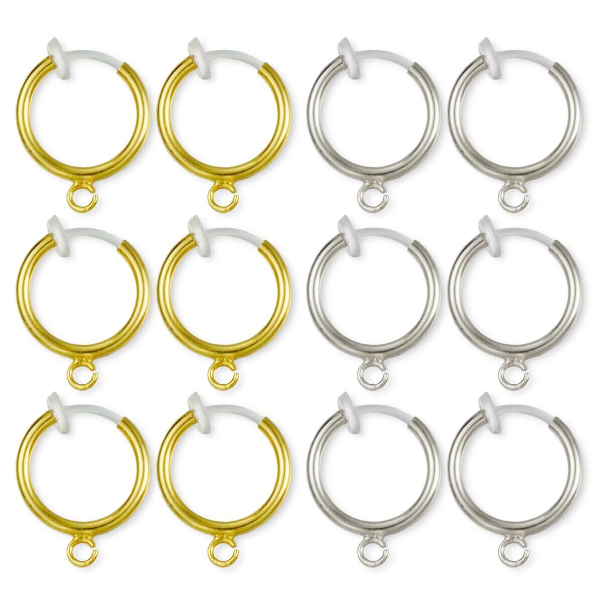 シンプルなリングにカンが付き、樹脂バネ式のフープイヤリングパーツです。ゴールド、シルバーが2色揃え、合計6ペアのセットです。クリアの樹脂バネは低アレルギー性で、「エンドレス」フープピアスのように見せることができます。ピアスホールの開けない方にも、お子供様にもオススメです。