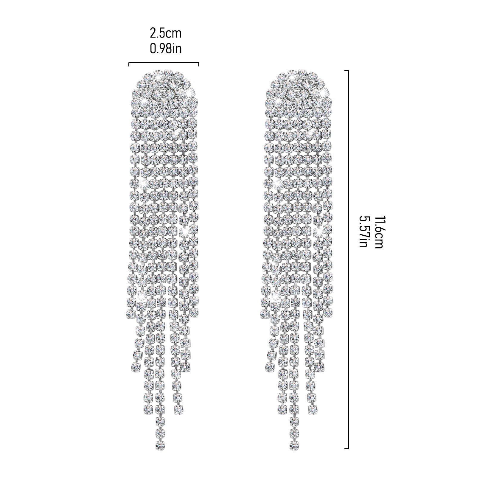 女性用クリップオンイヤリング、LucBuy ラインストーン タッセル ドロップ ダングル イヤリング シルバー イヤリング、軽量非ピアスロングクリスタルフリンジイヤリングジュエリー結婚式プロムパーティー用 (B1)