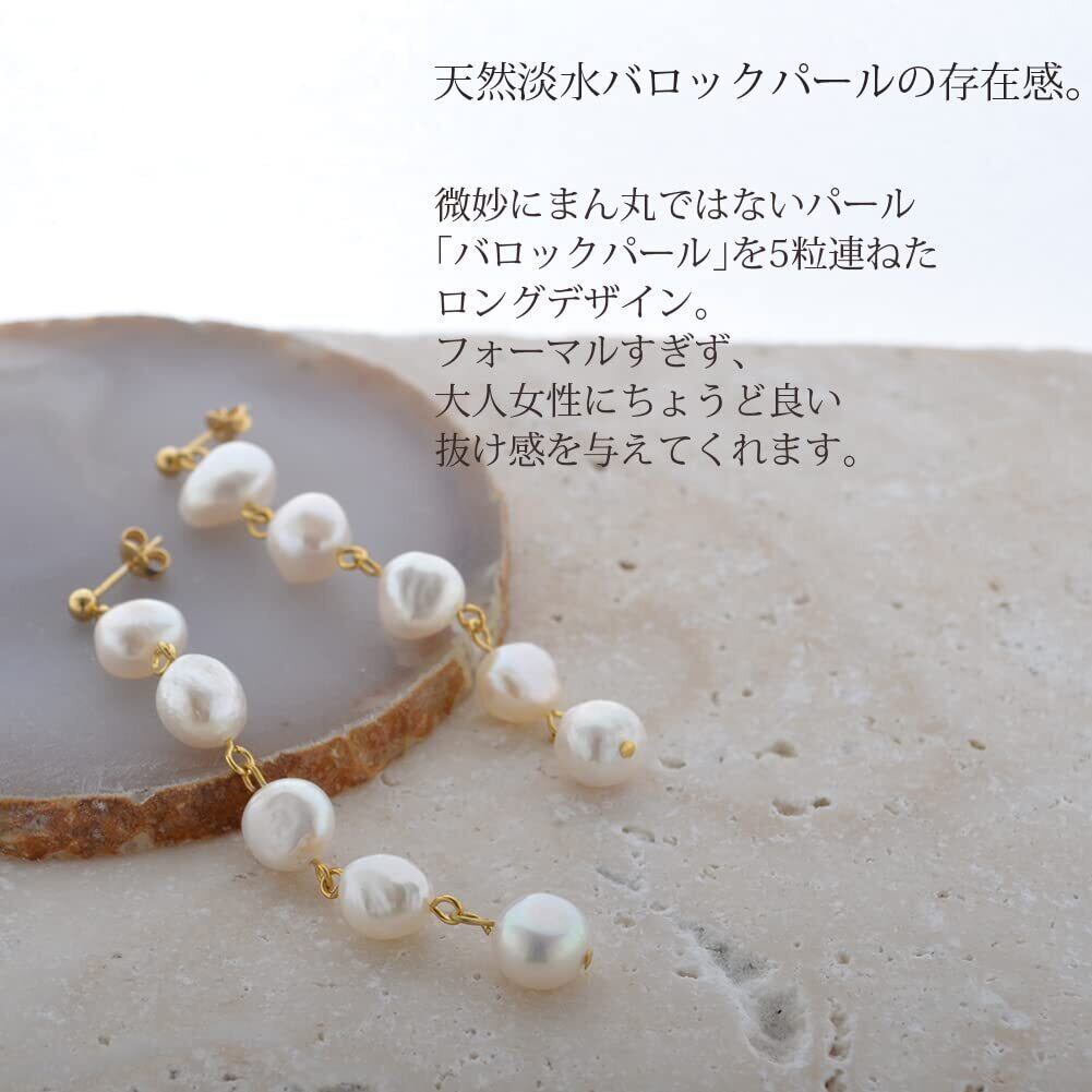 【天然淡水バロックパールの存在感】 微妙にまん丸ではないパール「バロックパール」を5粒連ねたロングデザイン。丸玉でない、一つひとつが異なる個性を持つ玉を使用することで生まれる意外性は、大人女性にちょうど良い抜け感。