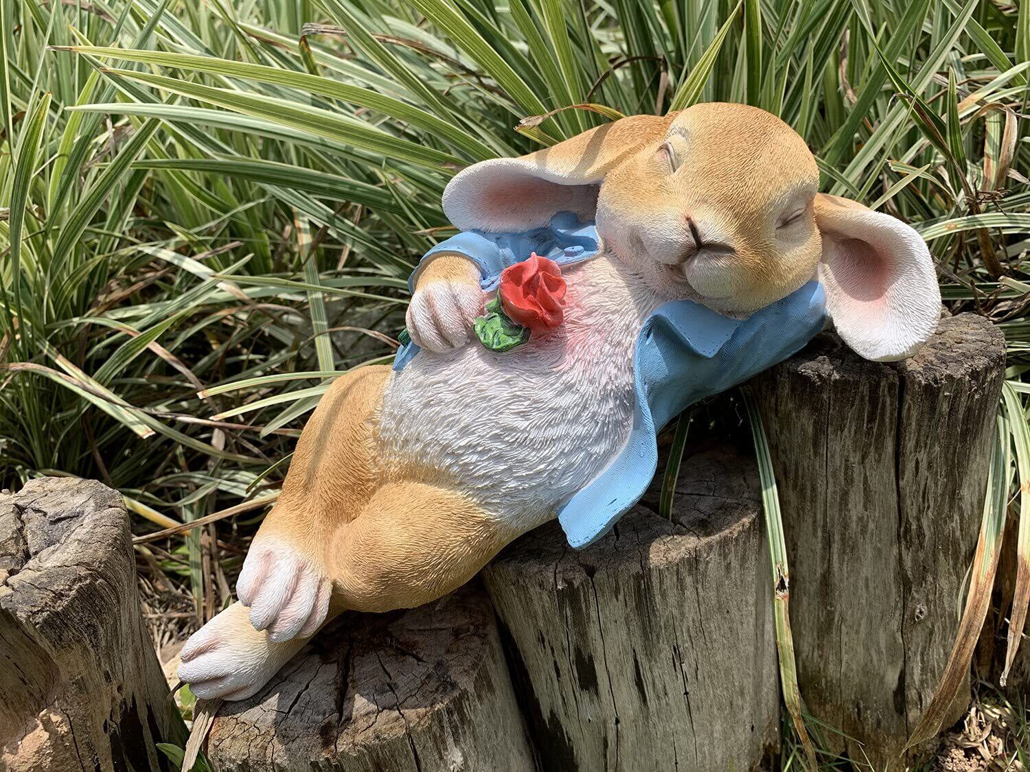 青いウサギの庭の彫刻のサイズ:11.8 x 5.3 x4.5インチ。ユニークで魅力的な横臥の姿勢は、より親密な雰囲気を作り出し、彼は女の子を待って、一緒にバレンタインデーを楽しんでいるように見えます。