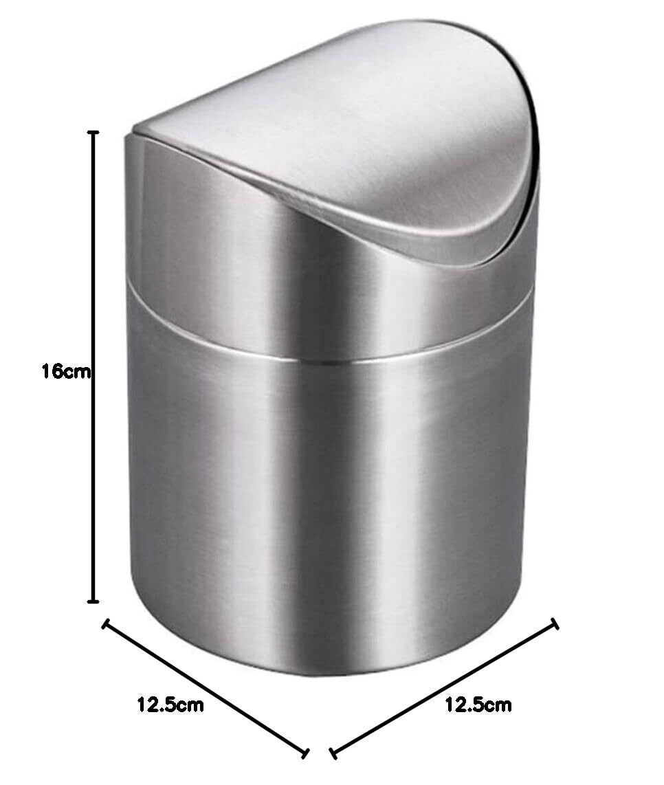 直径12.5cm、高さ16cmと小型で場所を取らない。 オフィスや自宅のデスクトップで使用できるステンレス製のミニデスクトップゴミ箱。