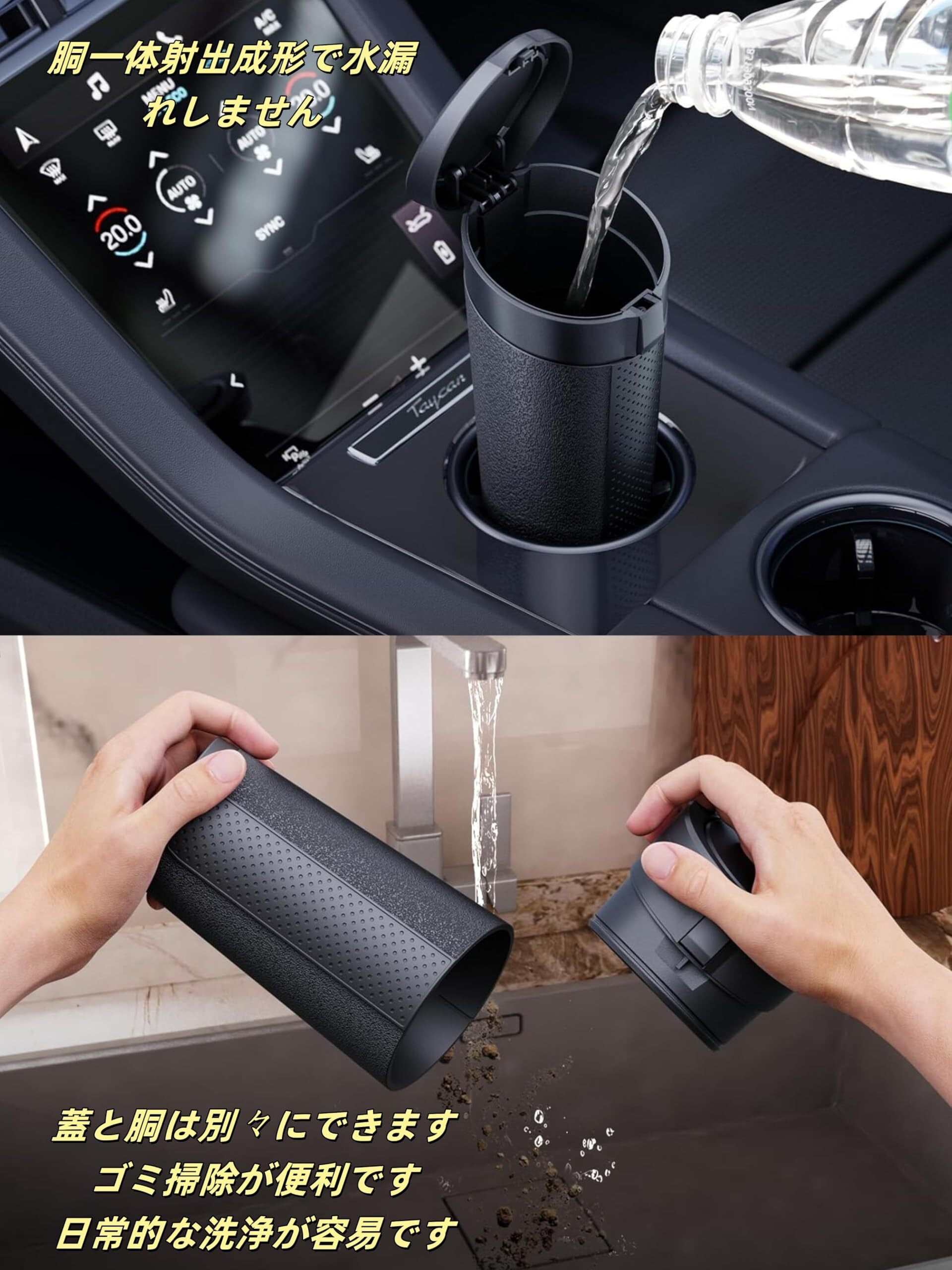 漏れ防止と使い勝手:後部座席のゴミ箱には2つのデザインオプションがあります。フタを開けて、ゴミをゴミ箱に入れるだけです。あるいは、軽く押してゴミ箱に投げれば、自動的にフタが閉まります。上質の漏れ防止素材でできており、液体廃棄物があっても、こぼれたり汚れたりすることがありません