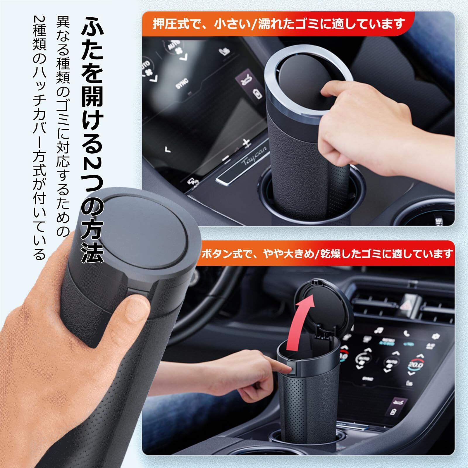 【静音設計でドライブ中も快適】 「車が揺れるたびにカチャカチャ音がする…」本体には減衰TPE素材を使用し、カップホルダーとの接触音を抑制。さらに小ゴミ専用スロット+広口ボタンを搭載し、ウェットティッシュや果物の皮なども静かに捨てられます。静かな車内で運転に集中できます。