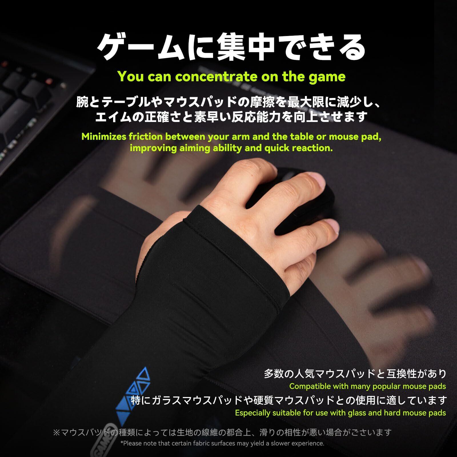 【よりゲームに集中できる】低摩擦素材の採用により、腕とテーブルやマウスパッドとの摩擦を軽減し、エイム動作を行う前腕部とマウスパッドとの滑りを滑らかにし、操作性を高めることができます。多数の人気マウスパッドと互換性があり、特にガラスマウスパッドや硬質マウスパッドとの使用に適しています。