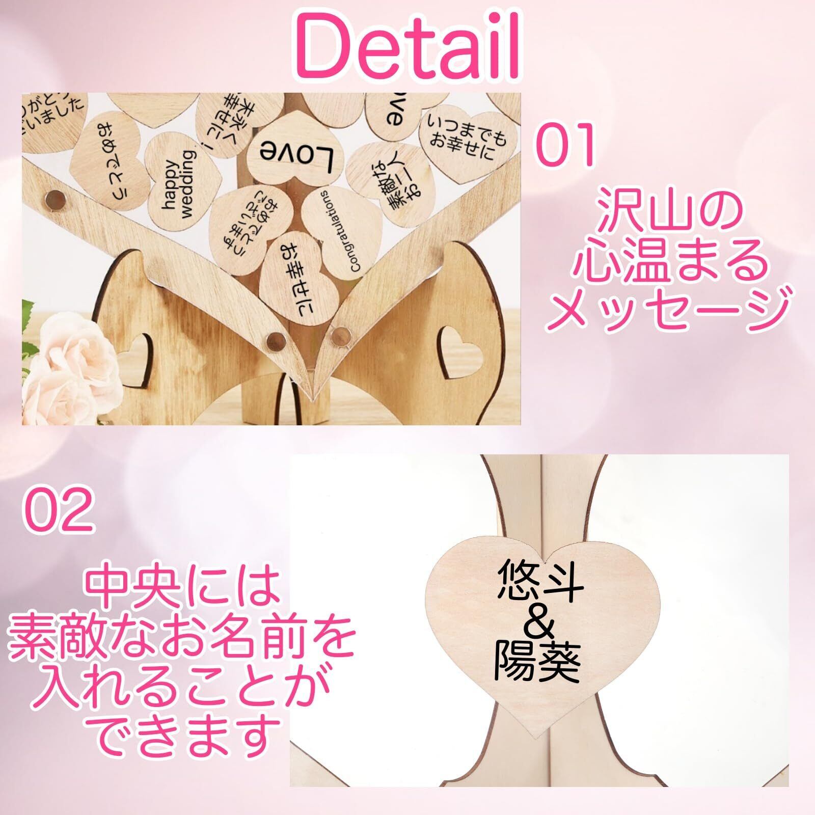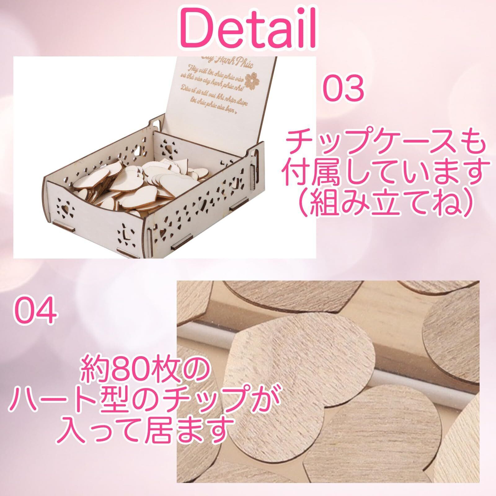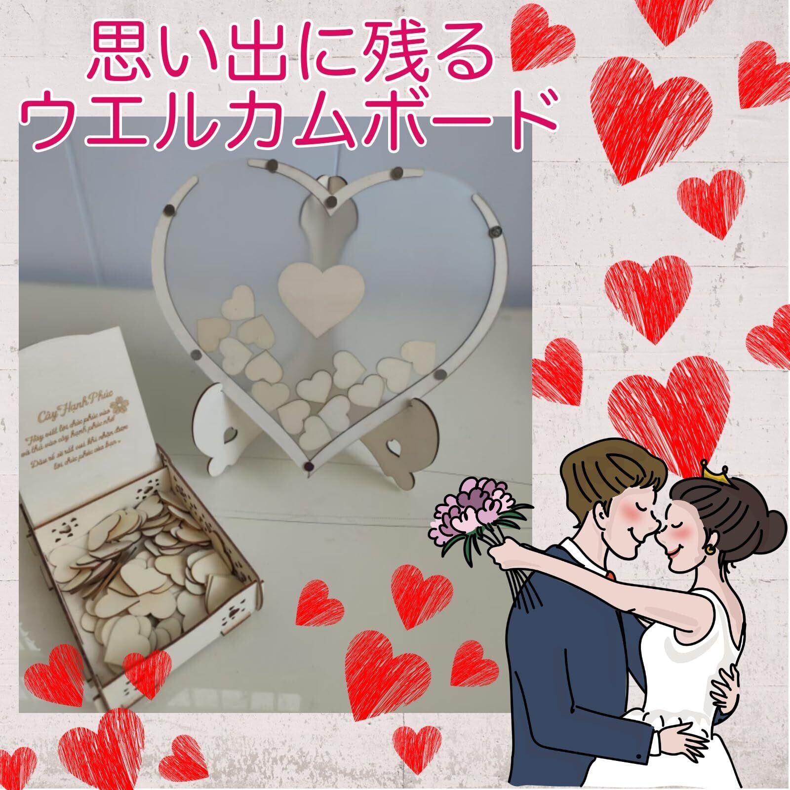 【参加型で思い出に残る演出】ゲストがハート型の木製チップにメッセージを書き込んでボードに入れる参加型のウェルカムボードです。結婚式やパーティーで、ゲストの心温まる言葉をカタチに残せます。