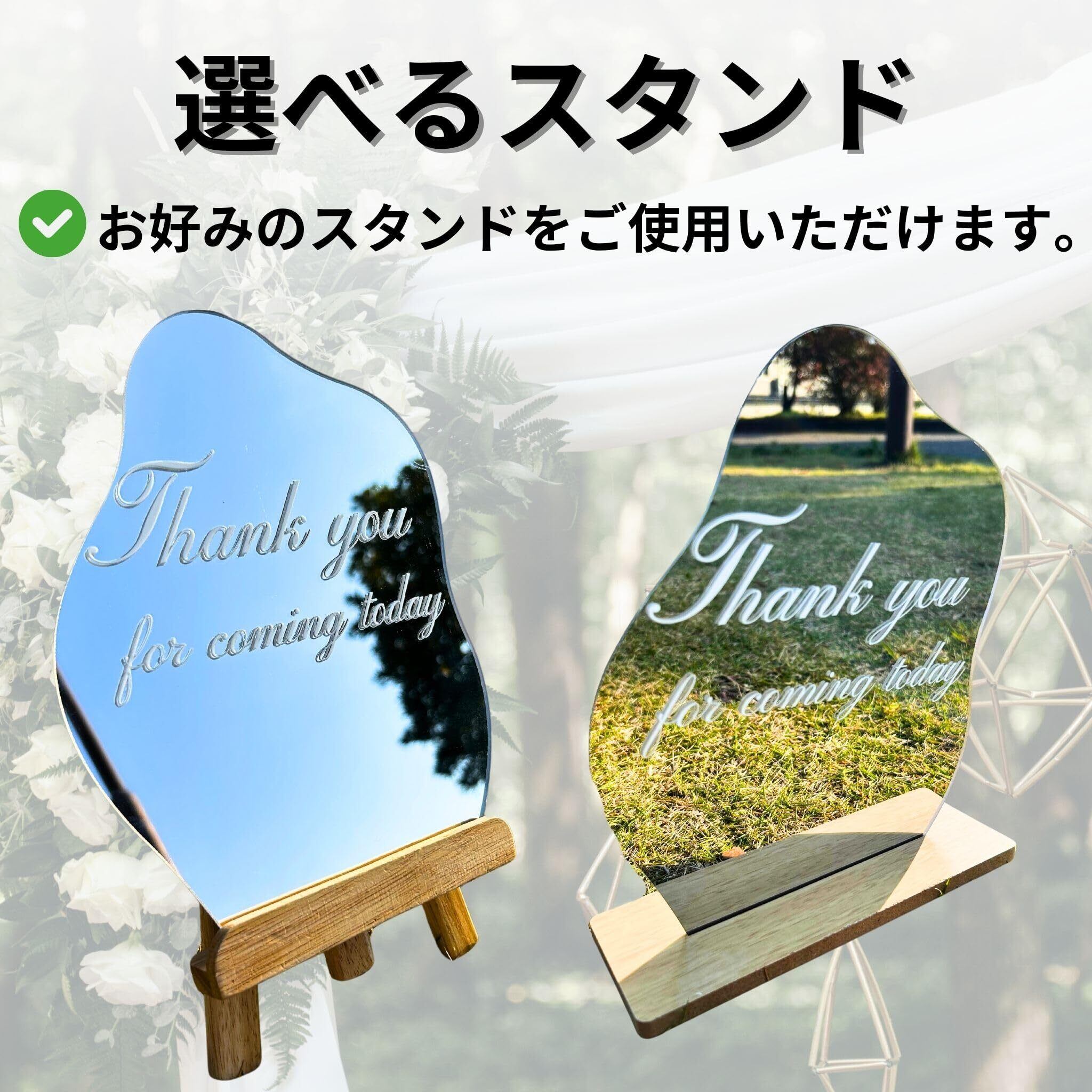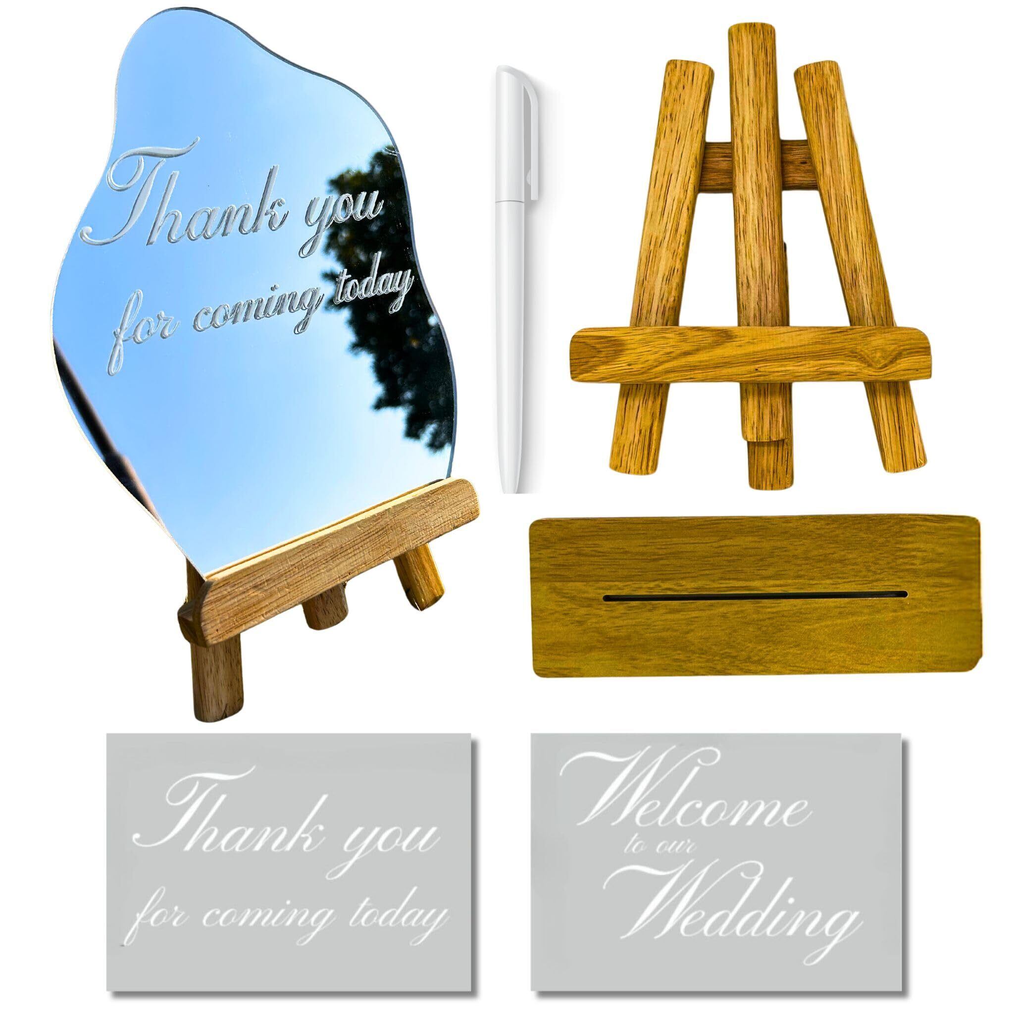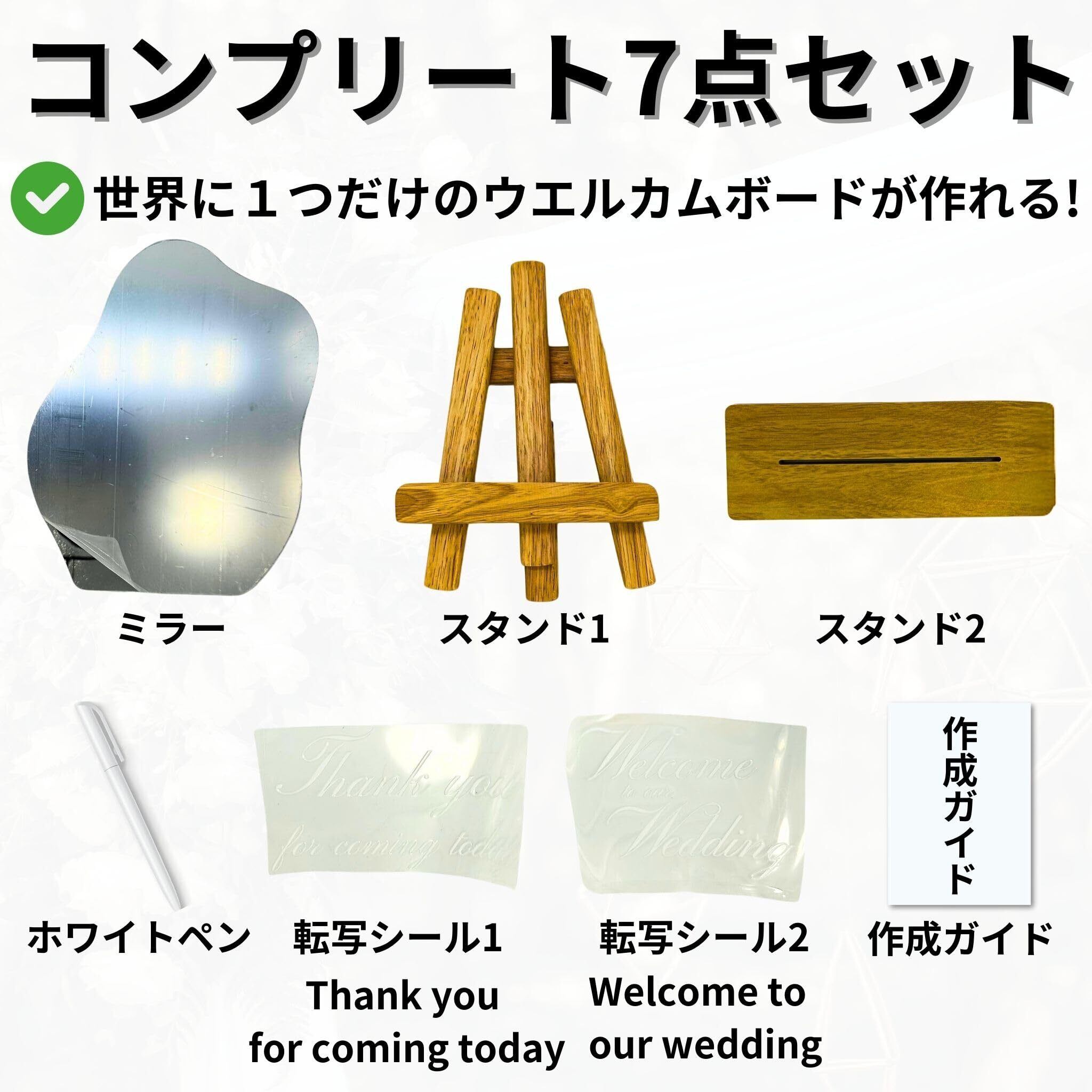 (コンプリートセット)このセットには、ウェーブ形状のミラー1枚、2種類の転写シール、2種類のスタンド、ホワイトペン、そして、説明書が含まれています。これらのアイテムを組み合わせることで、自分好みにカスタマイズできます。転写シールには「Welcome to our Wedding」と「Thank you for coming today」の2種類があります。さらに、付属のホワイトペンで日付や名前を書き入れることで、世界に一つだけのウェルカムボードを作成できます。