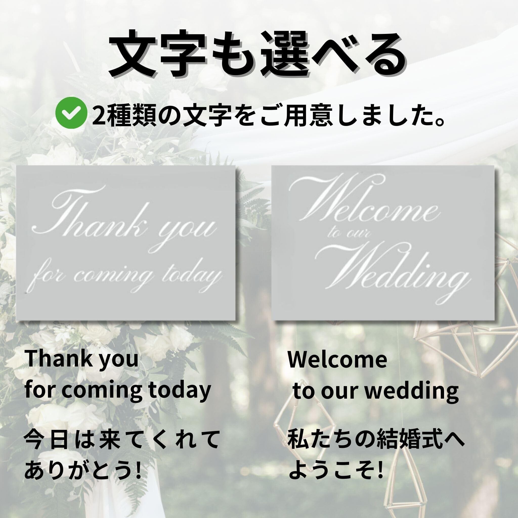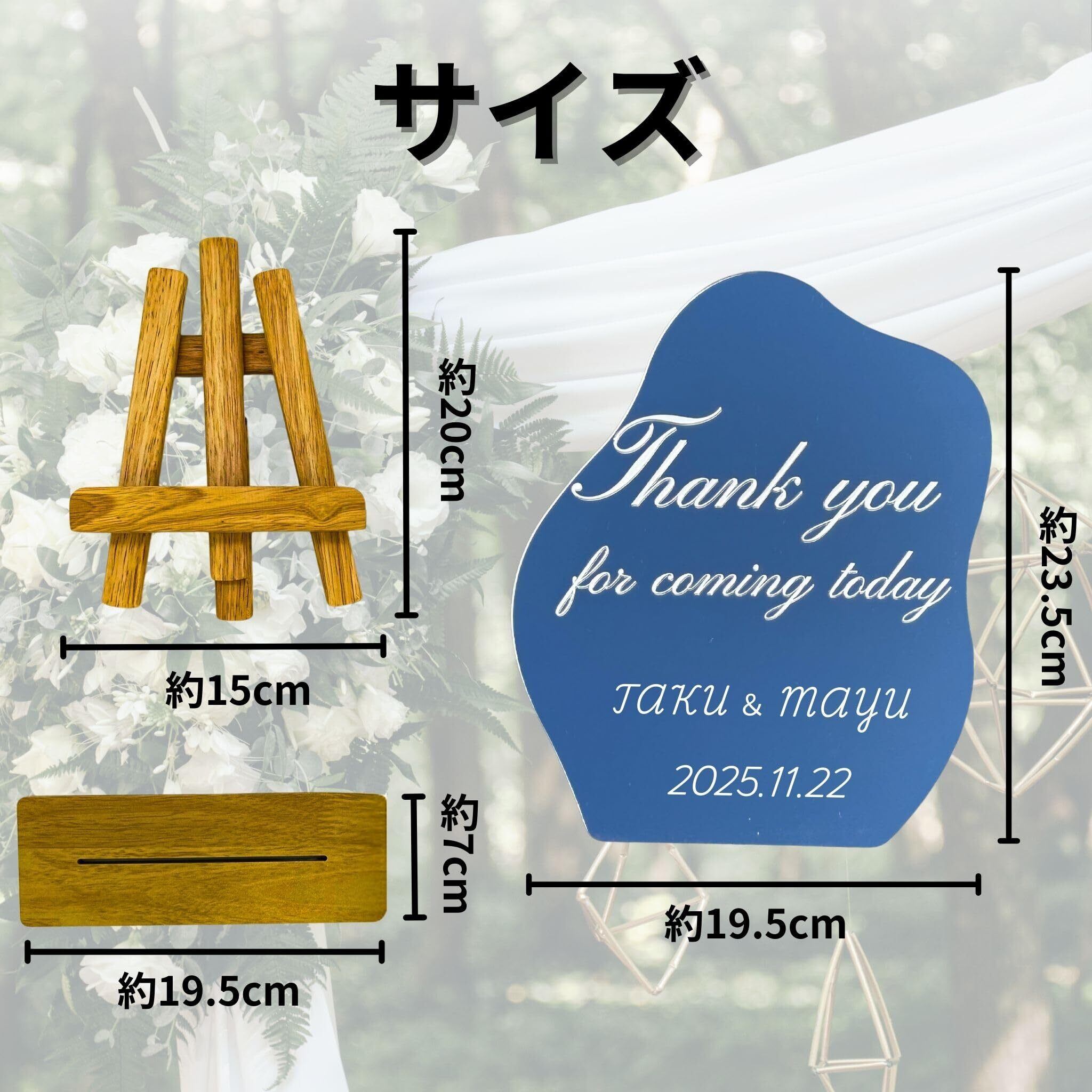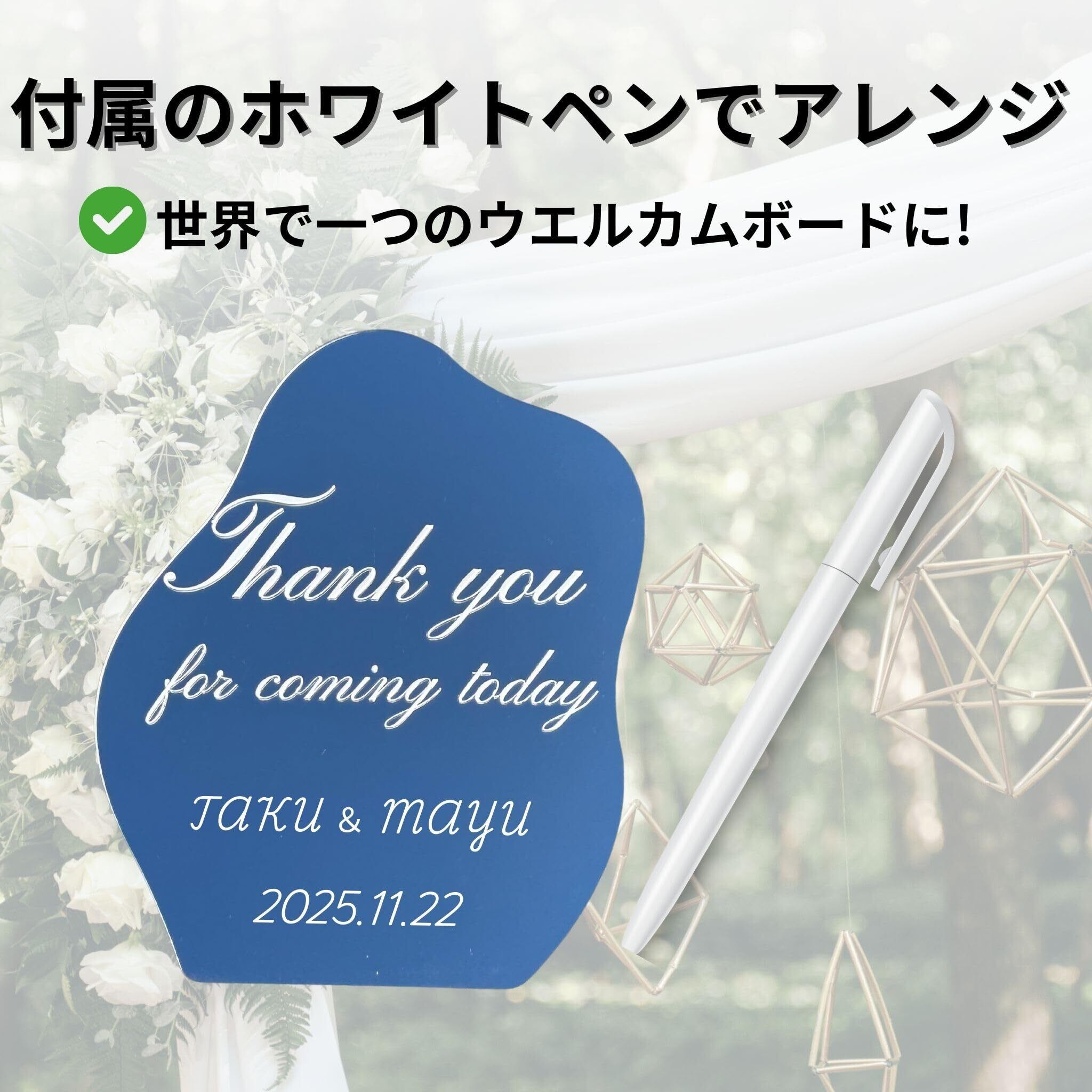 (コンプリートセット)このセットには、ウェーブ形状のミラー1枚、2種類の転写シール、2種類のスタンド、ホワイトペン、そして、説明書が含まれています。これらのアイテムを組み合わせることで、自分好みにカスタマイズできます。転写シールには「Welcome to our Wedding」と「Thank you for coming today」の2種類があります。さらに、付属のホワイトペンで日付や名前を書き入れることで、世界に一つだけのウェルカムボードを作成できます。