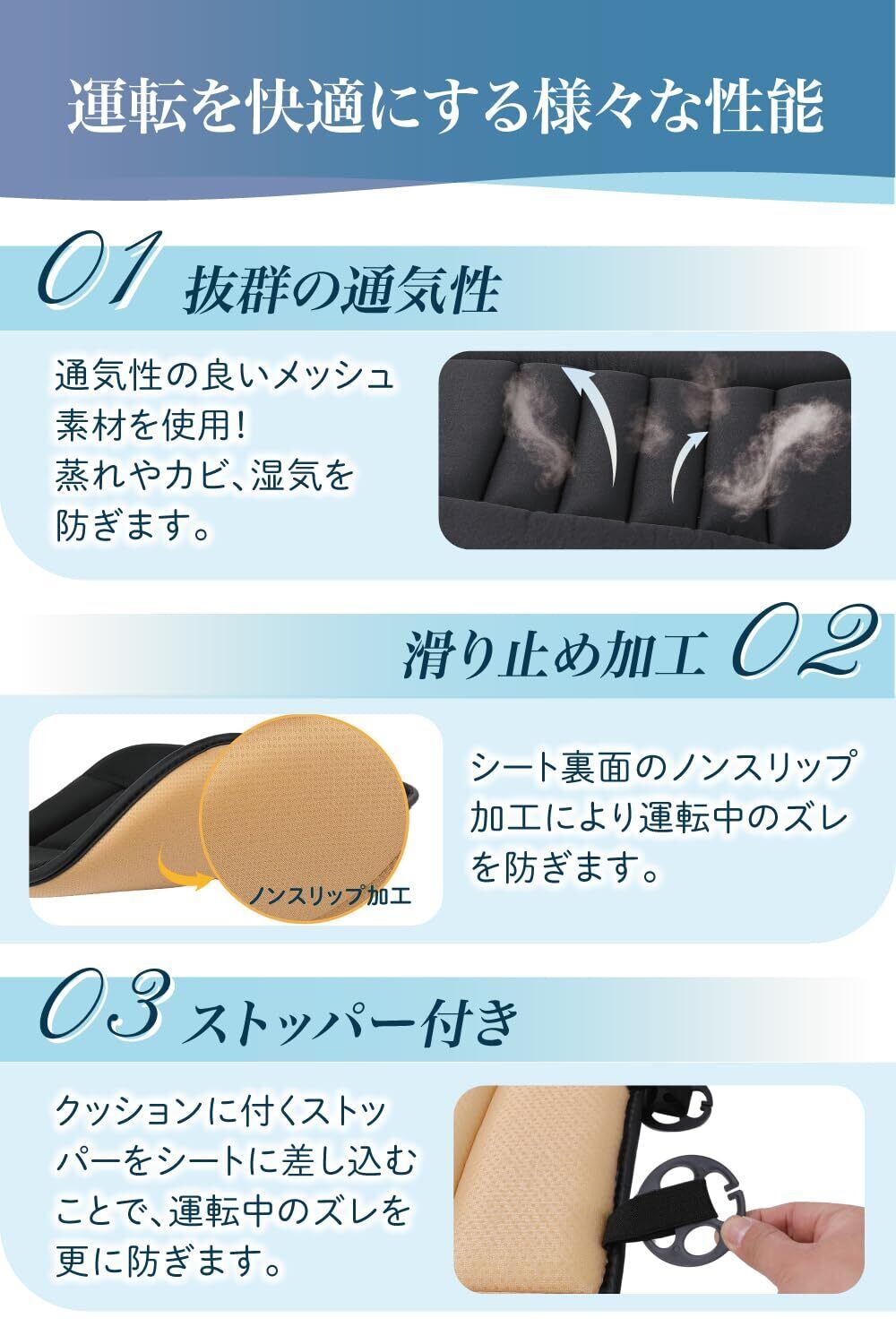 【滑り止め&ストッパー付き】シートクッション裏面には滑り止めシリコンラバーを使用しており、シートクッション後部には車の座面と背もたれの間に差し込んで使うストッパーが付いています。運転中もクッションがズレない工夫がされているため快適に運転することが可能です。