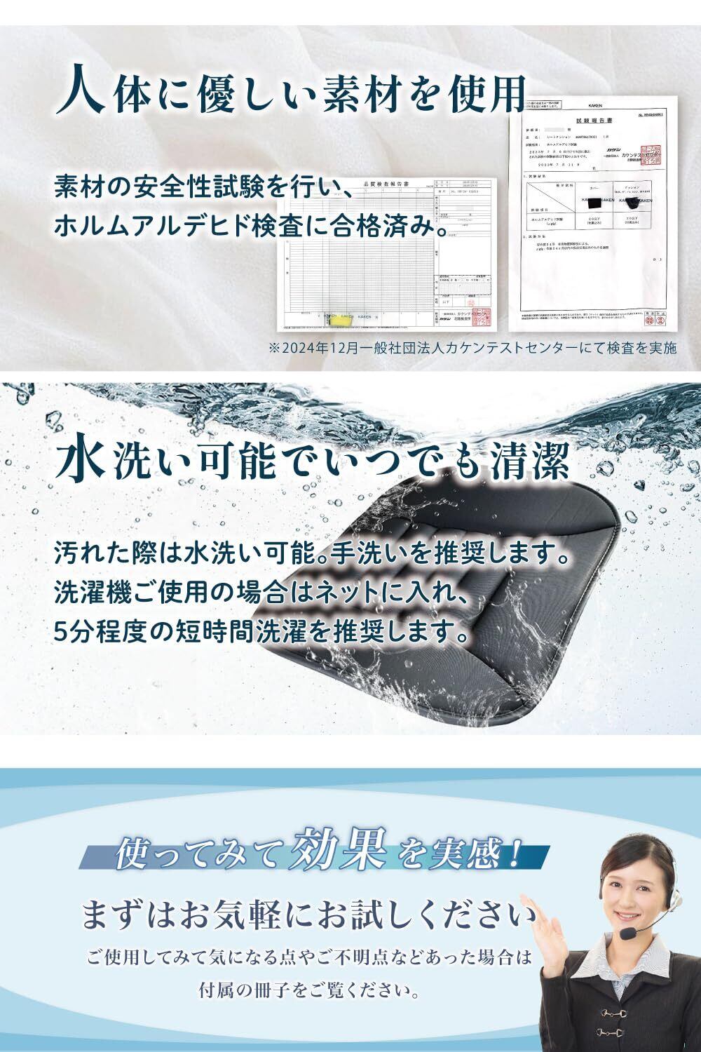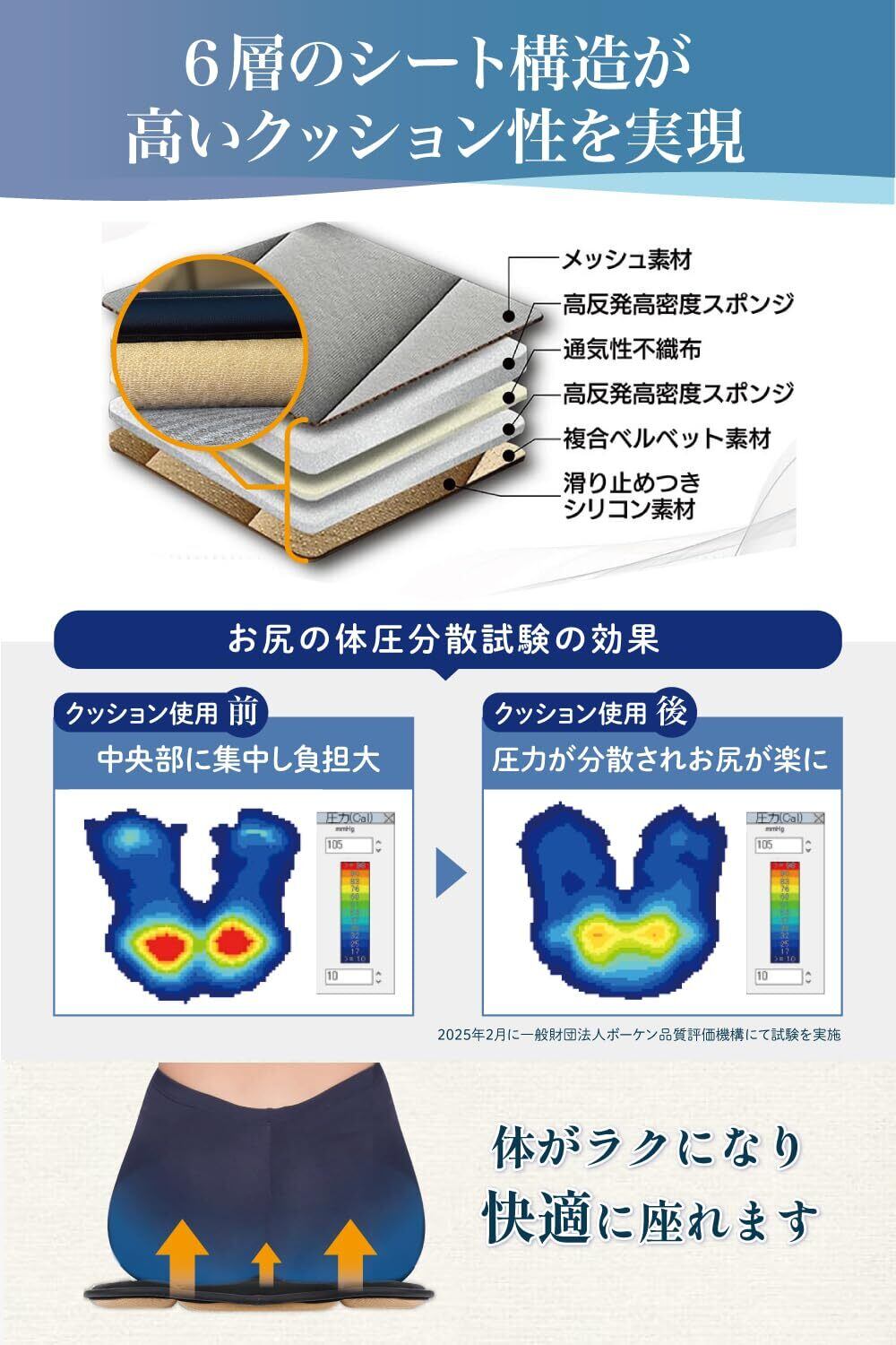 【体圧分散試験にて効果実証済み】一般財団法人ボーケン品質評価機構にて体圧分散試験を済ませております。シートクッションを使用することでお尻への圧力が分散されて負担を軽減する効果が認められております。※2025年2月に検査を実施
