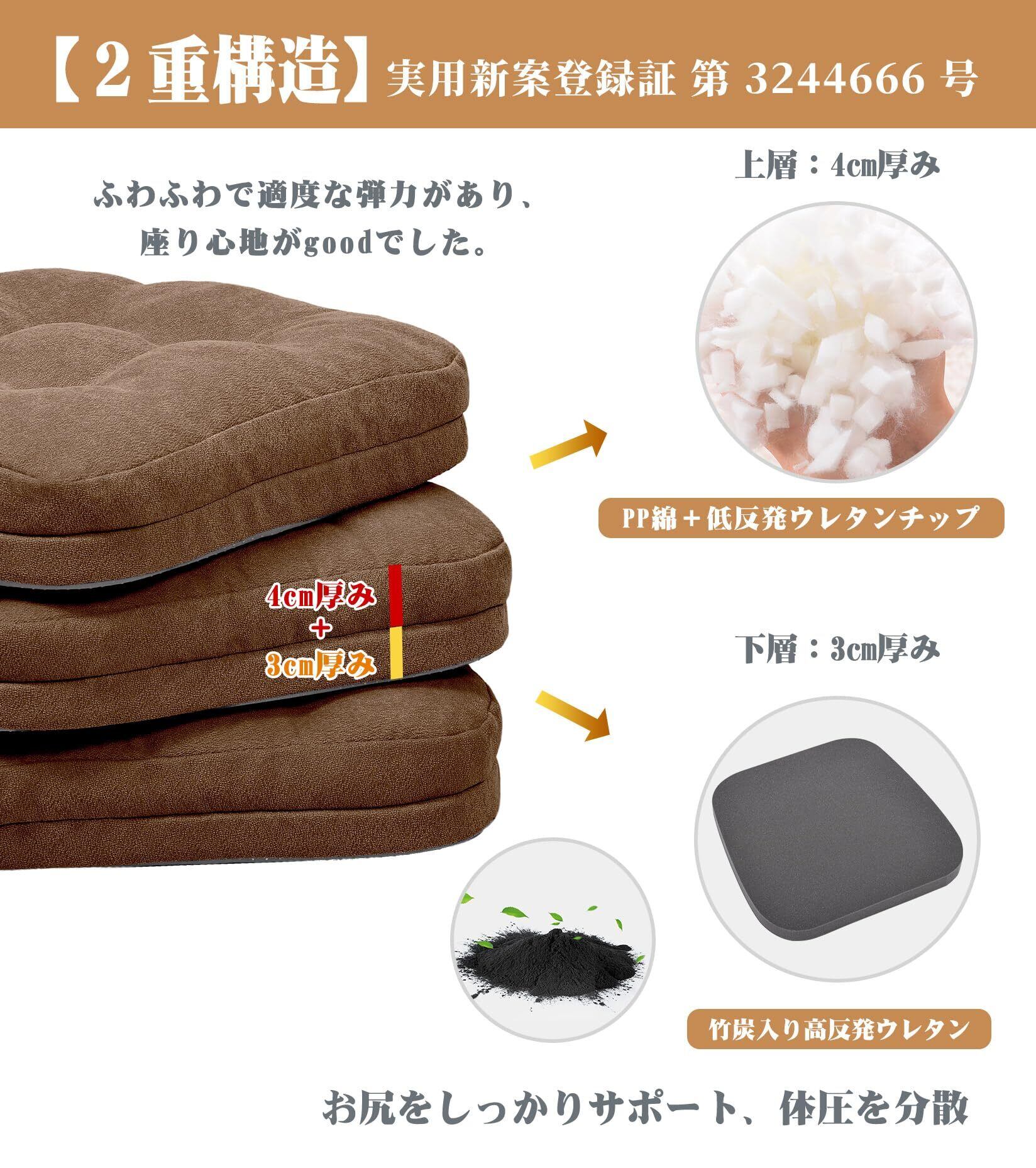 【2重構造】上層に4cm低反発ウレタンチップ+下層に3cm竹炭入り高反発ウレタンを使用(実用新案登録証 第 3244666 号)。上層ふわふわで、ゆっくりお尻にフィット、圧力を分散します。下層はやや硬いで、しっかりと体を支え、底付き感はなし。座布団クッションは低反発・高反発を兼ね備えた弾力とフィット感、長時間座ても疲れにくい。