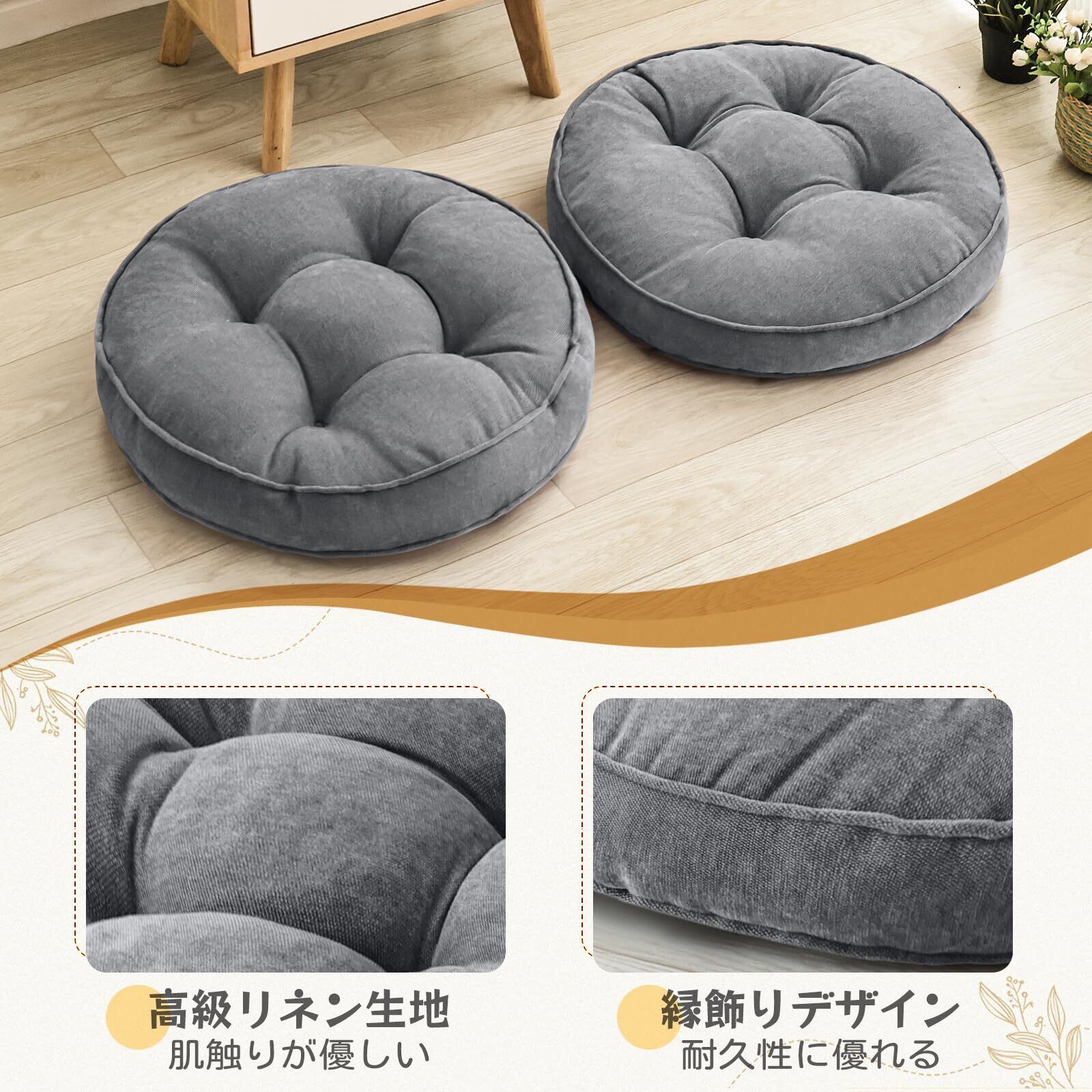 【高級リネン風生地】クッションには、上質なリネン風生地を使用しており、起毛や色褪せがありません。豊富なカラーバリエーションからお選びいただけ、ソファ横に置けばナチュラルな雰囲気に、和室ではモダンなアクセントとしてお部屋の雰囲気を引き立てます。
