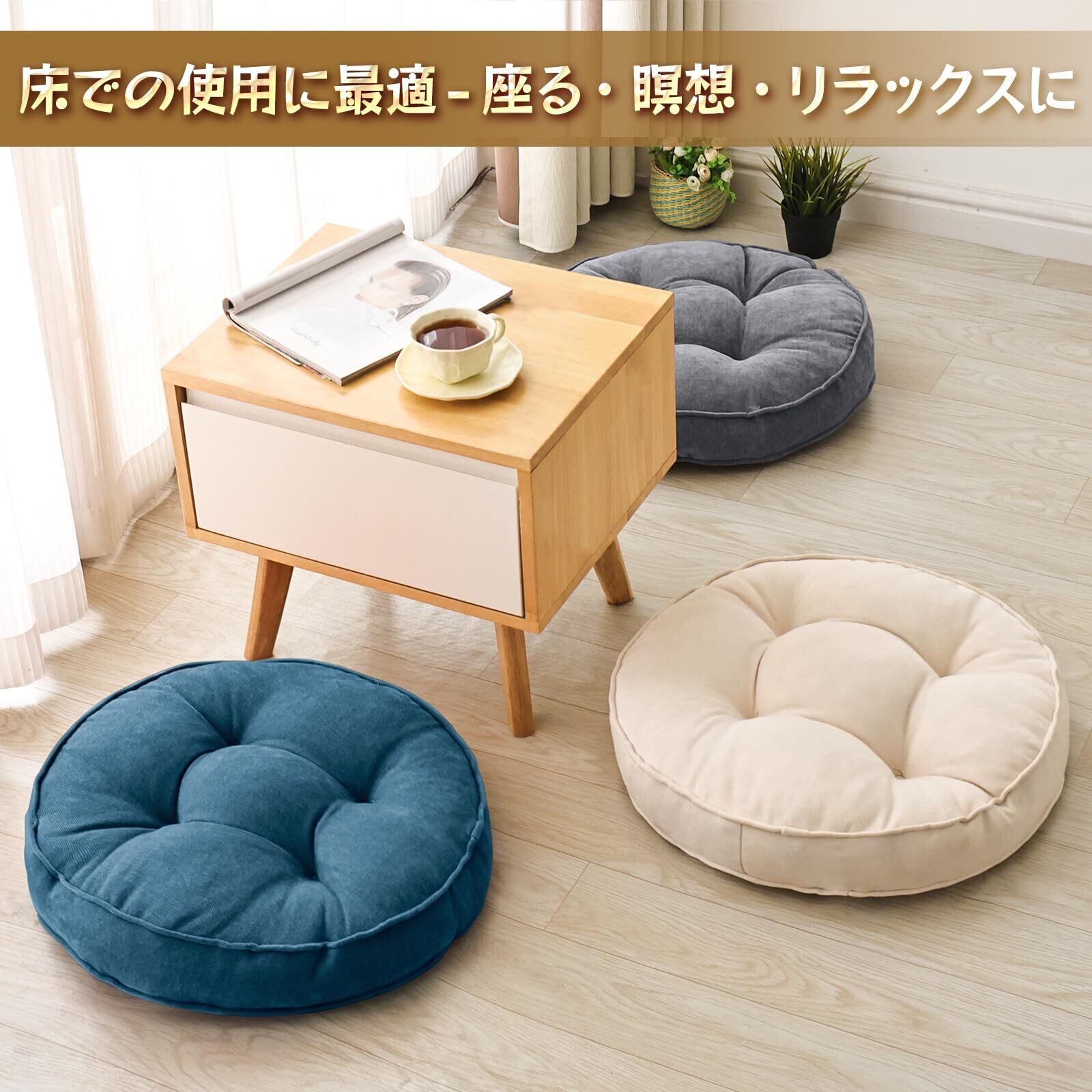 【さまざまなシーン対応】サイズ約55×55cm、厚さ約8~10cmの大型座布団。リビングでテレビ鑑賞、バルコニーで読書、オフィスでの休憩、車内やアウトドアなど、さまざまなシーンで活躍。硬い床や椅子の感触を気にせず、大人からお子様まで快適にお使いいただけます。