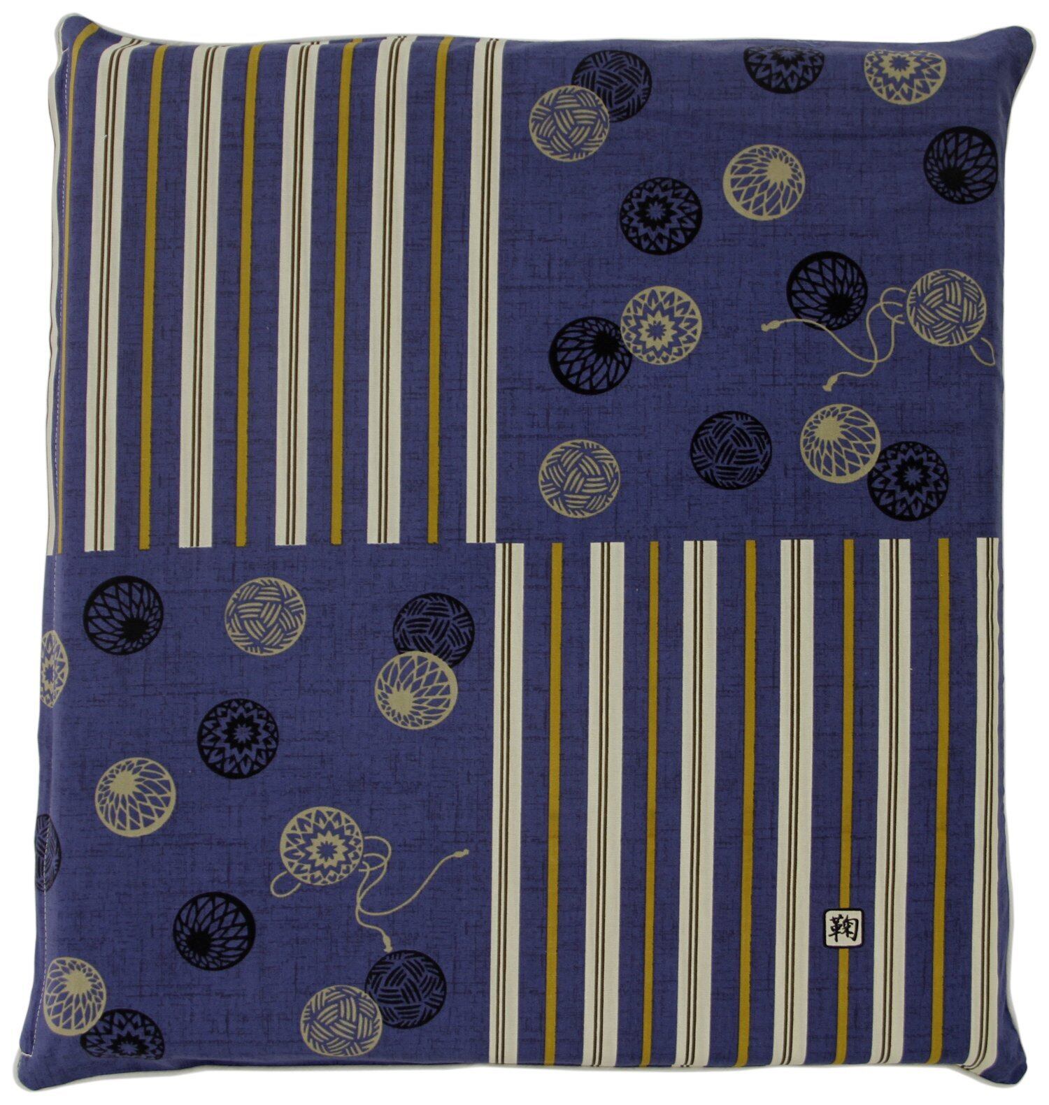 綿100%生地を使用した座布団カバー。遊び道具のモチーフである「手毬」とシャープな「縞」柄で和モダンな印象を与えているので和室はもちろん 「洋室続きの和室」の部屋で使用しても取り入れやすいです。また「手毬」は新年のモチーフなので新居や新年用のタイミングで買い替えるのも。