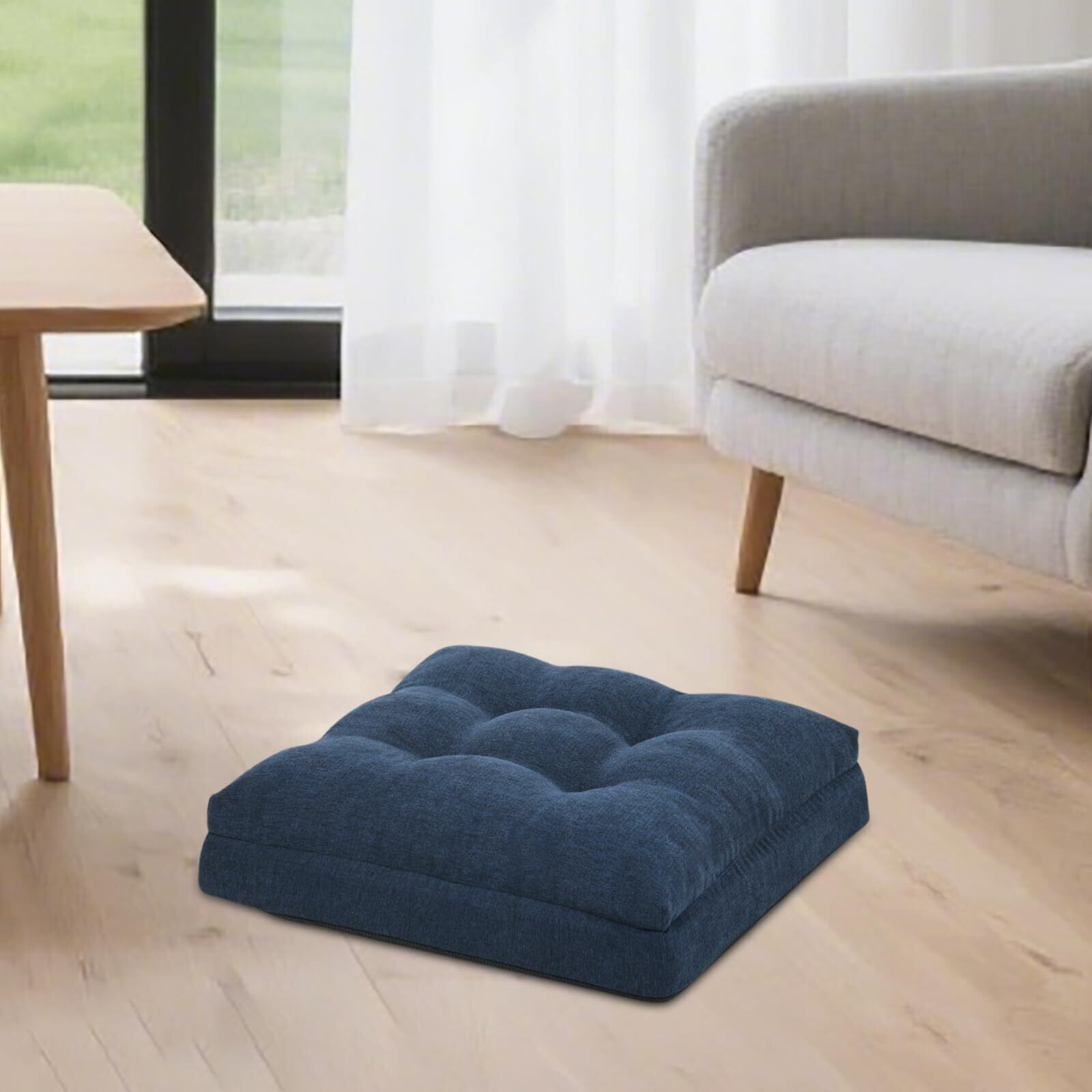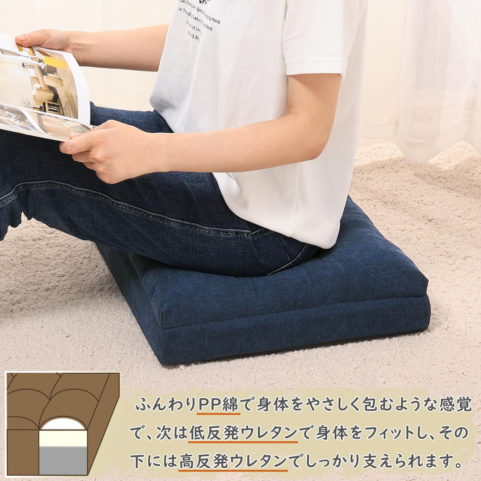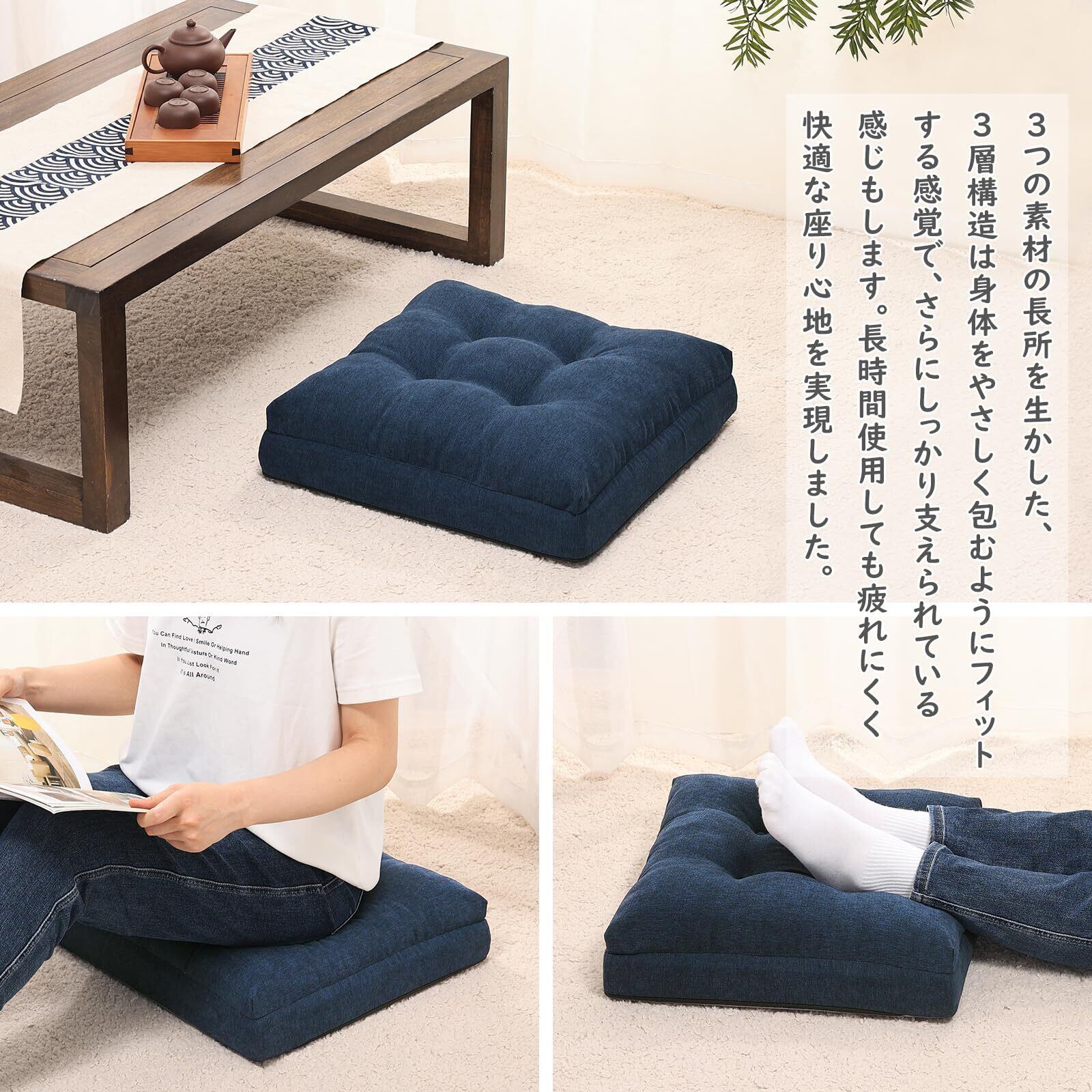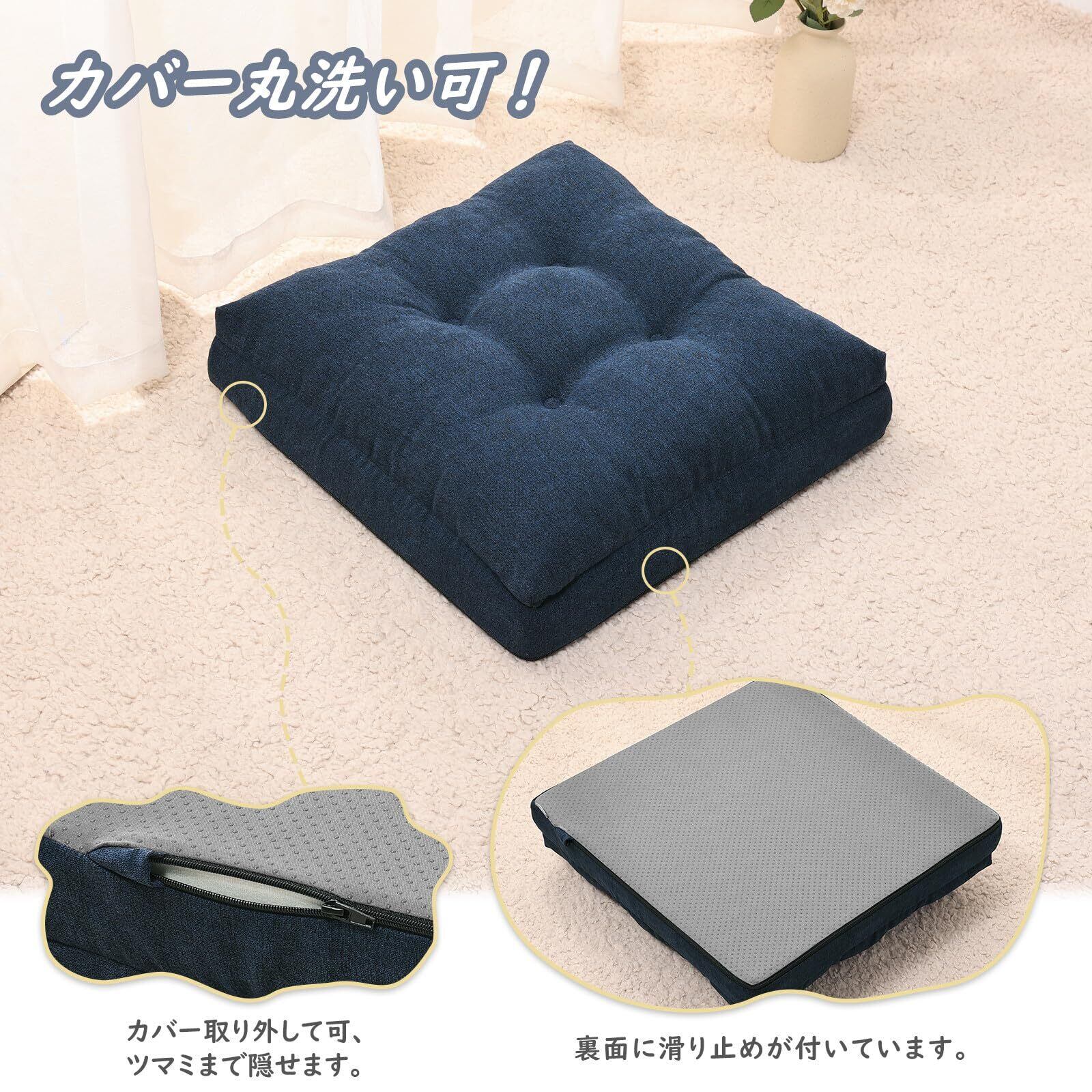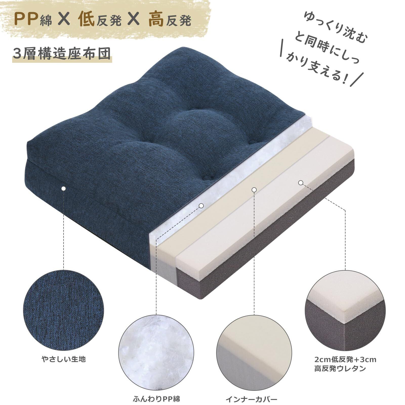 座布団 低反発+高反発 クッション 椅子 ざぶとん 厚め カバー洗える フロアクッション 42角 おしゃれ ネイビー 新型3層構造