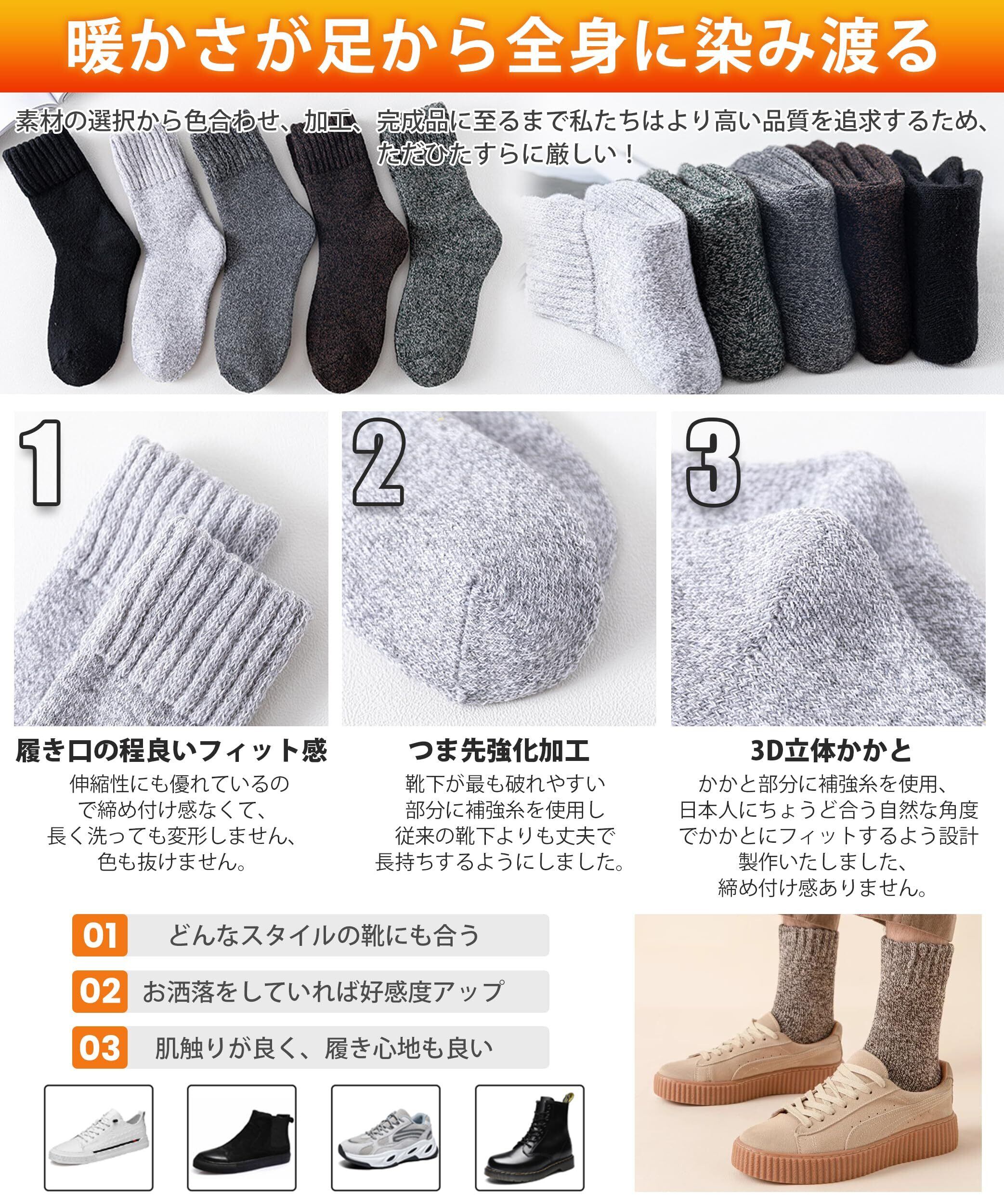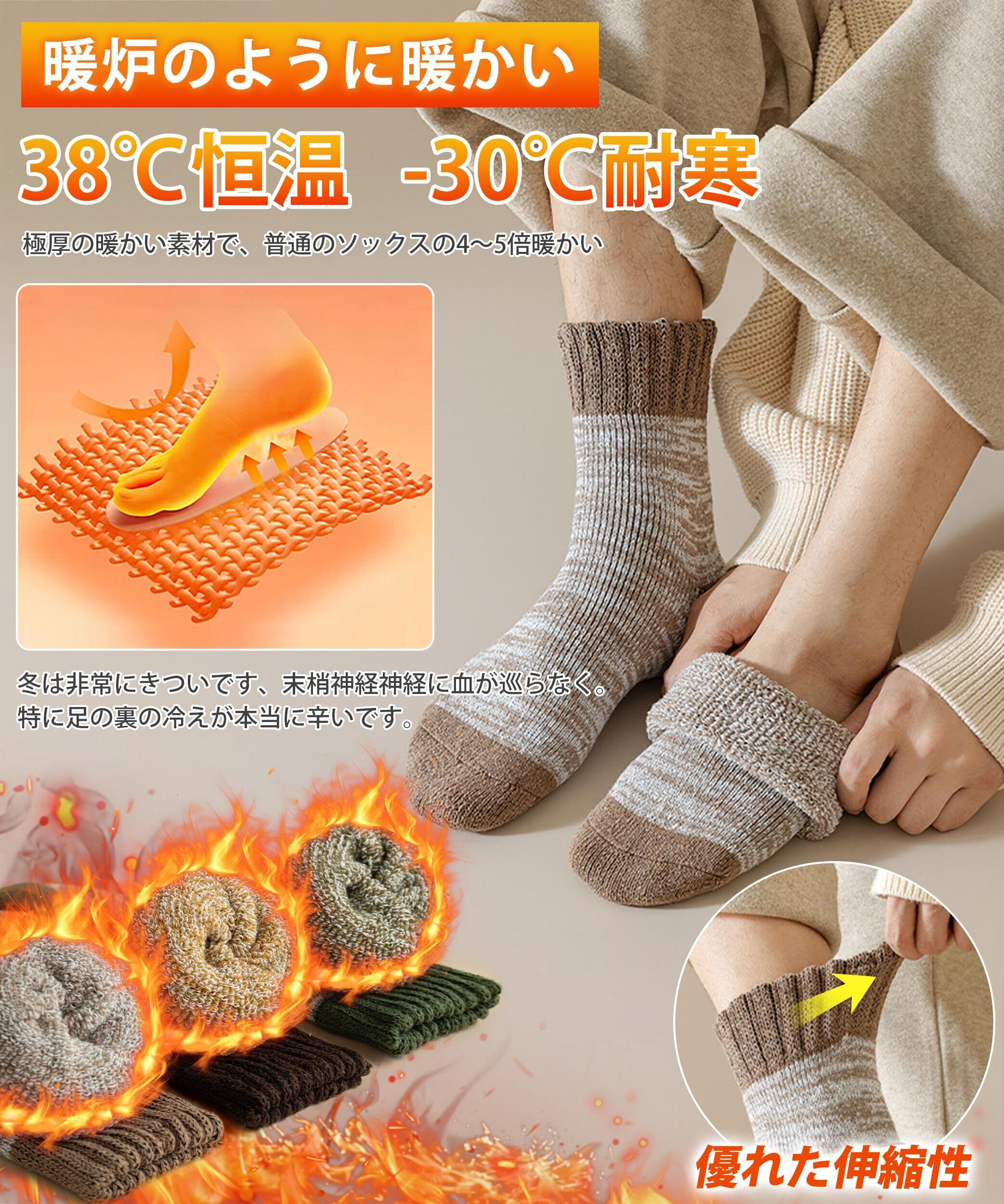 【暖かさが足から全身に染み渡る】:暖炉のように暖かい、厚手 防寒靴下 冬、靴下の裏地は極厚手起毛、保温性は普通の靴下の5倍、厳冬にアウトドアしても保温性が良い 靴下 メンズ 厚手。 履き口からつま先まで全部ふわふわとして、まるで毛布に包まれているような、柔らかい肌触りで足全体をやさしく包み込んでくれるから、同時に厚地裏起毛のデザインを採用し、足の熱量をしっかりとロックさせて、不思議な38℃恒温を実現します、暖かさが足から全身に染み渡る。 ソックス メンズ 血液循環を促進し、足を暖かく保ちます!