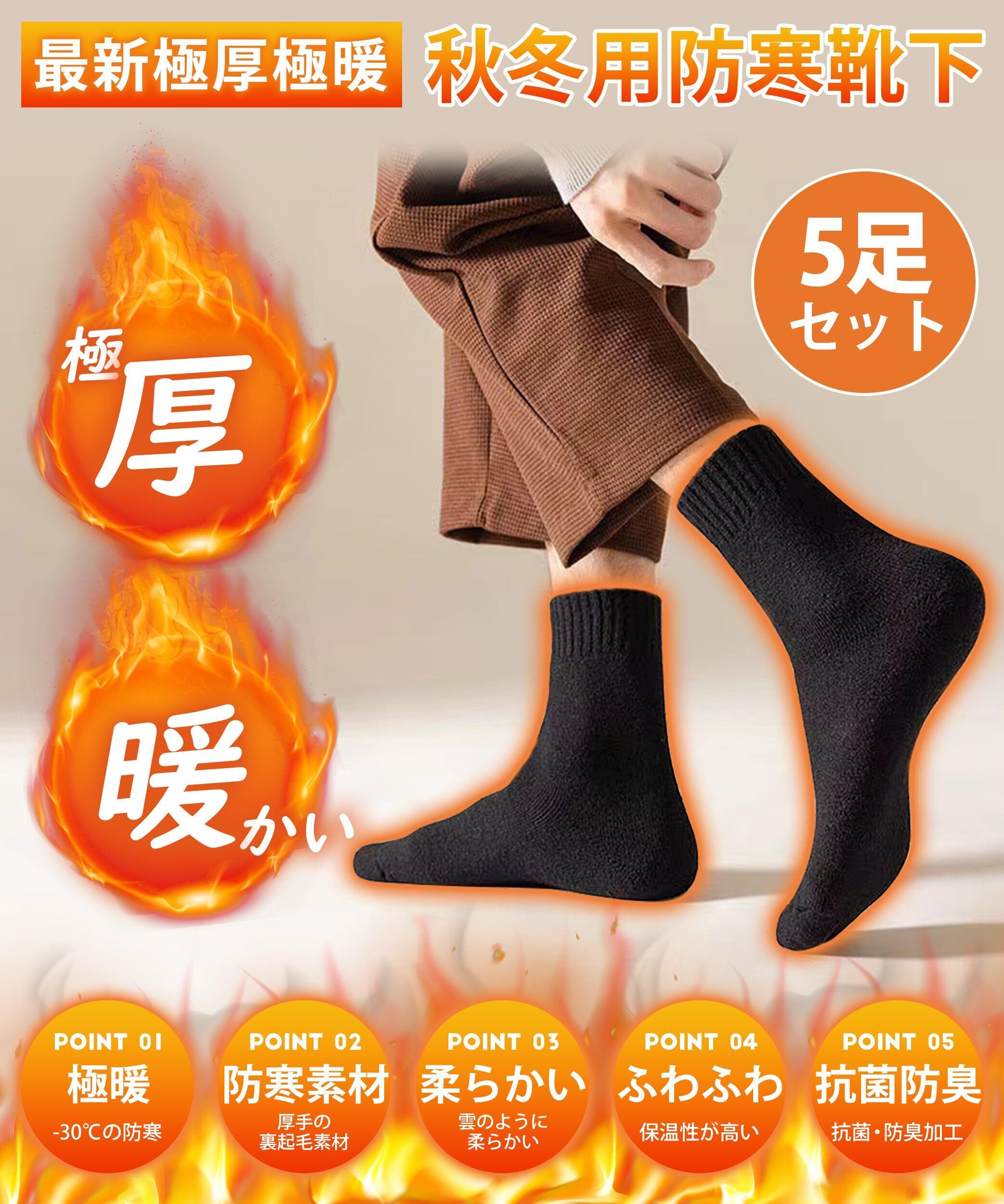 靴下 メンズ 冬 防寒 厚手 ソックス 【極厚裏パイル・暖かさが爆発してる・ふわふわの雲のような感触】保温 防寒 吸汗 抗菌消臭 伸縮性 耐久性 25-28㎝ 男女兼用 5足セット