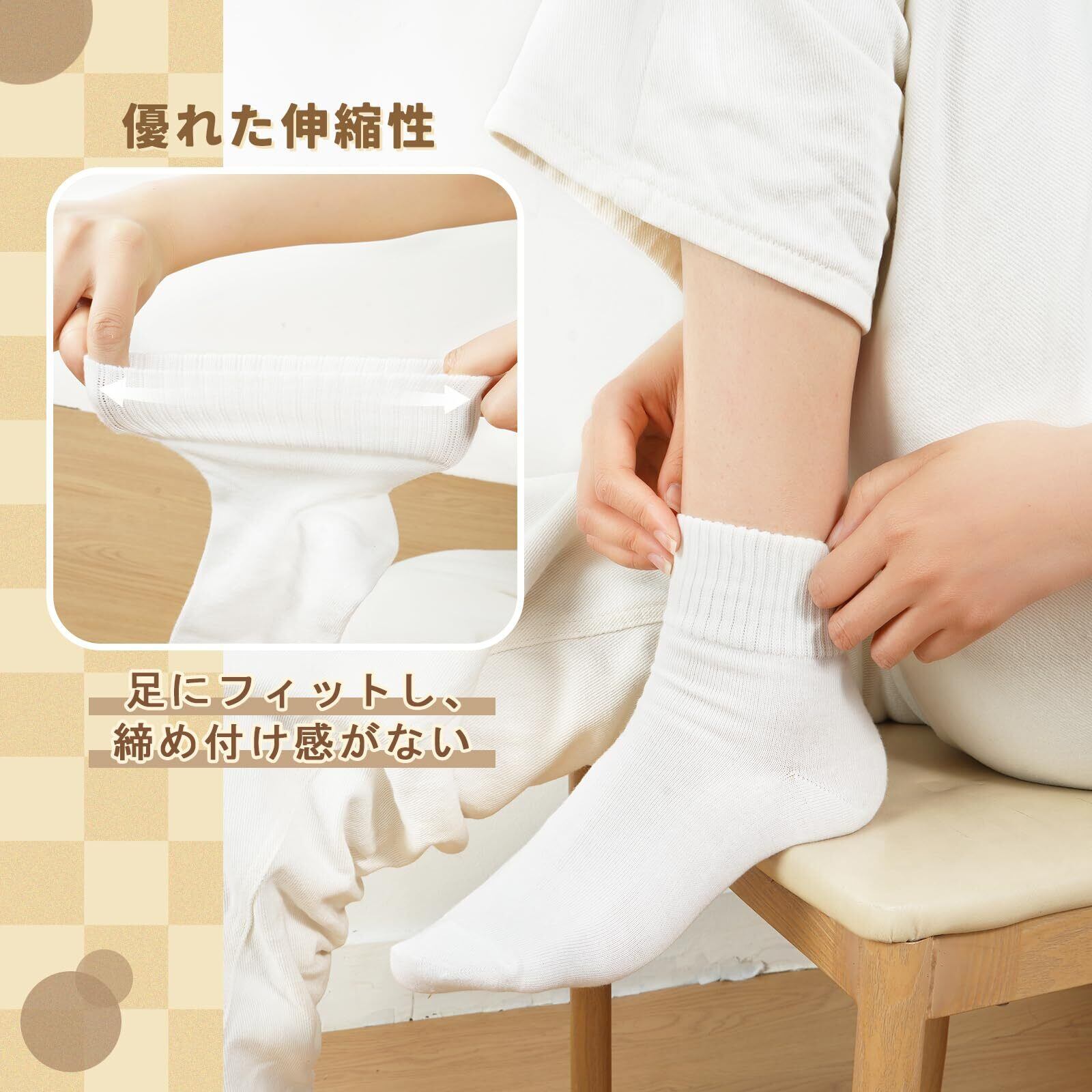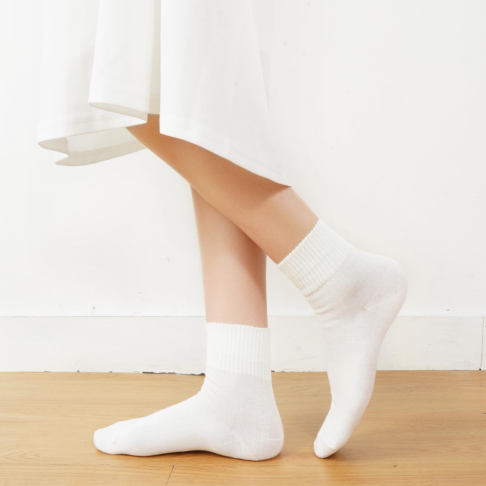 【中厚手柔らかいコットンソックス】この白のyazon靴下 レディースは高品質の綿80%を使用したオールコットンソックスとして知られています。綿花は独特の感触があり、非常に柔らかく快適な履き心地が特徴です。〇リブ編みタイプの履き口なので足首はゆるゆるで締め付けない程度のしっかりフィットな履き心地です。介護中 妊娠中の女性用にも問題ない、高齢者にもオススメのゆったりソックスです!
