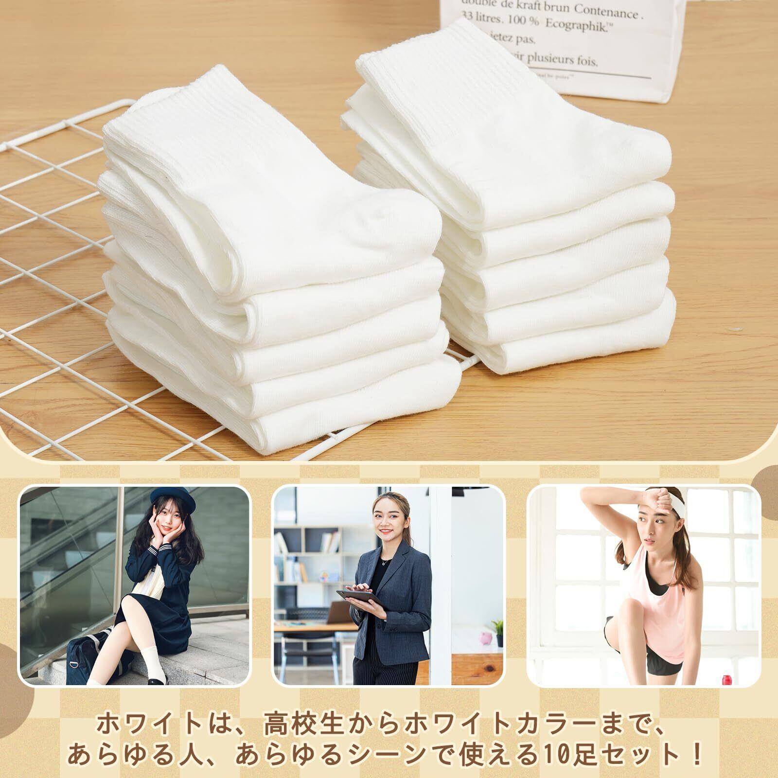 【yazon靴下 レディース 白 商品仕様】レディース用のまとめ買い10足セットの白ソックス。素材:80%綿+ボリエステル+スパンデックス。サイズ:22-25cm。伸缩性良いフリーサイズで大部分の日本女性の足に適用大きめ靴下。厚さ:厚手と薄手の中間厚さ。季節対応:四季。春秋の着用に最適が、夏は蒸れにくい、冬にも保温靴下。パーケージ内容:白色10足セット。普段の生活に活躍する白のクルーソックス、制服 スクール 高校生 婦人通勤通学ファション小物です。また同色のセットは、穴が空いたり、片足をなくしても、代替え出来るので重宝して人気です。