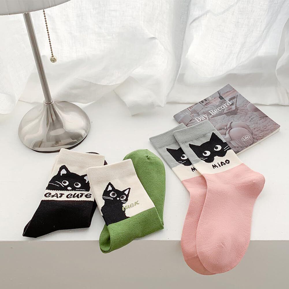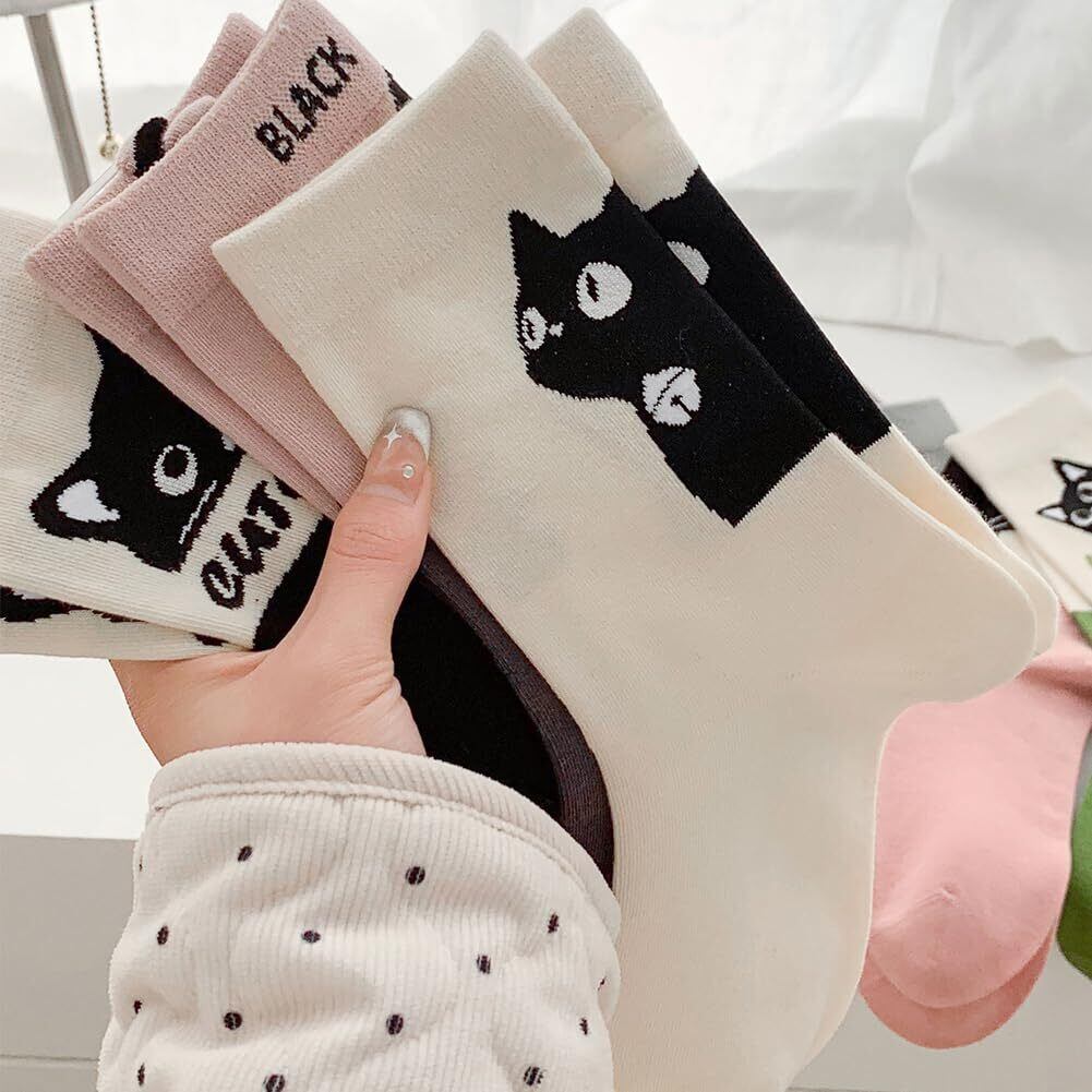 [FASELE] 靴下 レディース おしゃれ ソックス 女子用 婦人用ソックス クルーソックス 可愛い 猫 動物 花柄 コットン 綿 通気性 柔らかい 春夏 秋冬 オールシーズン ミッドチューブソックス ギフト 贈り物 プレゼント 5足セット
