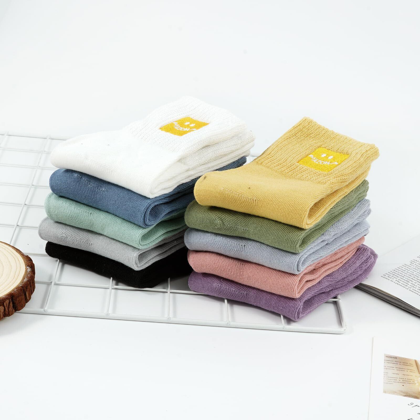 [Yazon] 靴下 レディース 可愛い 綿10足セット カラーソックス スマイル靴下 女性用 おもしろくつ下 夏用蒸れない 春秋冬 防寒くつした 中厚手 クルーソックス 婦人 22~25cm 刺繡柄