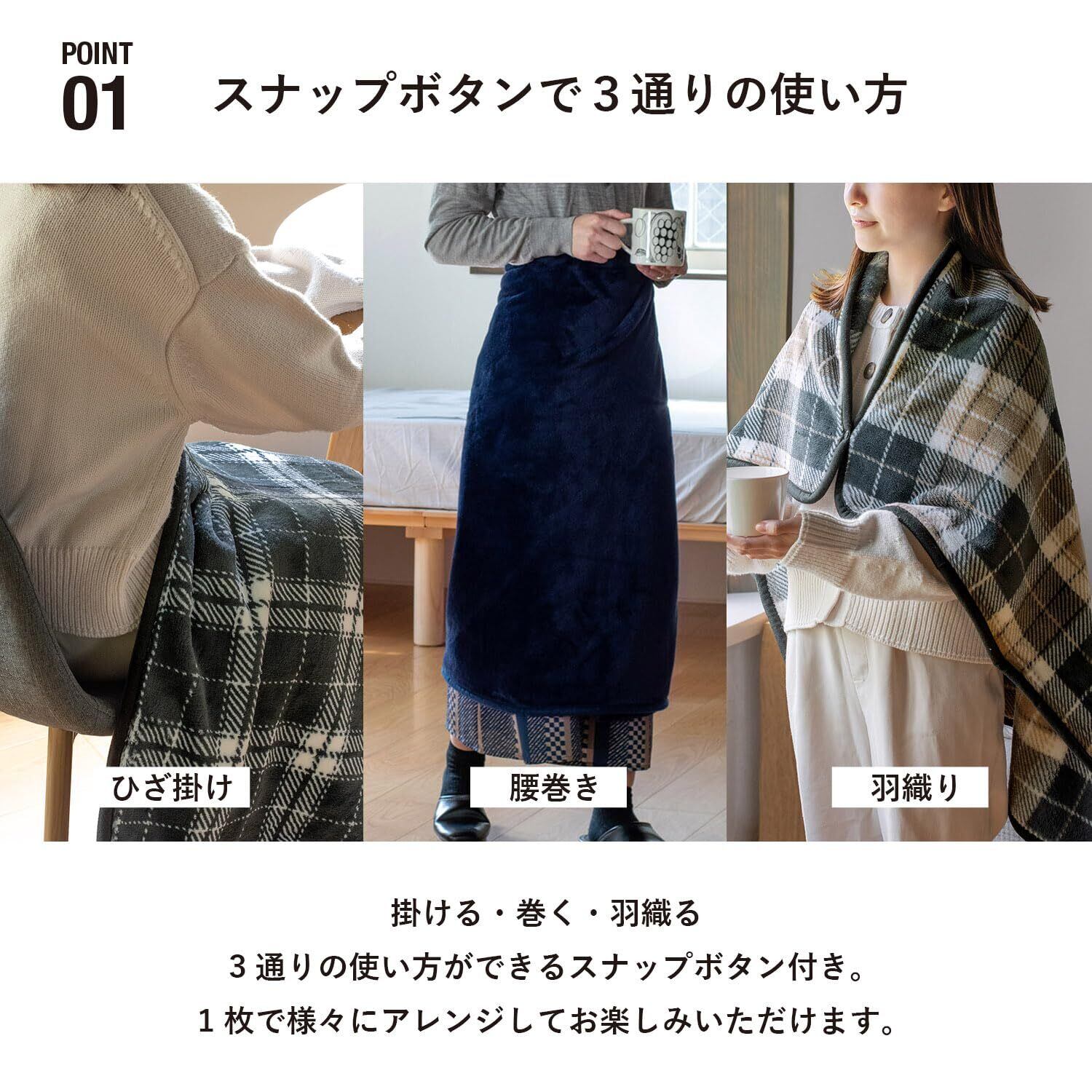 トランパラン ミルクマイヤー ひざ掛け ブランケット 洗える 小さめ スナップボタン付き 3way 約80×100cm(チェックネイビー)