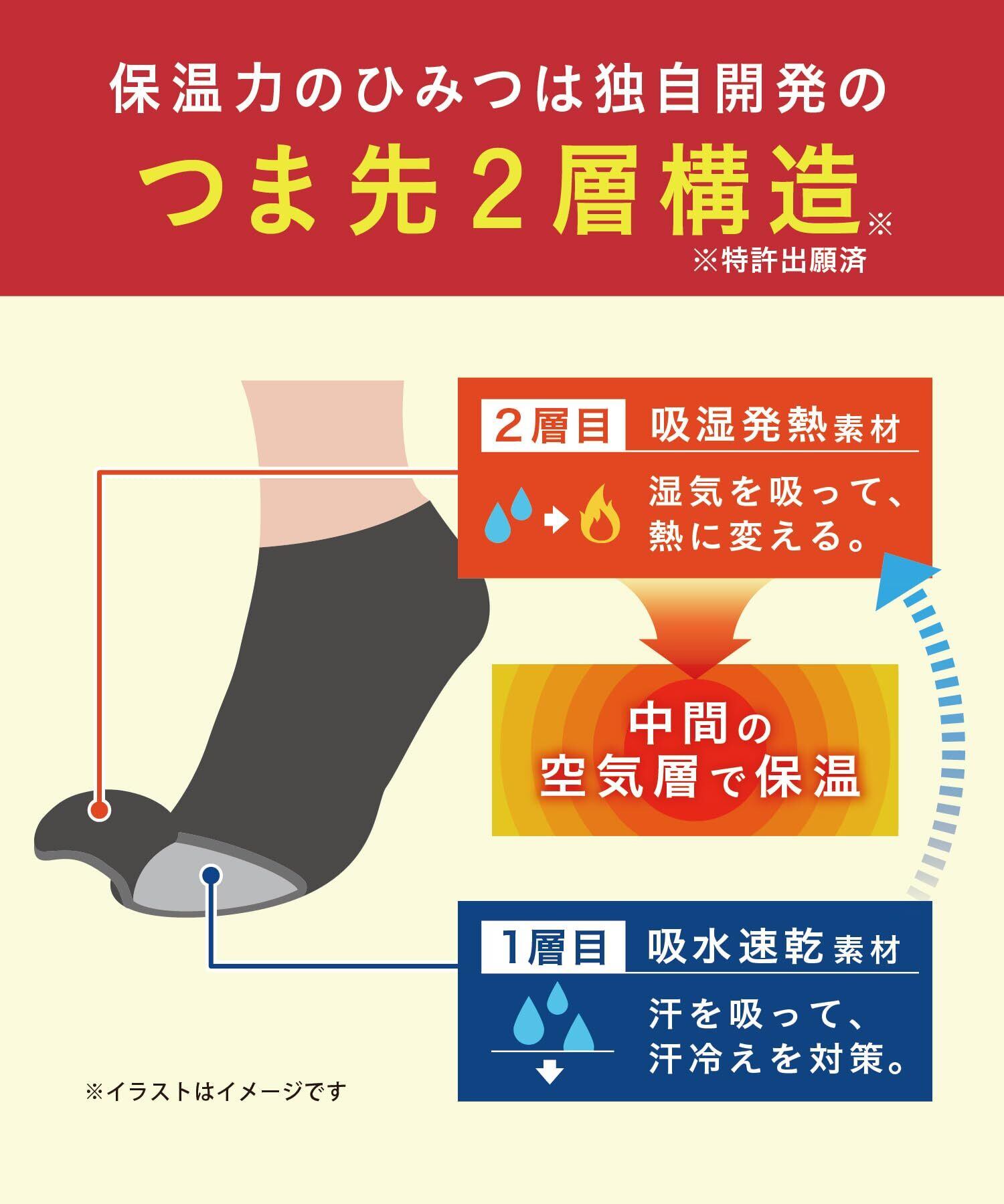 【秘密は「つま先二層構造」】汗冷えを抑制する吸水速乾生地×吸湿発熱生地の二層の生地で、熱を逃さずあたたかさが持続。冬の冷えやすいつま先が快適に。