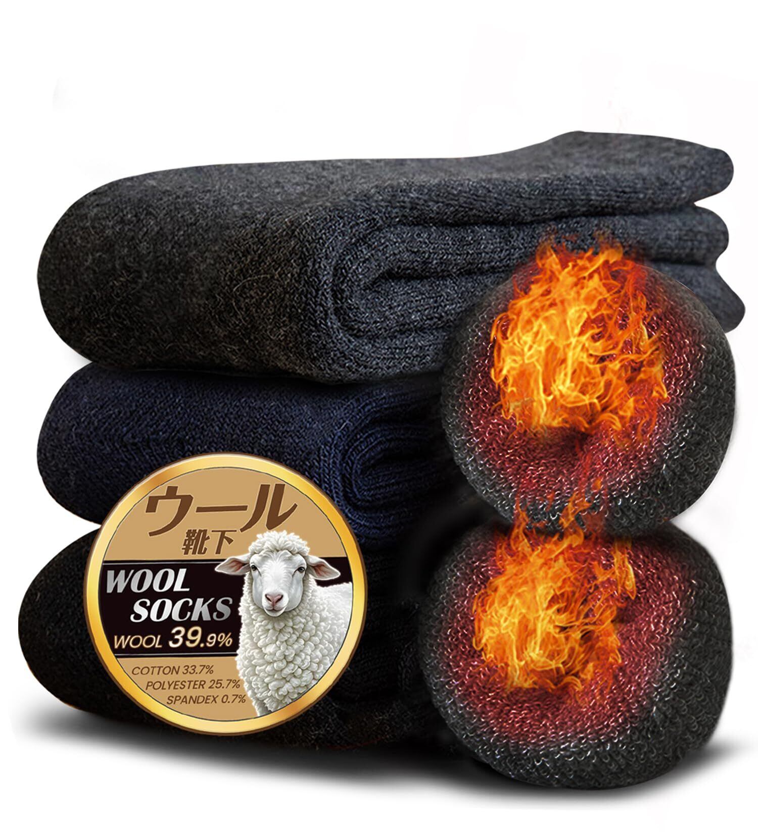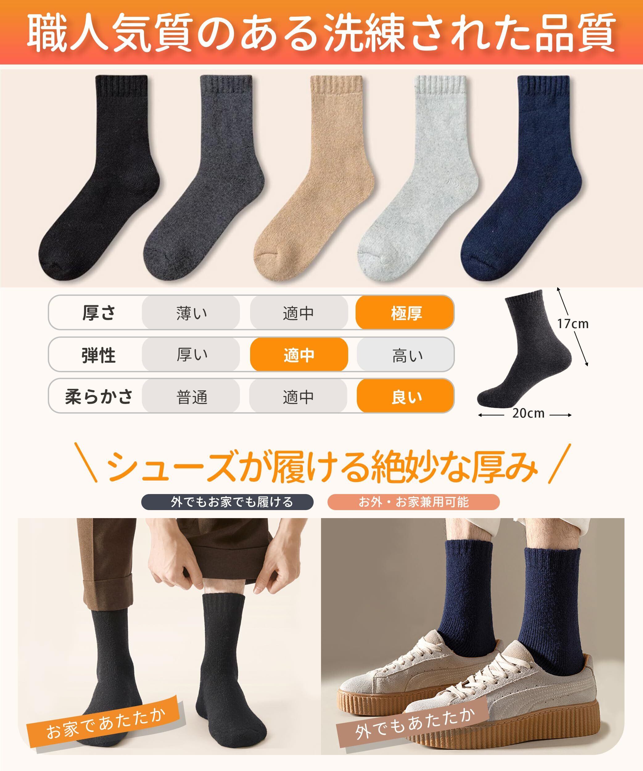 【冬用零下防寒靴下登場!】サイズ:約25㎝~29㎝、重量:約73.5g。適用季節は秋、冬、春です。日本人の足型の長さによって改良されており、伝統的な靴下の長さを超えました、ファッションと防寒の二重スタイルを実現されました。高品質のメンズウールンソックスは、上質なウール(39.9%)とコットン(33.7%)の混紡素材で作られ、保温性と耐久性の完璧なバランスを実現しています。ウール混紡素材は優れた保湿性、吸放湿性、そして暖かさを持ち、体温を維持しつつ蒸れにくい快適な履き心地を提供します。一般的な45gの冬用ソックスと比べて、当社の靴下は厚みがあり、暖かく、通気性と耐摩耗性に優れ、最大74gの重さで零下の環境でも足を暖かく保ちます。