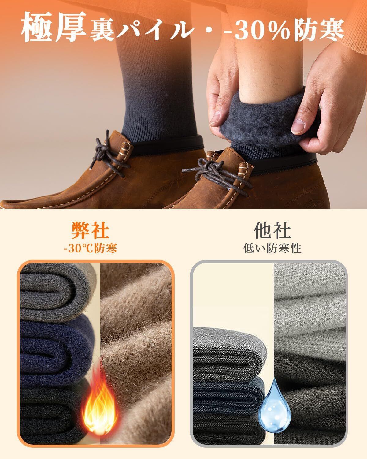 選んだ理由: ・履き口ゆったり、締めつけ感のない。 ・発熱ぽかぽか素材で足元冷え性さんには特におすすめの防寒用靴下。裏面を全て起毛させ、やわらかくふかふかの履き心地。 ・吸湿性·消臭性·通気性·耐久性にも優れています。 ・この防寒靴下の厚さは普通の靴下の3ー4倍、防寒性も抜群ですので冬にも適しています。