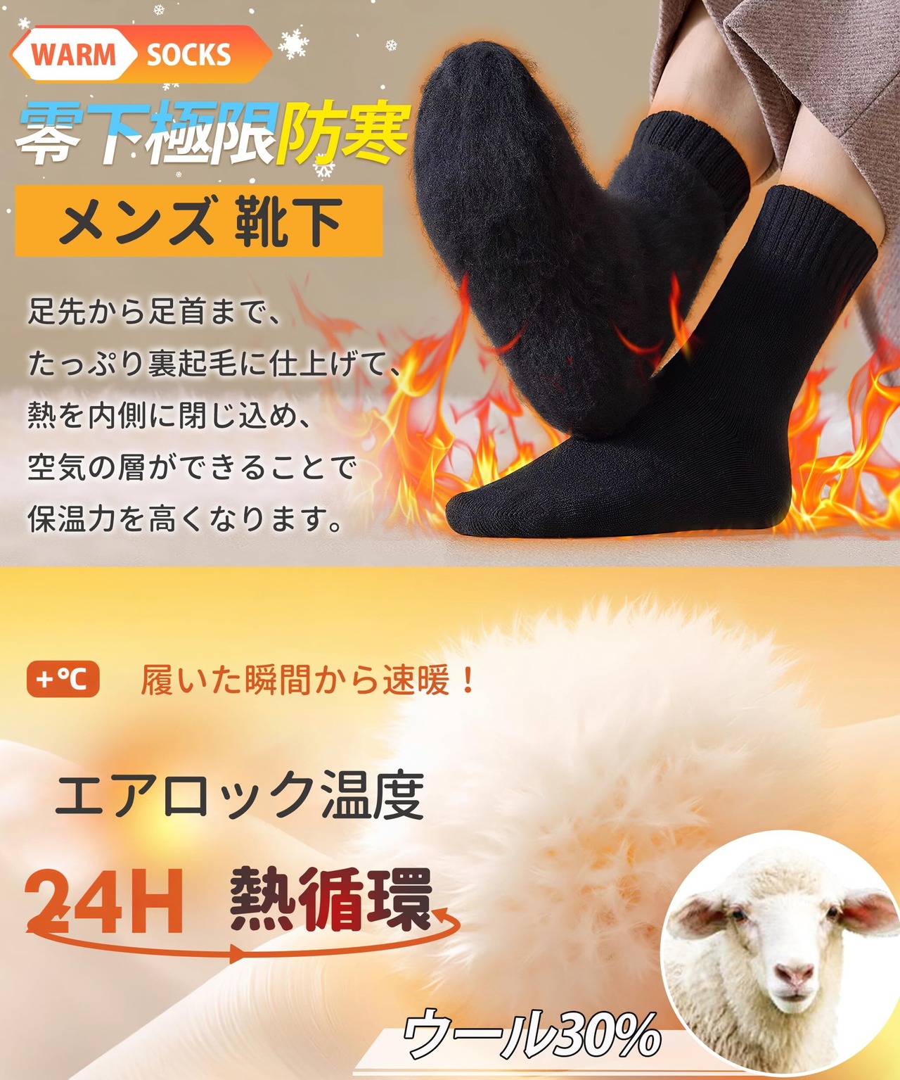 【履いた瞬間から速暖!零下極限防寒】上質なウール30%を採用したメンズ厚手靴下は、極厚ウール起毛の裏地で、保温性が通常の靴下の5倍以上です。履いた瞬間から素早く温まる速暖機能が特徴で、抗寒力が最大50%アップします。極寒のアウトドア活動や零下の環境でも、しっかりと足を守り保温します。登山、スキー、スノーボード、キャンプなど、過酷な寒さに挑むアクティビティに最適です。また、自宅でのリラックスタイムにも最適で、アウトドアでも日常生活でも抜群の快適さを提供します。軽量でフィット感抜群のため、長時間履いても足元が疲れず、どんな状況でも最高の履き心地を実感できます。