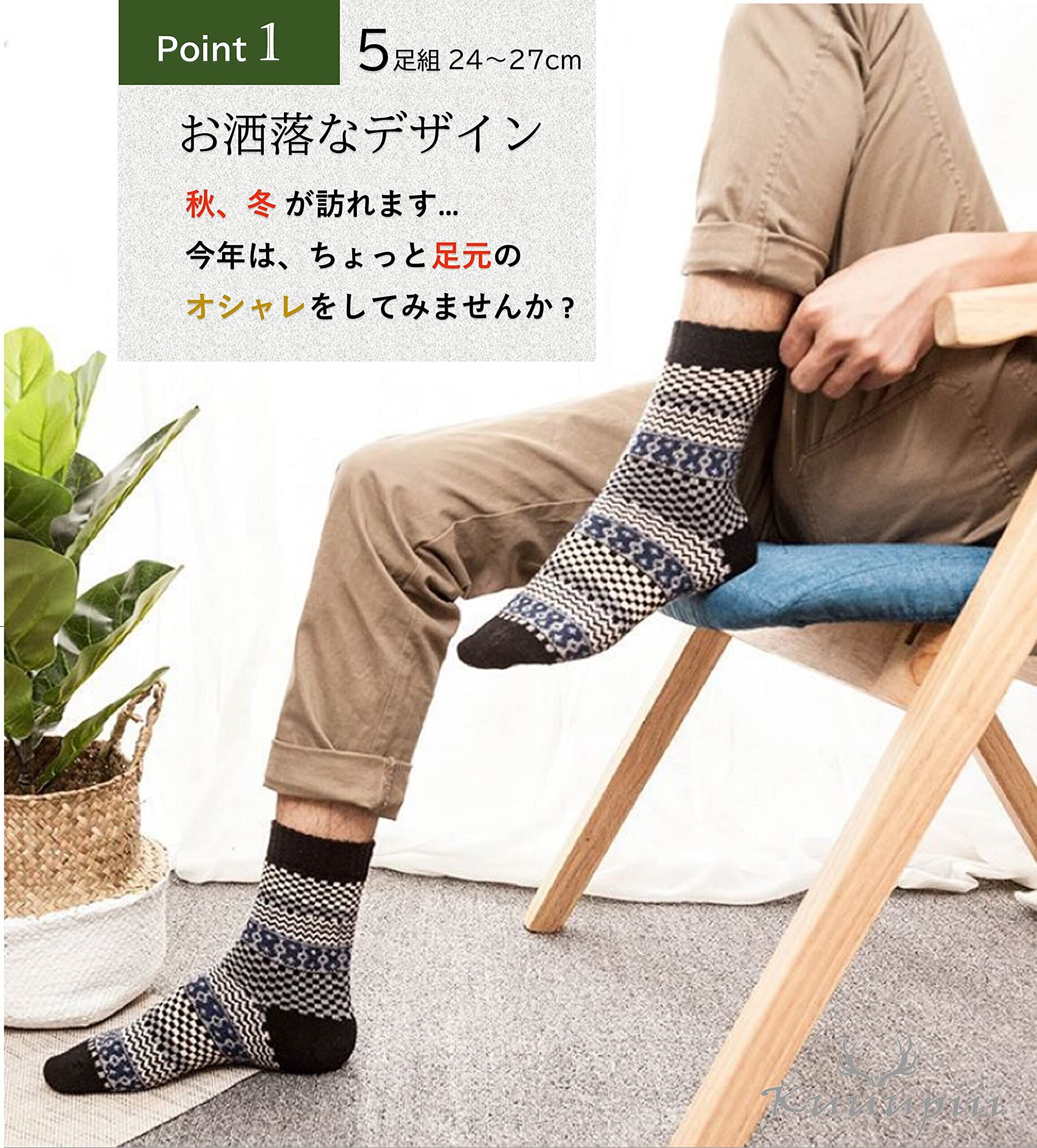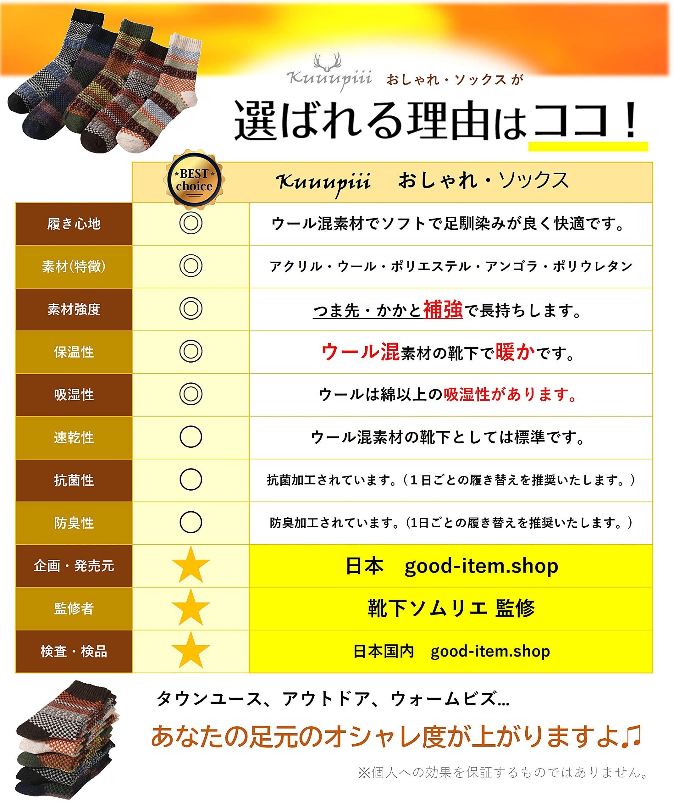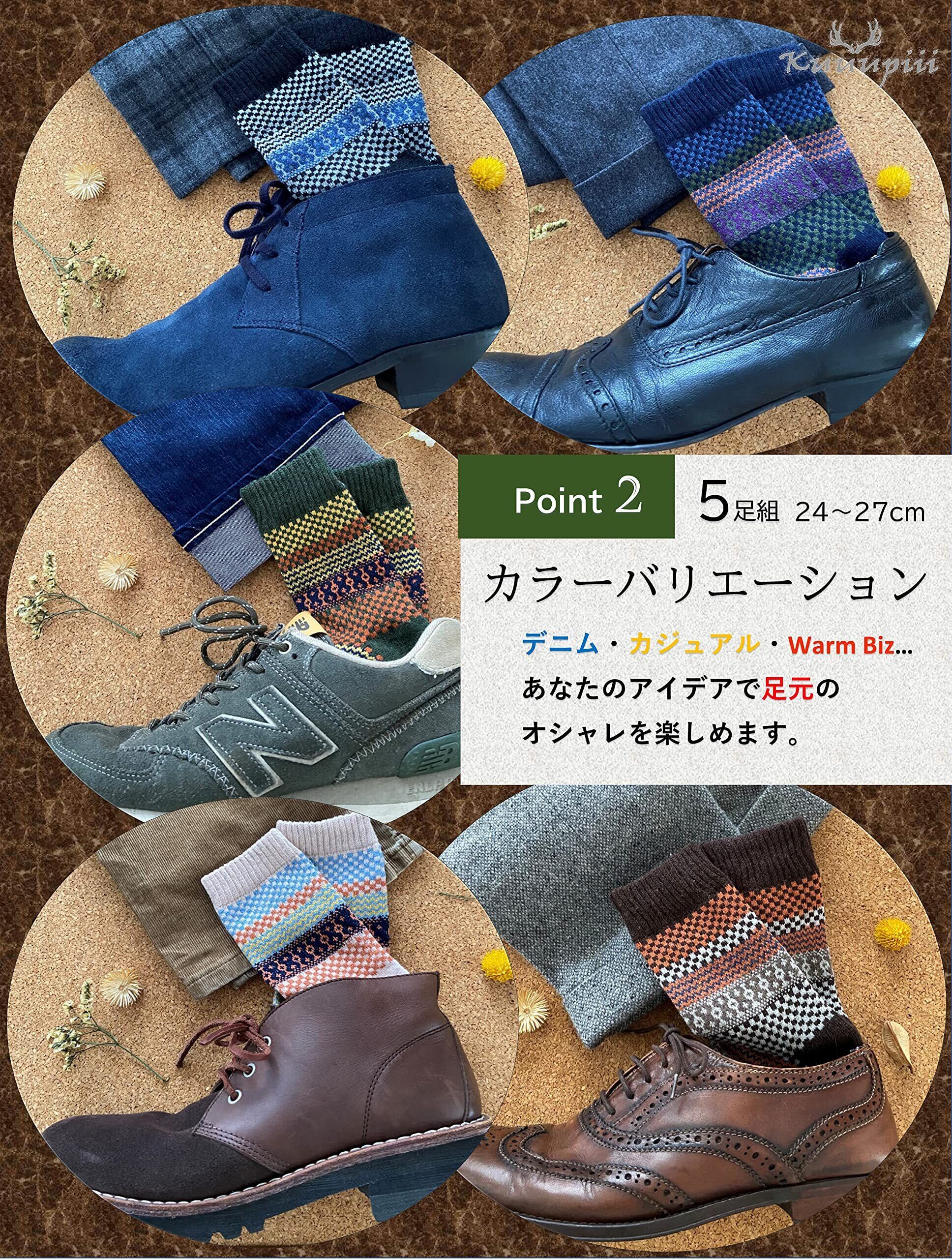 【kuuupiiiお洒落ソックスの着用シーン】 オフタイムでのデニムなどのカジュアルスタイルでの着用はもちろんですが、 WARM BIZスタイルでのビジネスシーンでのご着用も推奨いたします。トラディショナルな革靴や 流行のお洒落なレザーブーツなどにも合わせていただけ、5足の各カラーにて着用のシーンが広がります。 毎日の生活シーン、着用されるスタイルに合わせてご着用のカラーをお選び下さい。