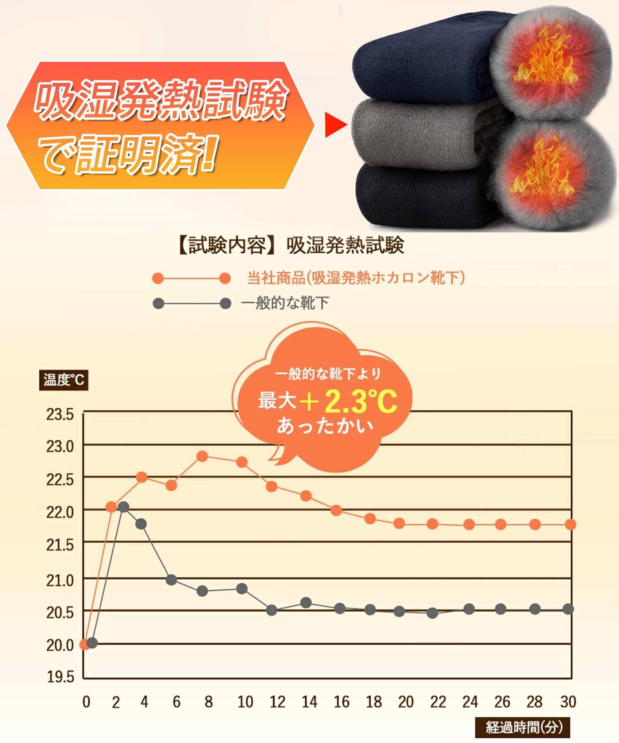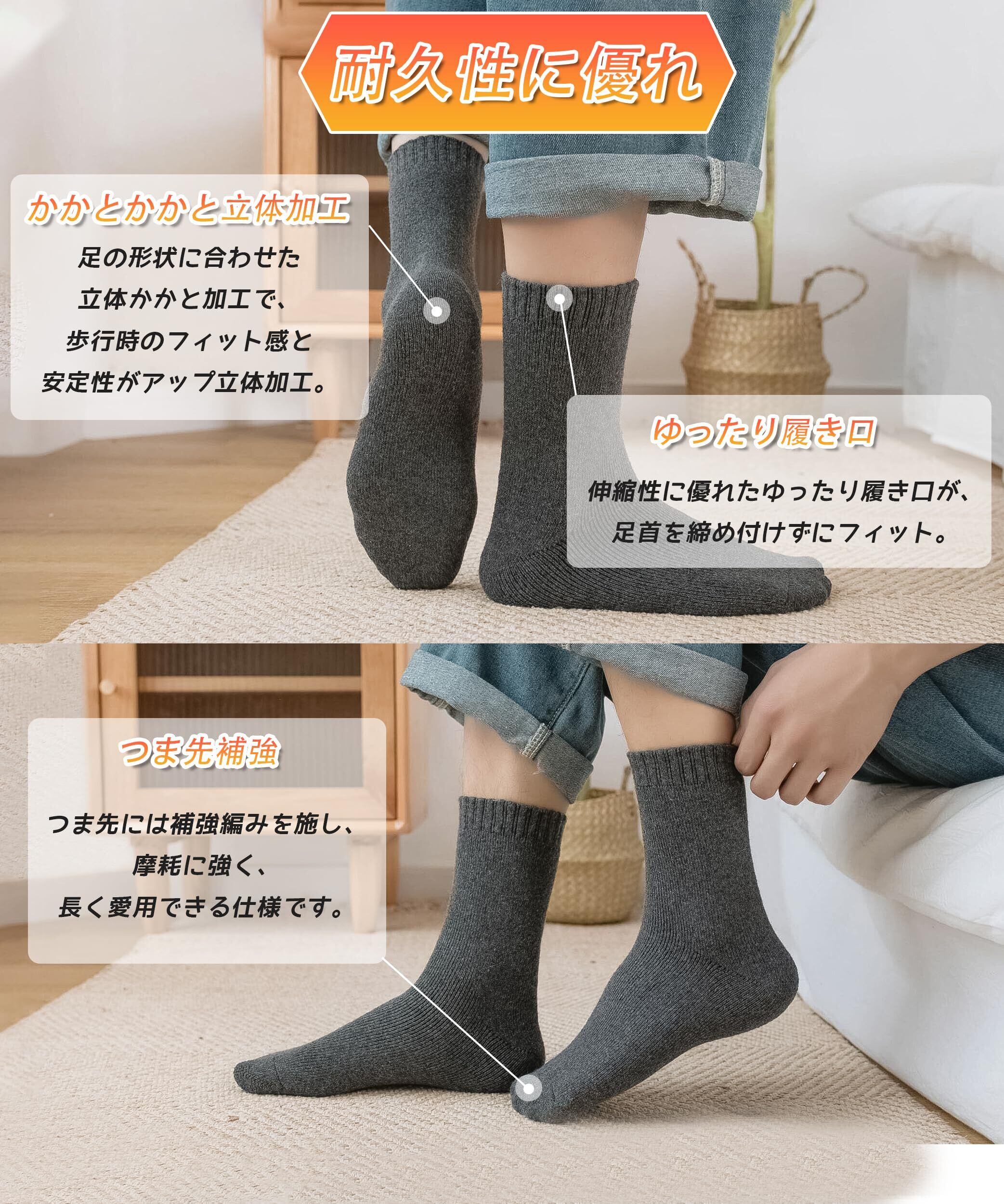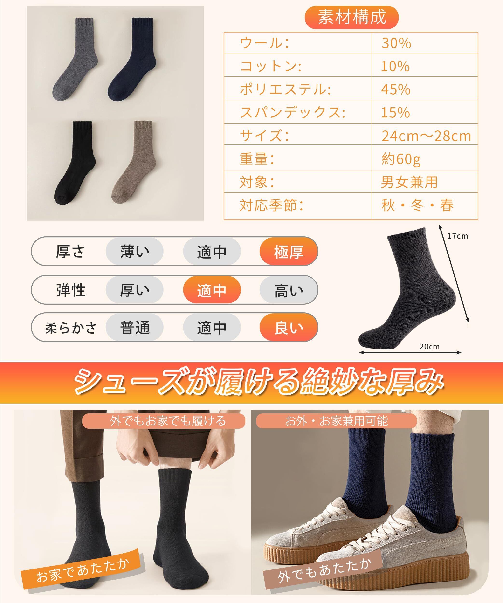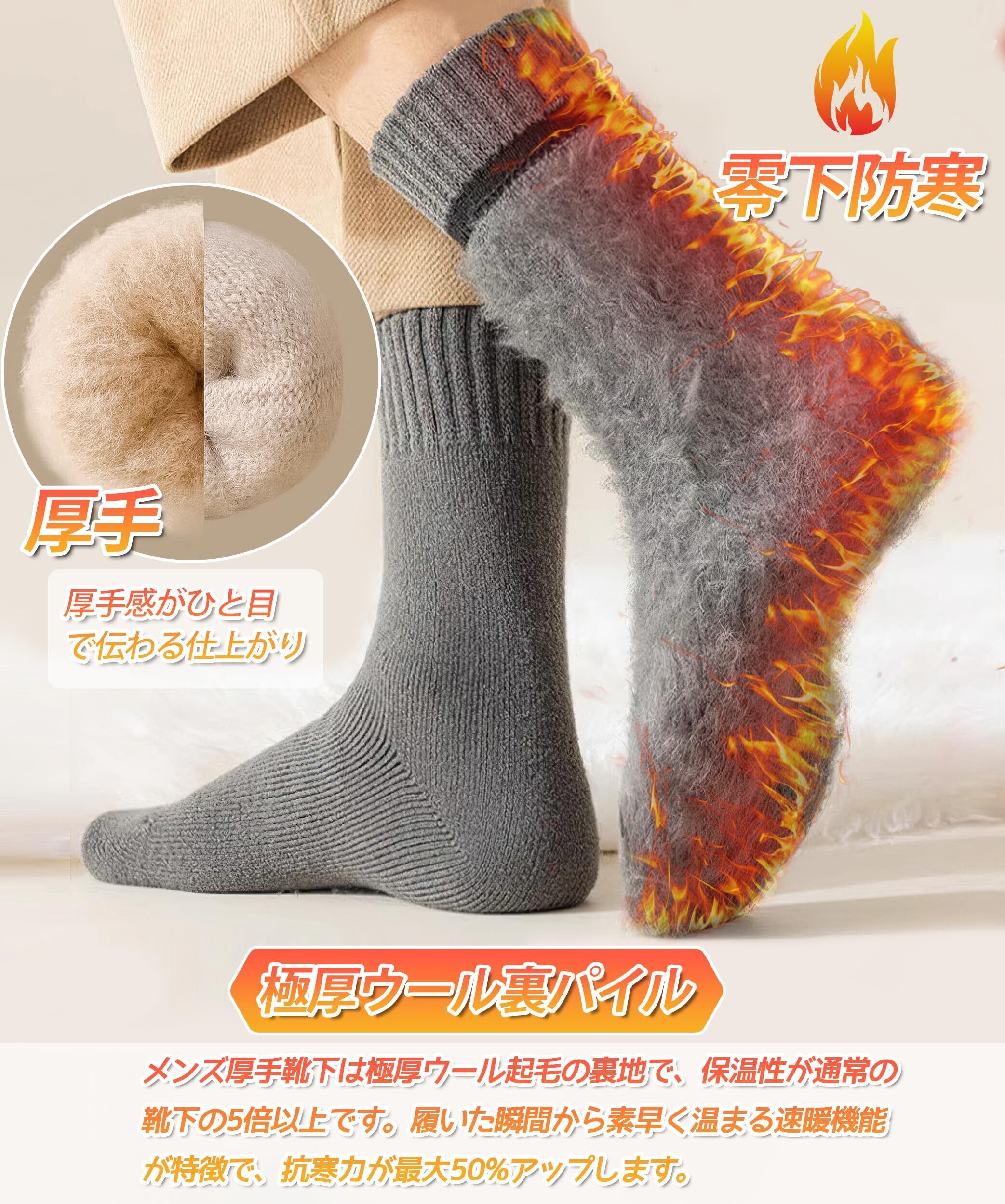 【極厚ウール裏パイル!極寒対応】上質なウール30%を採用したメンズ厚手靴下は極厚ウール起毛の裏地で、保温性が通常の靴下の5倍以上です。履いた瞬間から素早く温まる速暖機能が特徴で、抗寒力が最大50%アップします。足先から足首まで、たっぷり裏起毛に仕上げて、熱を内側に閉じ込め、空気の層ができることで保温力を高くなります。極寒のアウトドア活動や零下の環境でも、しっかりと足を守り保温します。この防寒ソックスは厚手で暖かく、柔らかい、伸縮性が高い、保温性に優れているため、屋外でも屋内でも使え、まるで暖炉に包まれているようだ!登山、スキー、スノーボード、キャンプなど、過酷な寒さに挑むアクティビティに最適です。また、自宅でのリラックスタイムにも最適で、アウトドアでも日常生活でも抜群の快適さを提供します。