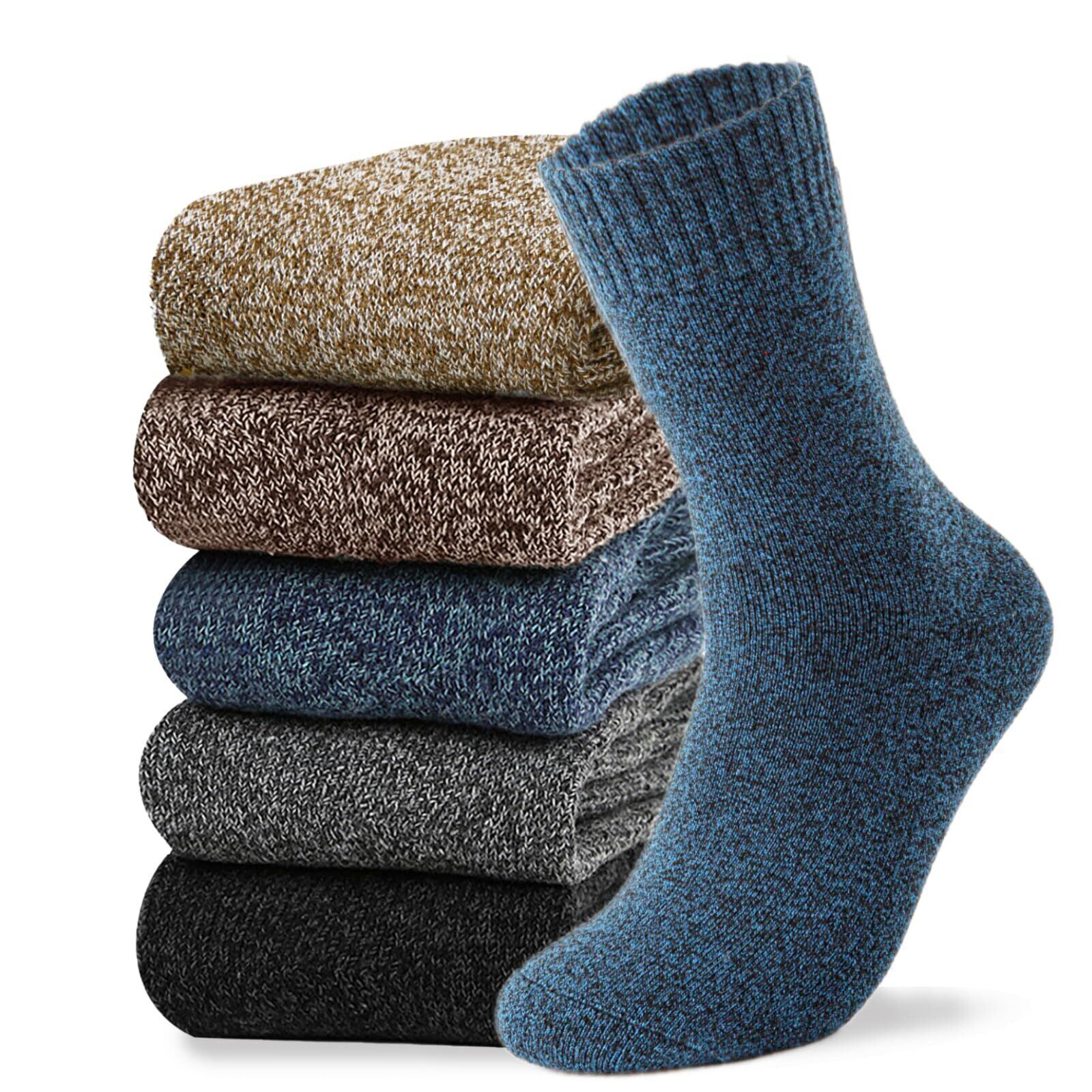 【厚くて暖かいウール靴下】MOSOTECH 5ペアの メンズサーマル靴下は、厚く、柔らかく、快適で、通気性、耐摩耗性、吸汗性に優れた高品質のウールとポリエステルの混紡で作られています。 メンズの厚手の靴下は各ペアが厚く、寒い冬に十分暖かいです。 フリーサイズでほとんどの メンズにフィットします: サイズ: 24-28cm。