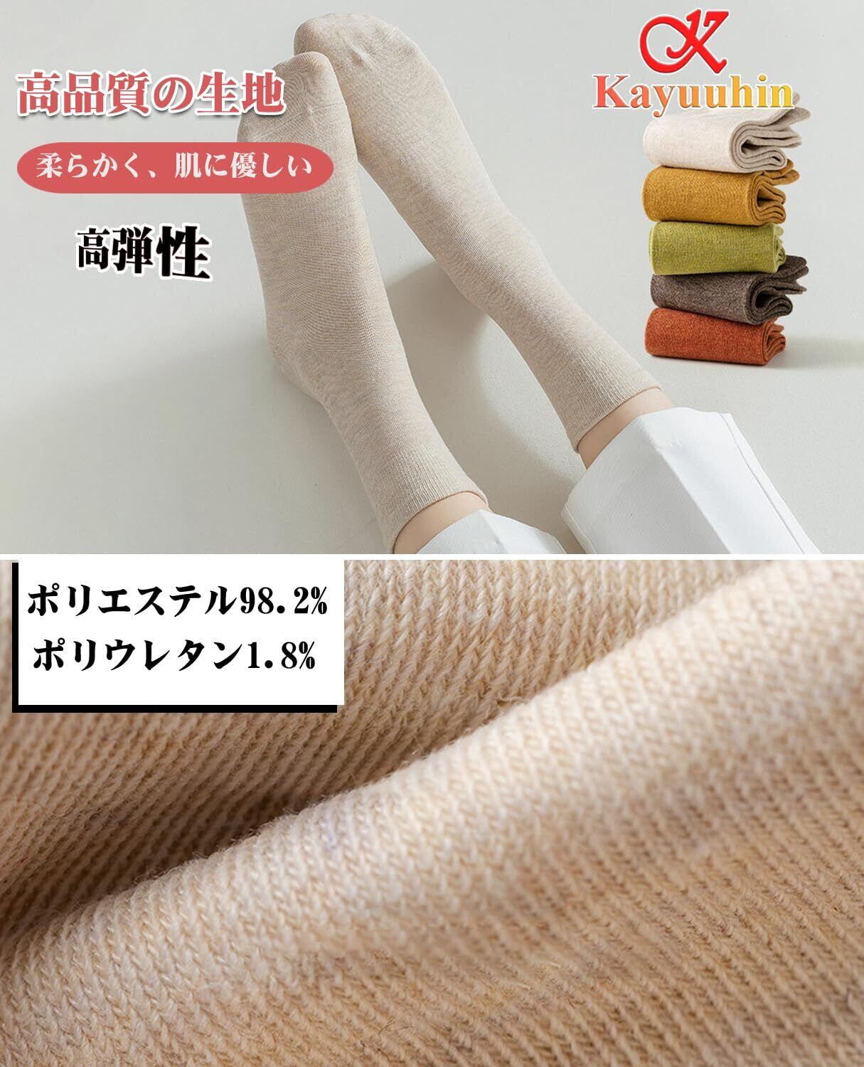 【素材】ポリエステル(98.2%)とポリウレタン(1.2%)の混紡素材で作られ、柔らかで滑らかな肌触りをしていて、密度が高く、伸縮性もあって、形崩れしにくいです。秋と冬にほどよい厚みをしています。足長22-25cmのフリーサイズです。スポーツ、フィットネスやランニングなど様々なシーンで活躍できるおしゃれなレディースソックスです。