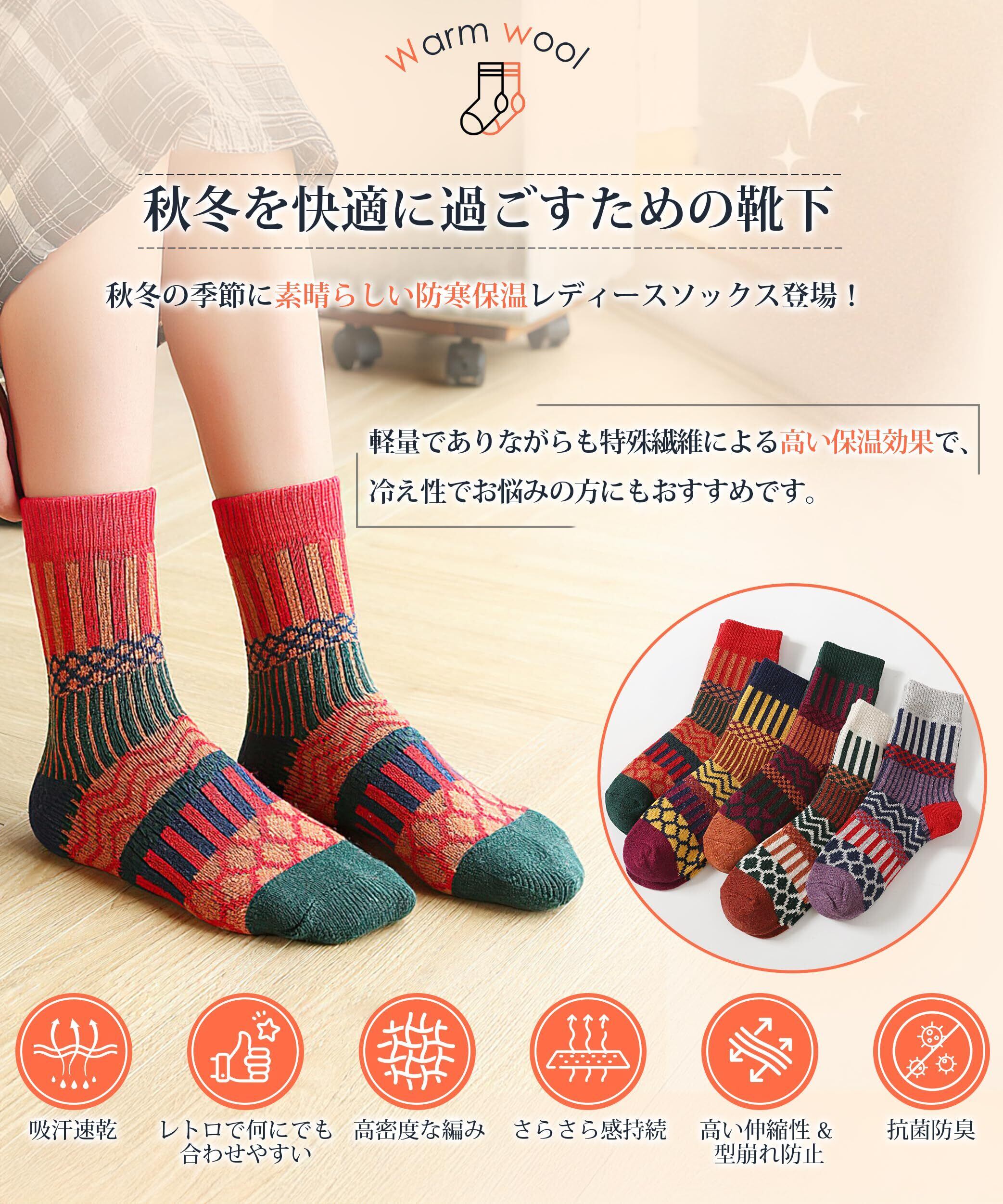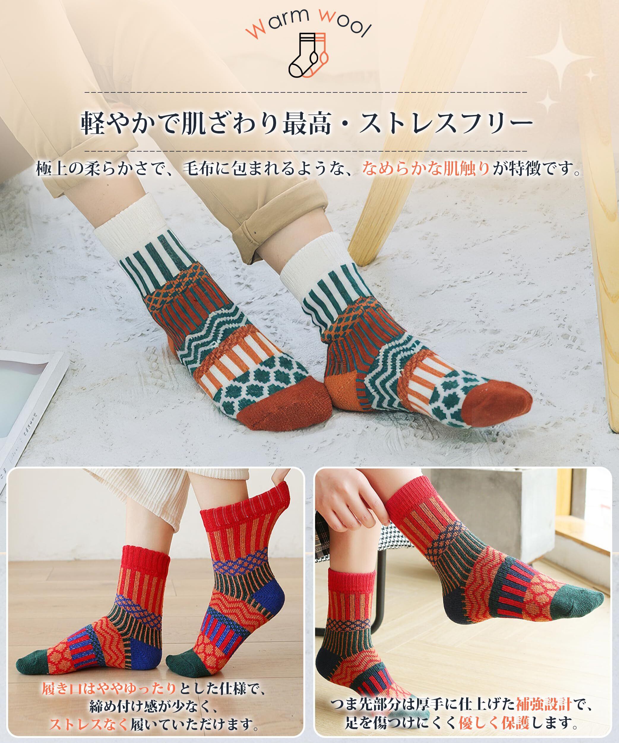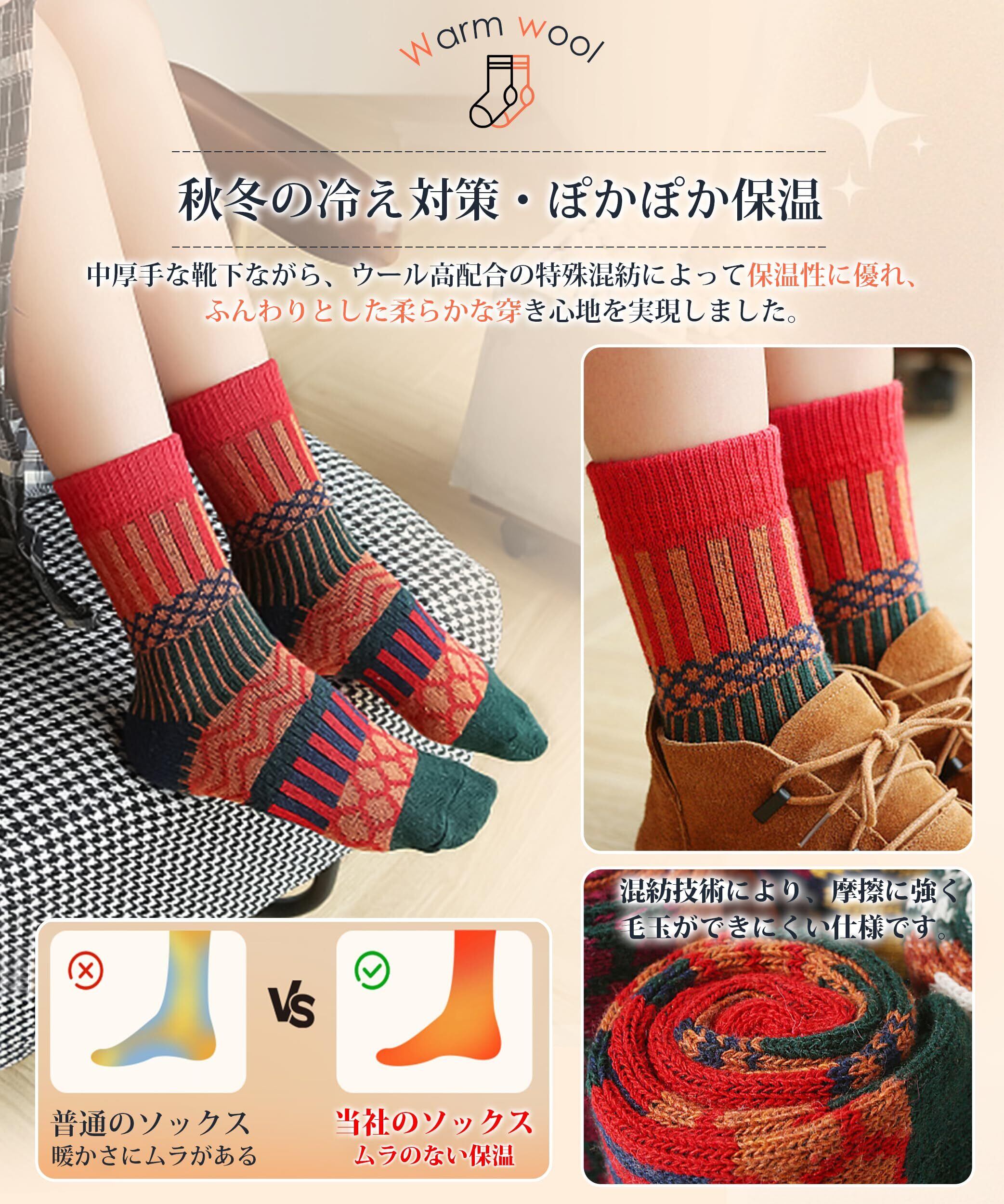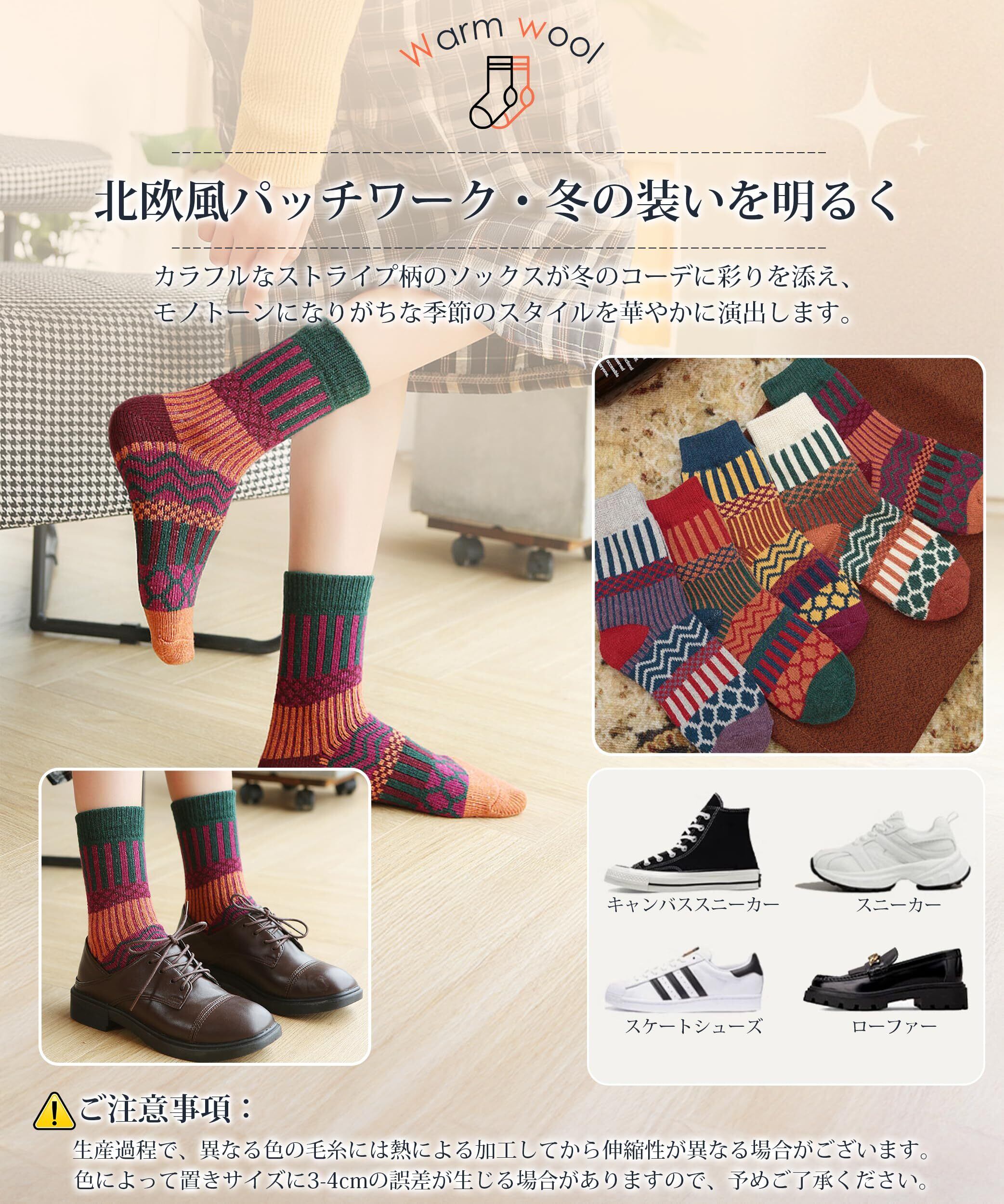 [Velaci] 靴下 レディース ソックス 5足セット 【ぽかぽか保温・軽やかで肌ざわり最高・抗菌防臭】 あったかい 厚手 防寒 耐久性 柄物 ストライプ カラフル おしゃれ かわいい 女性用 秋冬用 クリスマス