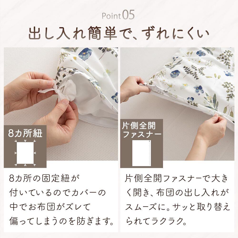【着脱が簡単な機能設計】 カバー内部の8ヶ所に布団留めヒモが付いており、寝返りを打ってもズレにくい仕様です。出し入れしやすい全開ファスナーを採用し、布団の交換作業をスムーズにします。