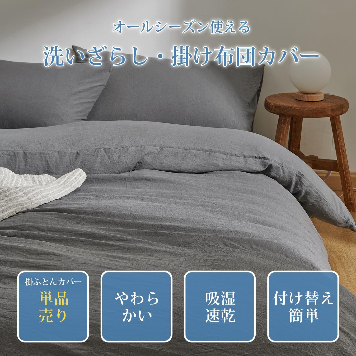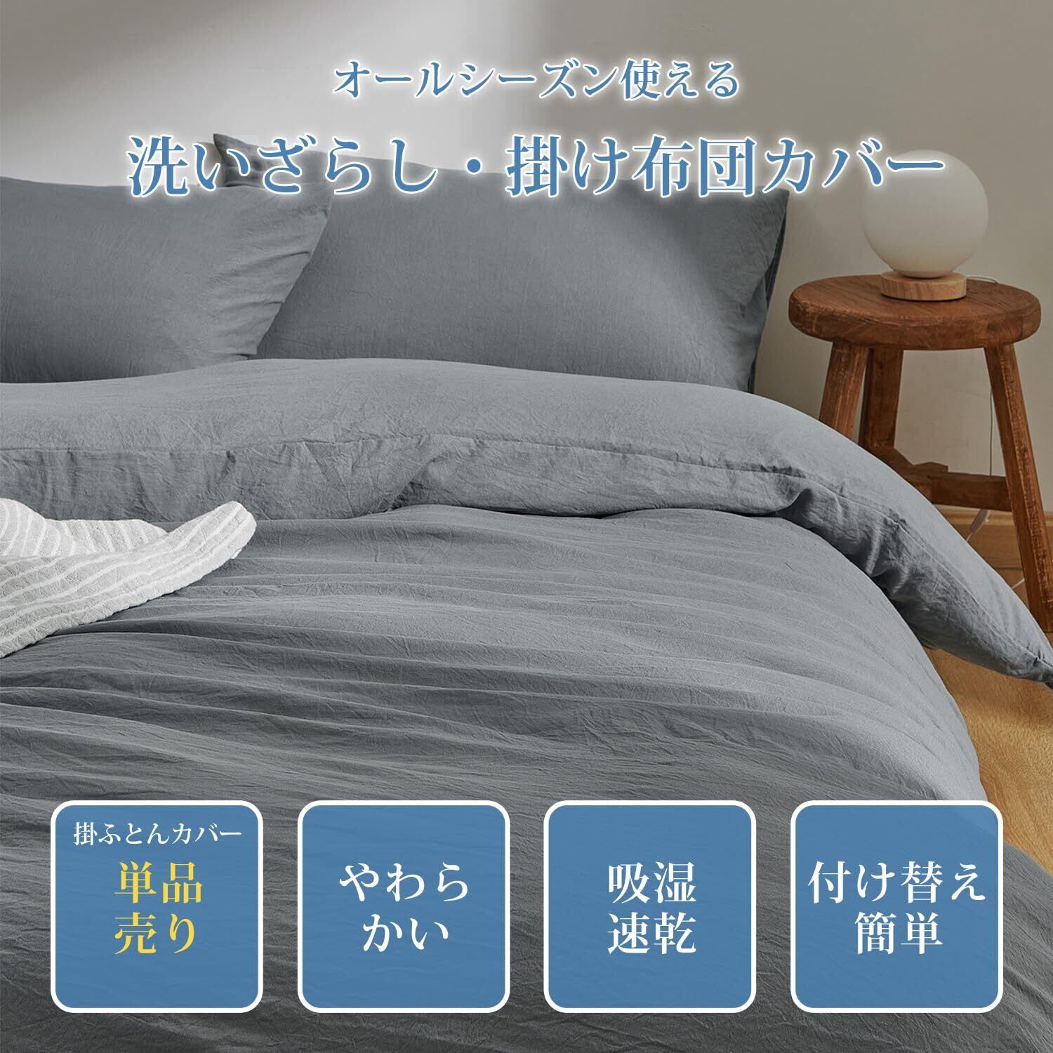 クモリ(Kumori) 掛け布団カバー シングル 洗いざらし 吸湿速乾 素肌にやさしい 柔らかい しっとり ピーチスキン シワ加工 丸洗いOK オールシーズン 布団カバー 掛ふとんカバー (シングル・150X210cm ダークグレー)