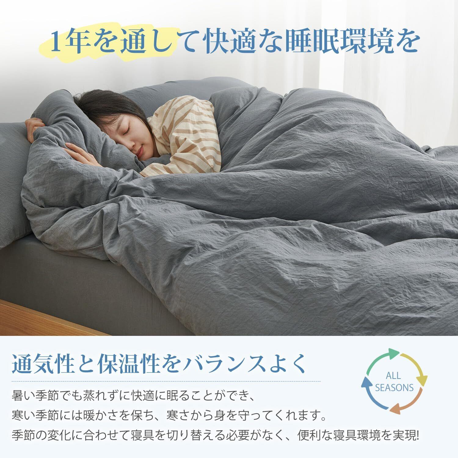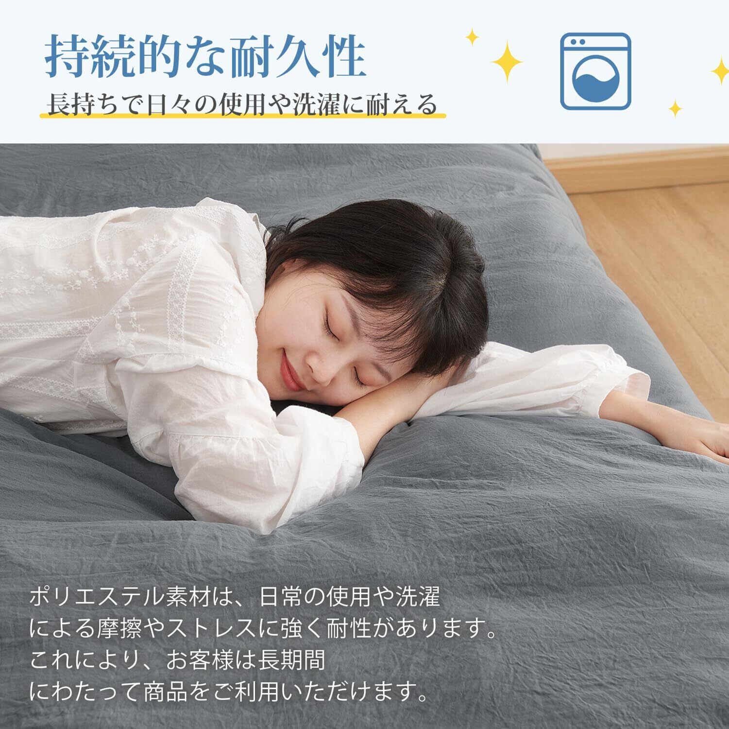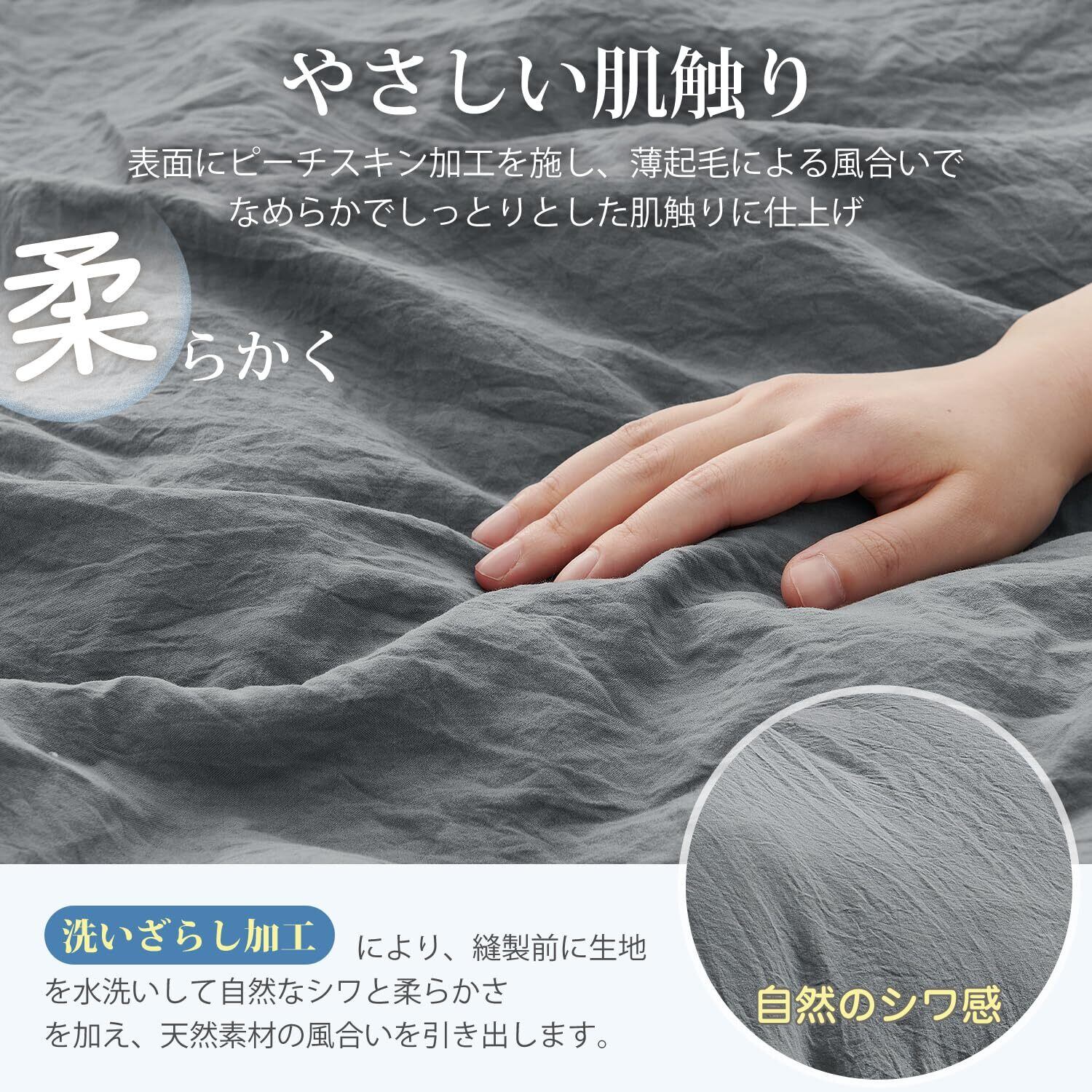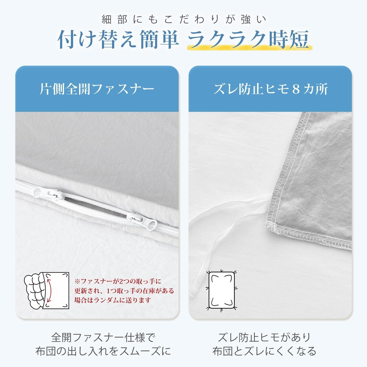 【商品情報】素材 -ポリエステル100%(ピーチスキン+洗いざらし) 仕様 -片側に全開ファスナー使用・布団留めひも8ヶ所付き 生産国 -中国