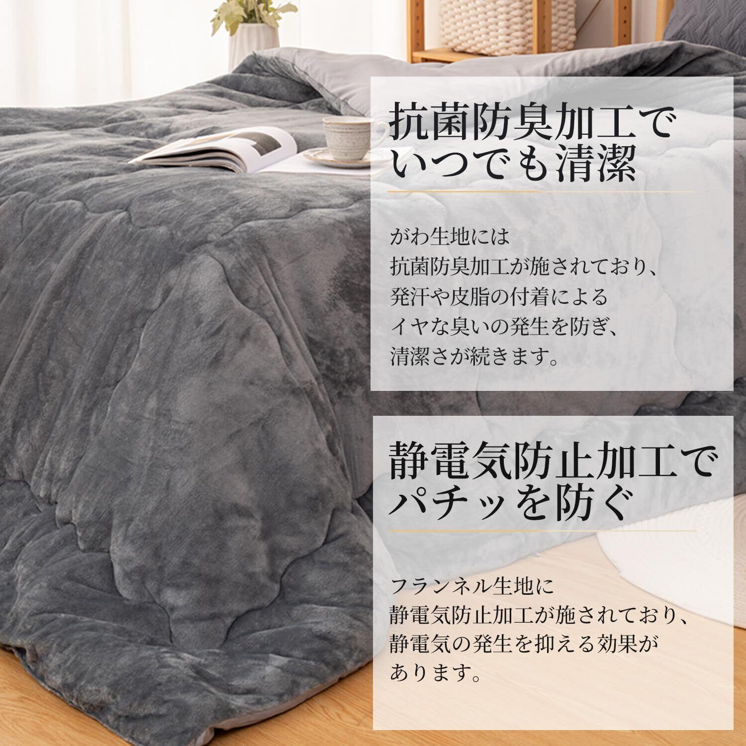 【抗菌防臭+静電気防止双重加工】この フランネル 布団 は、「抗菌防臭」と「静電気防止」のダブル(二重)加工を施しています。抗菌処理により、ダニやカビの繁殖を効果的に抑制し、寝具を常に清潔で衛生的な状態に保ちます。さらに、冬場の不快な「バチッ!」という静電気によるショックを完全に遮断する静電気防止加工により、ストレスフリーで快適な睡眠環境を提供します。