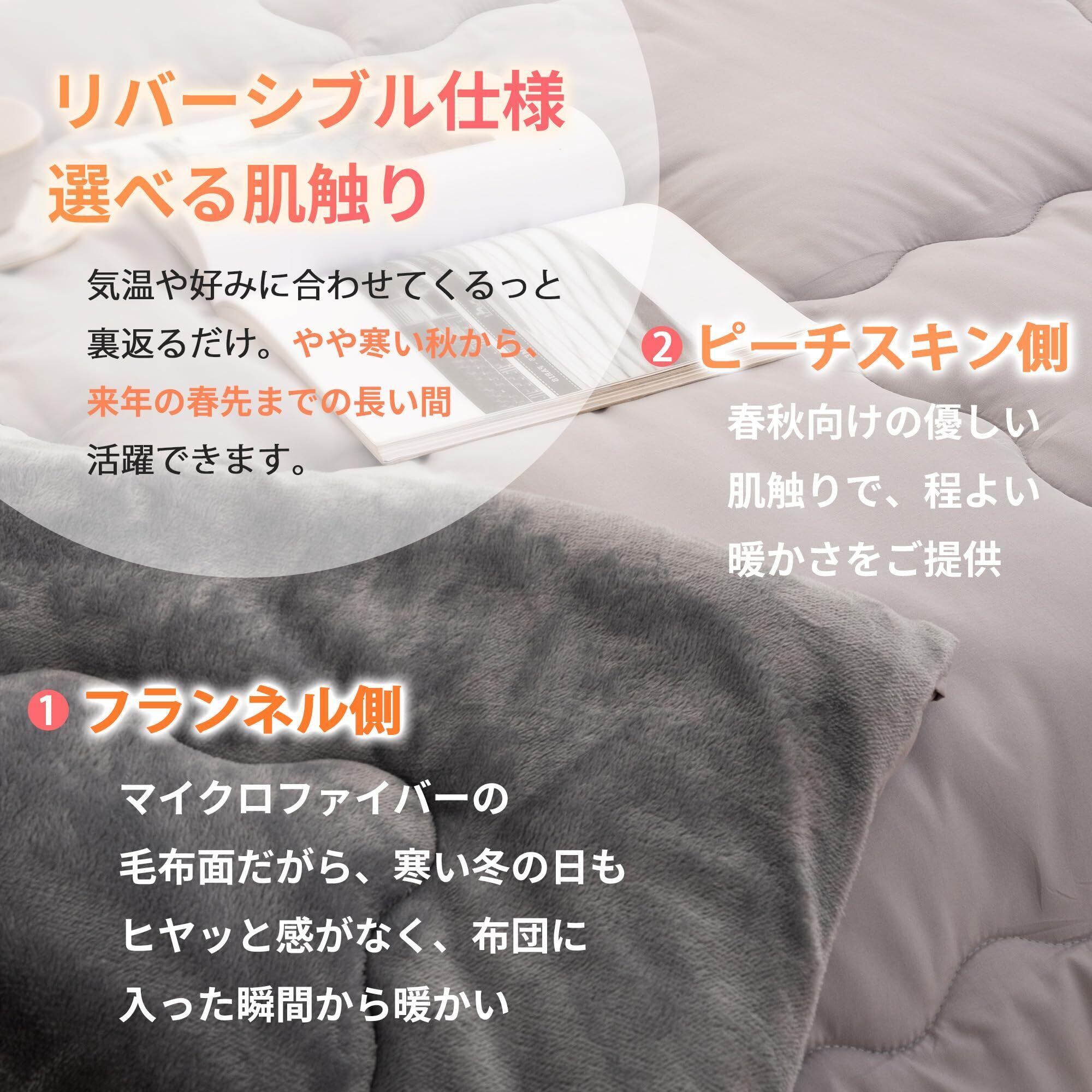 【両面使いデザイン】年中長く使えられるように、COZYNOVAの かけぶとん は「両面使いデザイン」を採用しています。寒い冬には保温性の高いフランネル生地を裏側にして、また肌寒い秋や春にはピーチスキン生地を裏側にして使用することで、この一枚で秋から春までの長い期間、快適にご使用いただけます。