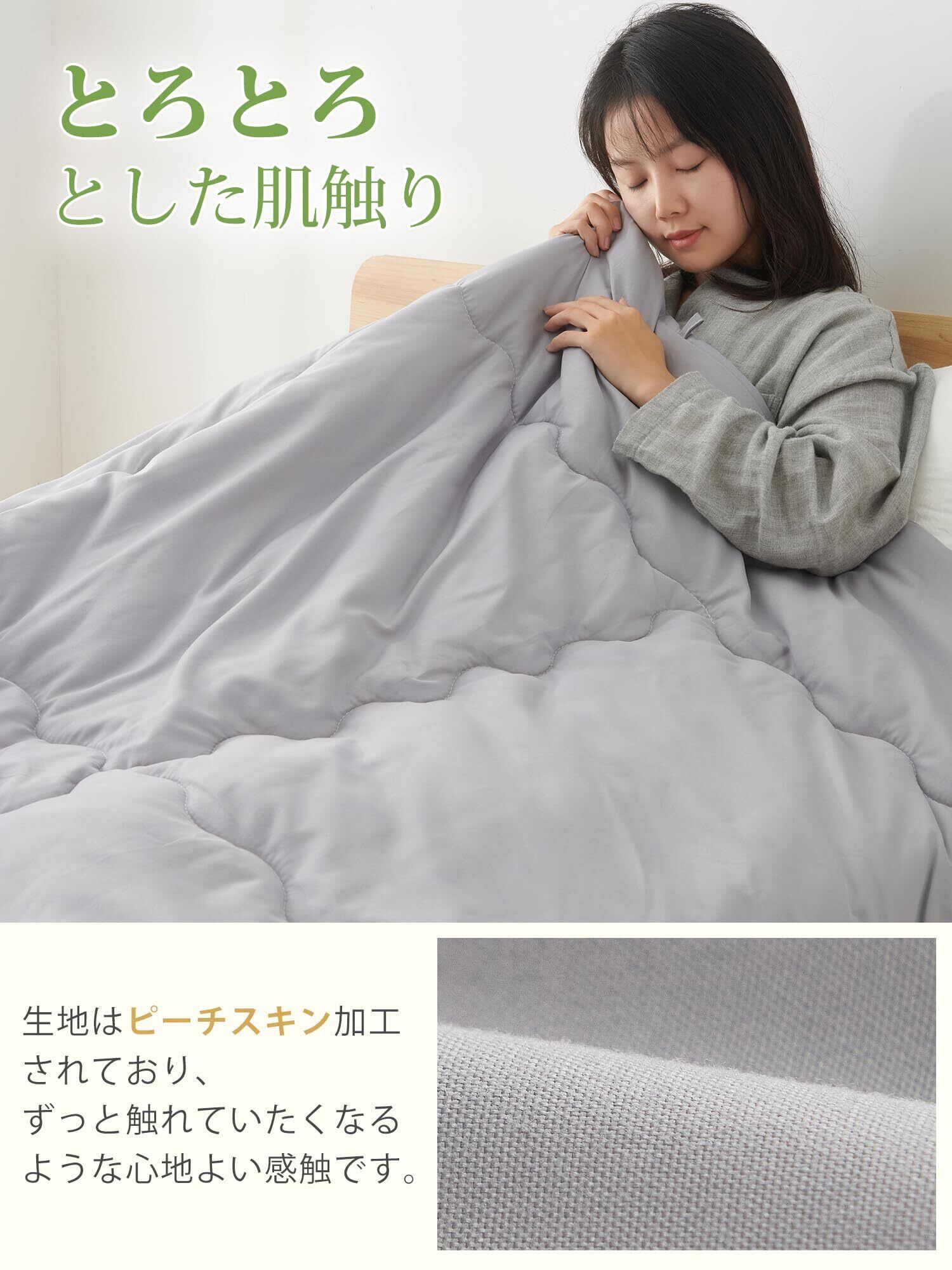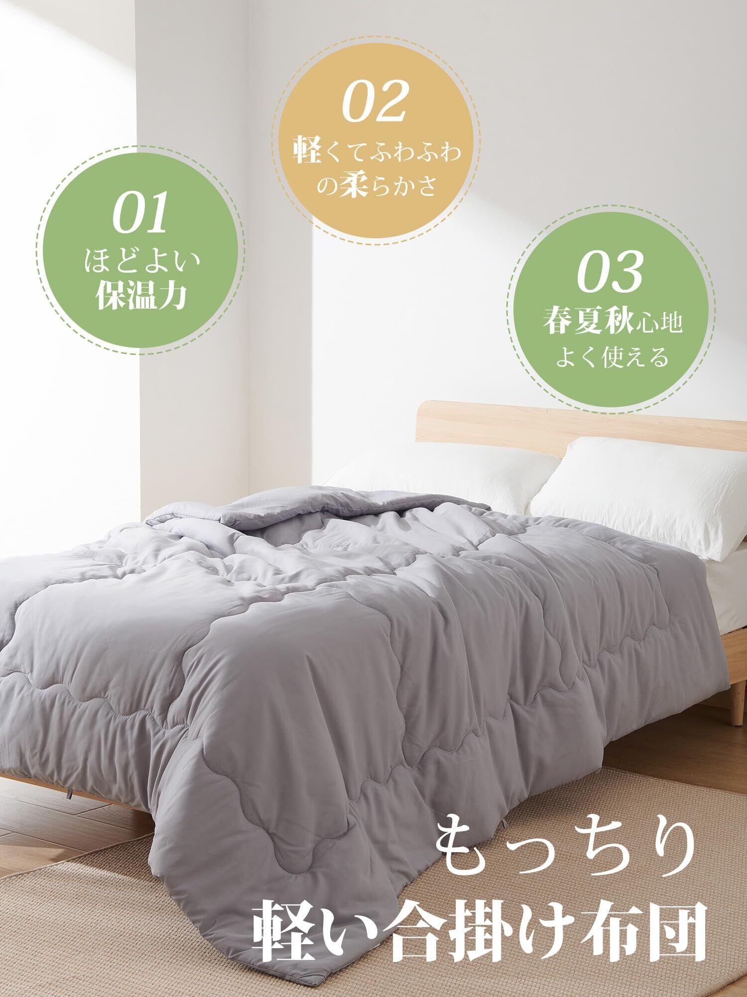 【軽くてふわふわ】わた量を通常の掛け布団の半分ほどにすることで、ふわっと軽くて体への負担を感じさせないです。適度に保温性があり、春から初秋にぴったりのアイテムです。
