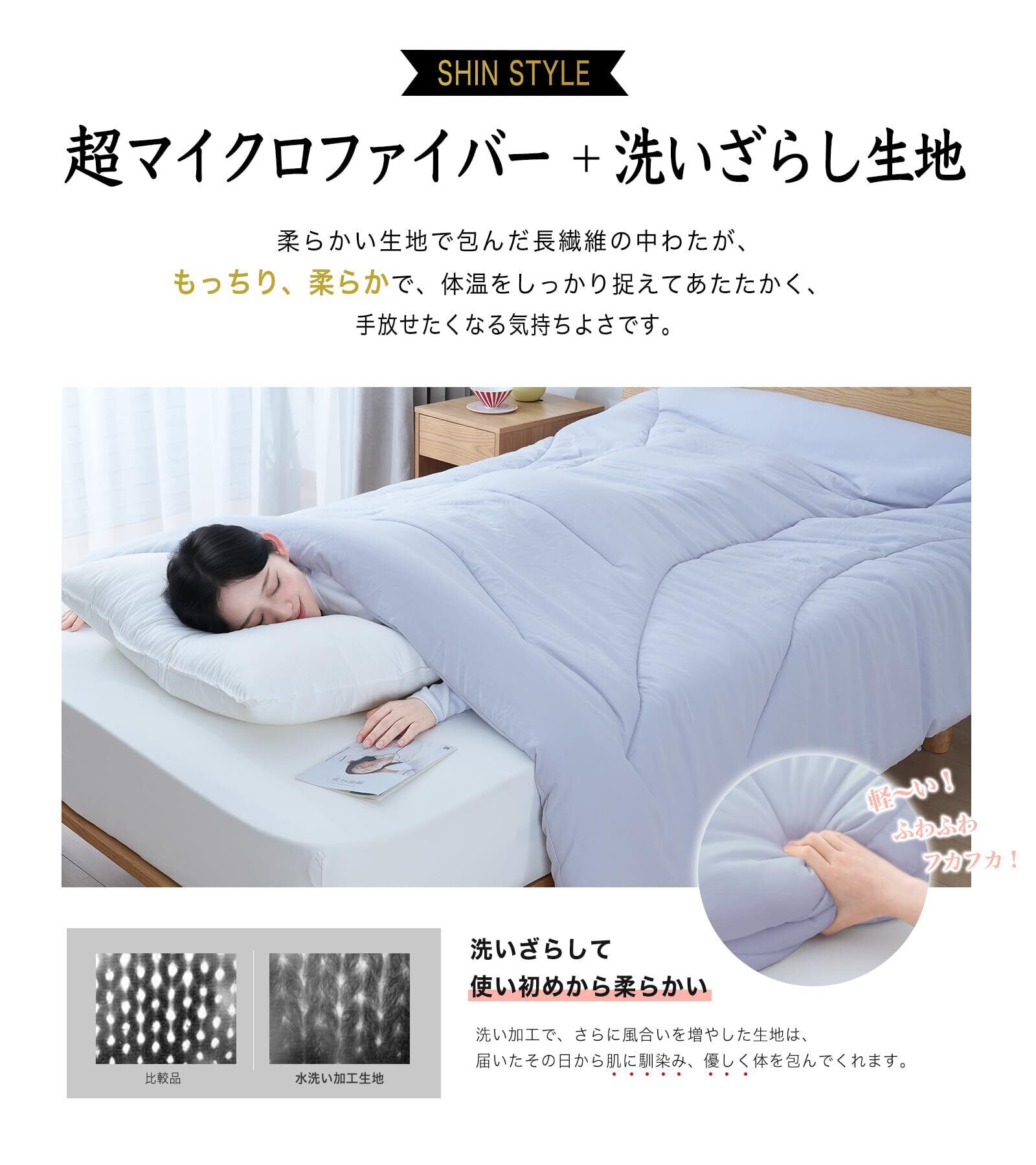 【やわらか~い!もちもちかけ布団】①中わたは超マイクロファイバーの長繊維をたっぷり使用、中わたが片寄らず、何度洗っても乾けばふわふわ感が長続き。気軽に丸洗いしていただけます。②洗い加工で、さらに風合いを増やした側生地は、届いたその日から肌に馴染み、優しく体を包んでくれます。水洗い加工の生地で包んだ長繊維の中わたが、もっちり、柔らかで、寒い冬の夜は、もこもこであったか掛け布団をぎゅっと抱きしめて、心も肌も満たされる、極上のぬくもりをご体験ください。