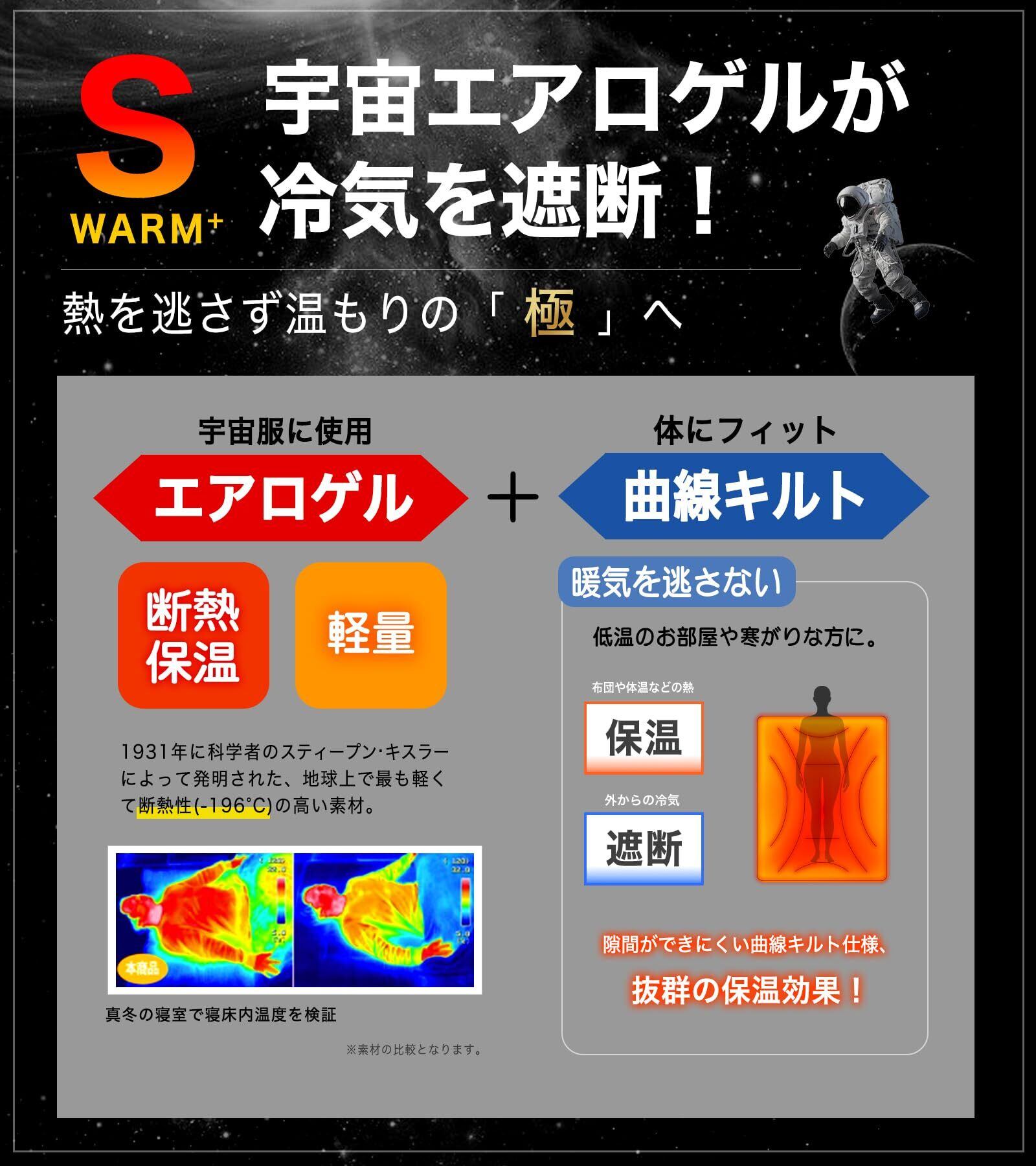 【-196℃を断熱するNASAの宇宙服素材「エアロゲル」×曲線キルト仕様】①宇宙服にも使用されている最先端素材「エアロゲル」は、厚さわずか2mmで-196℃の極寒を遮断できる、世界で最も軽く、密度の低い断熱素材です。その高い性能を最大限に活かすため、3Dプリンターによる精密成型を実現。さらに、濡らして干す洗濯を100回繰り返しても、購入当初のような驚異の断熱性を保ち続けます。②「フィットキルト」ふとんは体の形に寄り添うキルトで、隙間から冷気が入りにくいように設計された特殊なキルティングです。身体の幅に沿った設計のため、掛布団の襟元やふとん四隅から冷気をシャットダウン。また寝ている間に掛け布団がずれにくいため暖かい空気を逃さず、保温効果が抜群です。