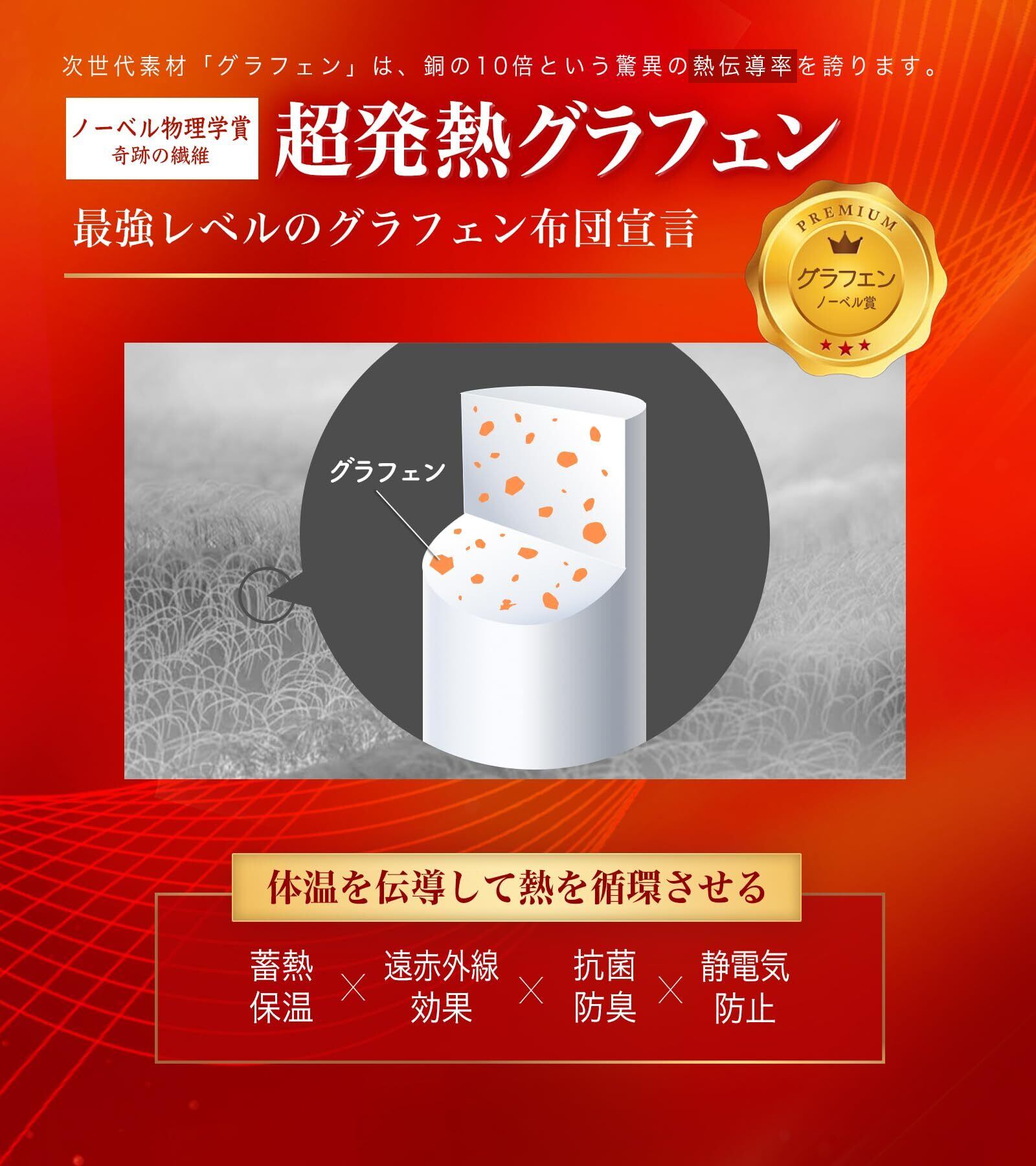 【ノーベル賞受賞熱伝導性No.1素材×吸湿発熱素材かけ布団】遠赤外線効果と吸湿発熱のWパワーで、体の芯までしっかり暖める!①ノーベル物理学賞を受賞した次世代素材「グラフェン」は、銅の10倍という驚異の熱伝導率を誇ります。その遠赤外線効果により、まるで肌と一体化するように体にしっかり馴染み、深部からじんわりと暖めてくれます。②さらに、吸湿発熱素材の最高峰「アクリレート」を組み合わせ、身体から発せられる水分を活用しながら、【吸湿→発熱→再吸湿→再発熱】というサイクルを繰り返し、繊維そのものが発熱。まるで「呼吸する暖かい掛け布団」のように暖かさを生み出します。このWの熱源効果により、驚愕の【保温率93%×CLo値8.5】を実現した、まさに次世代の超発熱冬用掛け布団です!
