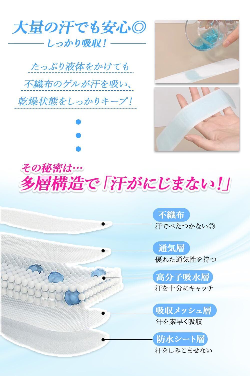 【肌にやさしい&驚きの吸収力】 敏感肌でも安心!ふんわり不織布+通気性のある3層構造。 中の「高分子吸収材(SAP)」が汗を瞬時に吸収&しっかり閉じ込めて、ムレ知らずの快適さをキープ。 防水シート付きだから、衣類に汗が染み出す心配もナシ!