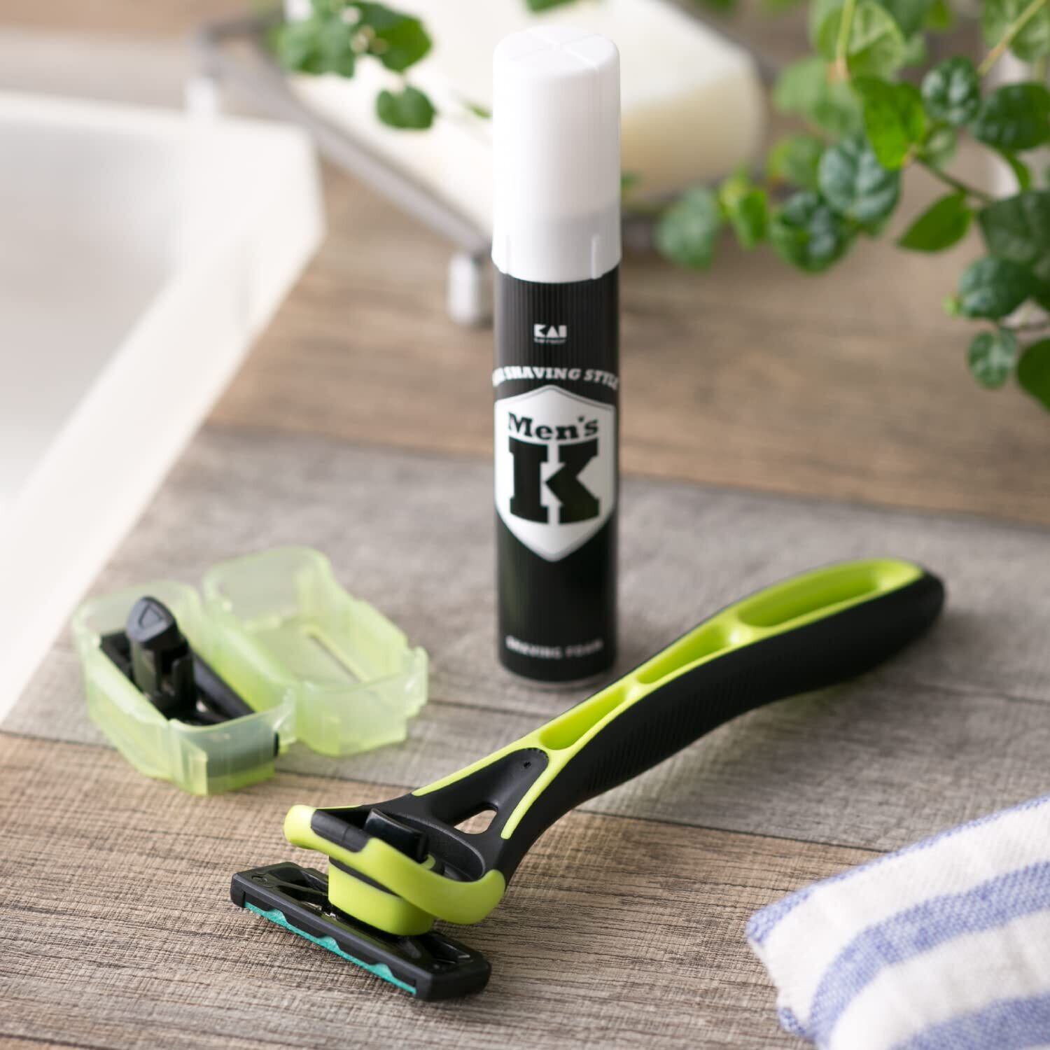 替刃2個付のホルダーに加え、ミニサイズのMen's K シェービングフォーム30gがついた持ち運びに便利なビニールケースに入ったセットです。