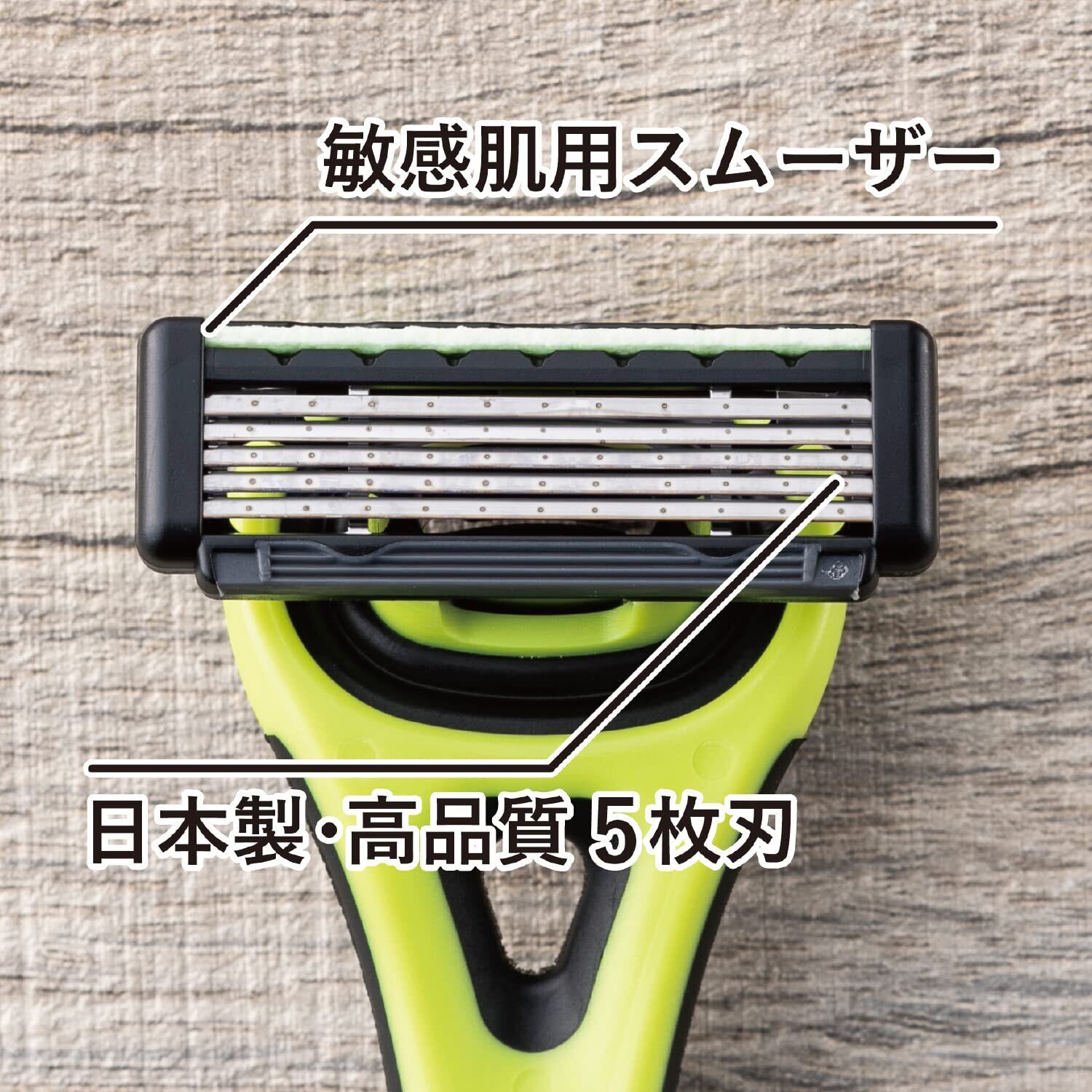 敏感肌にも対応する仕様に優れた切れ味を持ちながら、肌への優しさを兼ね備えているのもこだわりです。上部には敏感肌向けにパッチテストをクリアした、セラミドやアロエ、ビタミンE配合のスムーザーを使用。